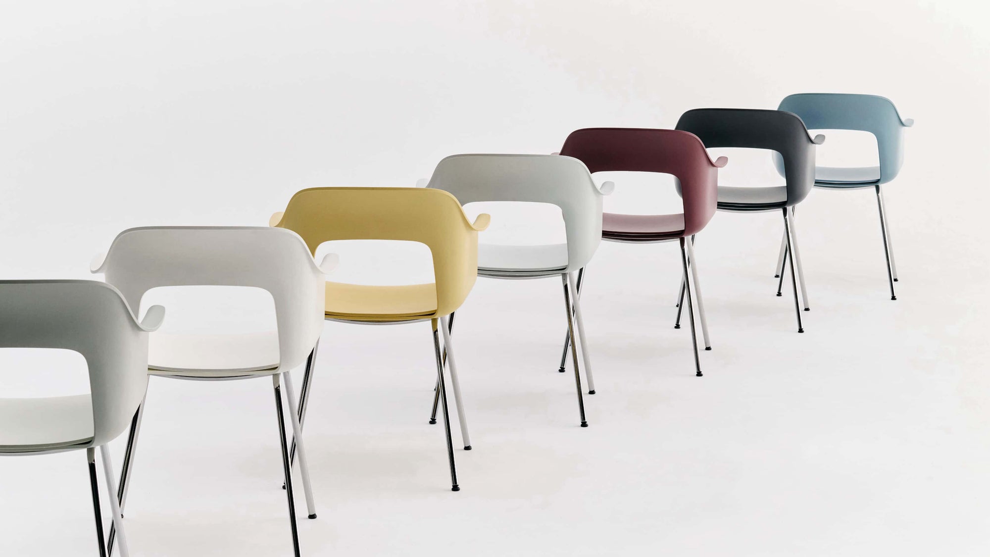 post-consumer recycled plastic and offered in a variety of colours, which can be combined with different seat options or a fully upholstered seat for added comfort, making Layout a versatile and durable seating solution ideal for offices, restaurants, public institutions, and domestic settings.