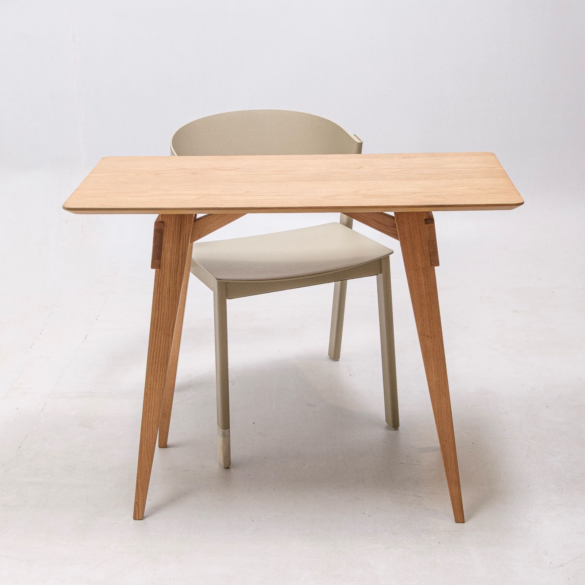 - Trestles in stained solid wood, tabletop in oak veneered MDF.