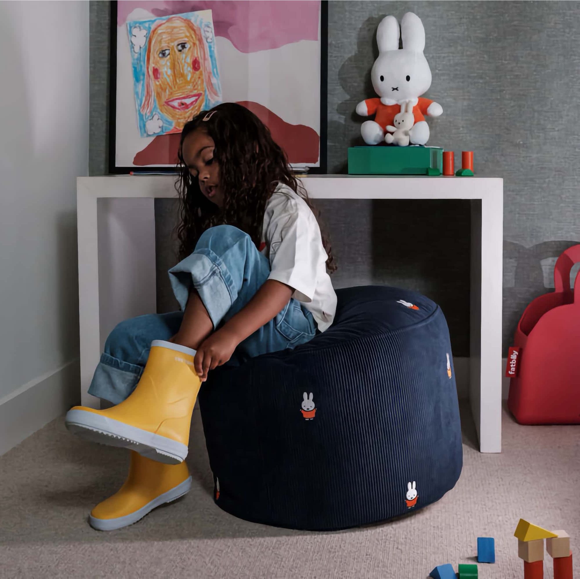 The Point Recycled Cord x Miffy pouf – from the unique Fatboy x Miffy capsule collection – is an eye-catcher with a playful twist. This dark blue pouf with soft corduroy cover is made of recycled polyester and filled with airy EPS balls. The detailed Miffy embroidery gives it a cuddly and refined character. Lightweight, sturdy inside and multifunctional in use: as a seat, footrest or side table. For young and old, in every room.