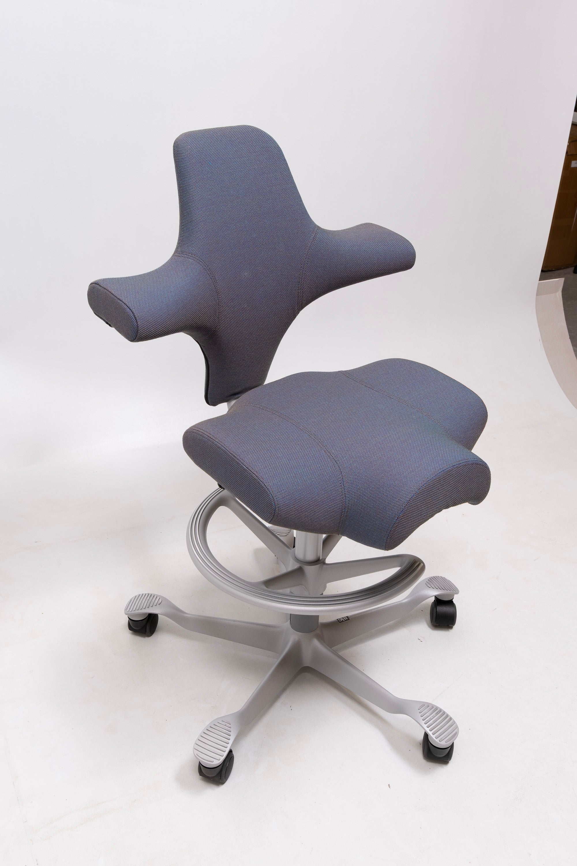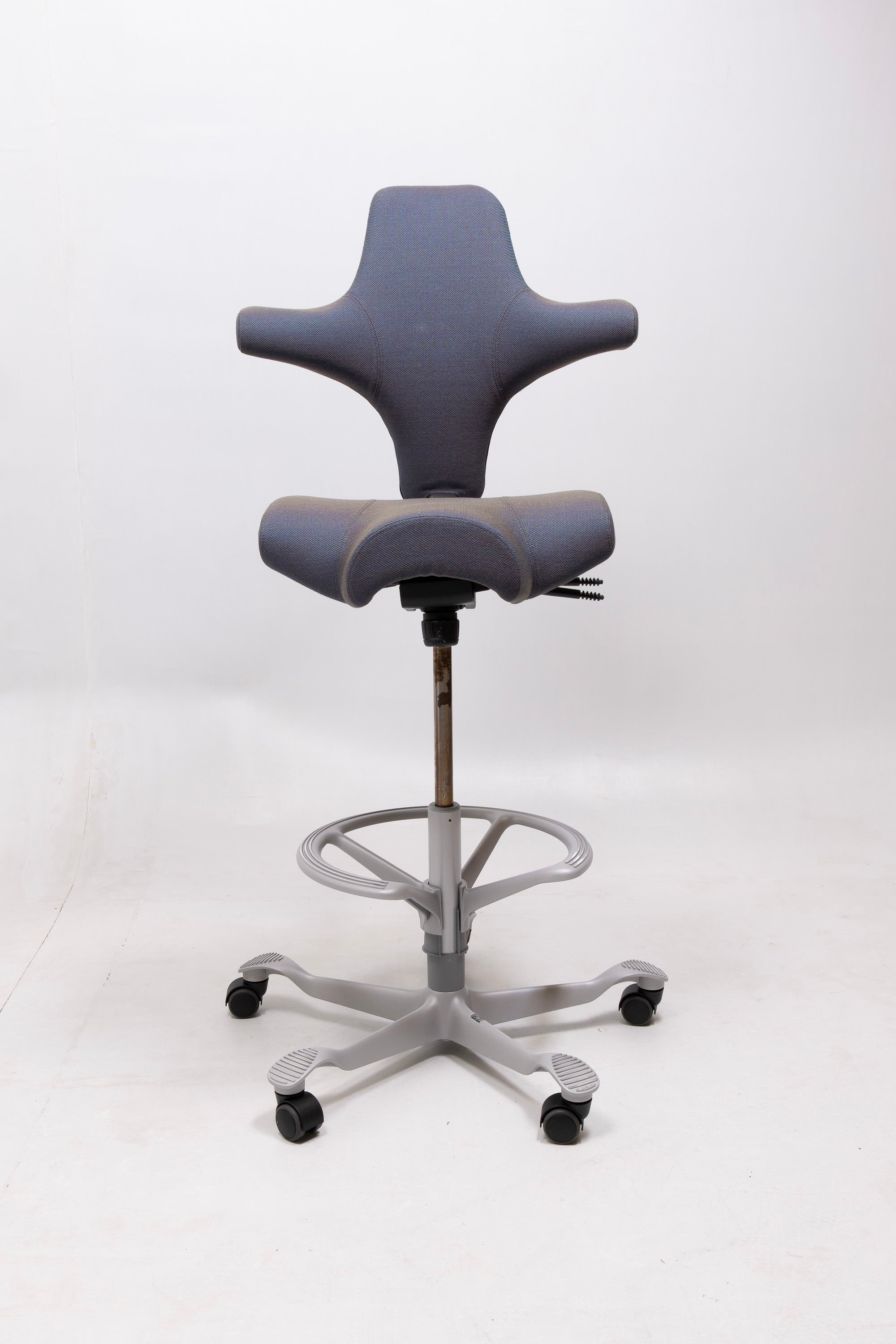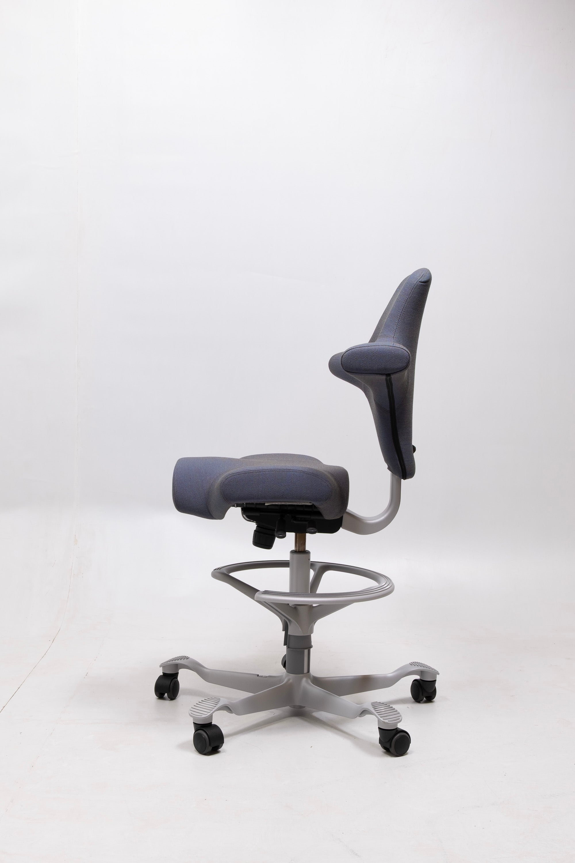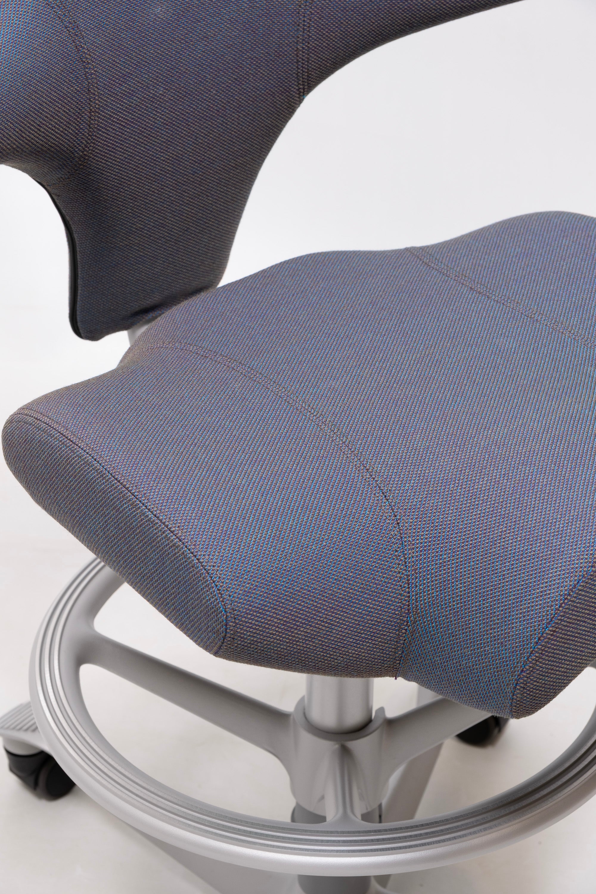 HAG Capisco is inspired by the horseman's saddle and sitting posture. No one sits as actively as a rider in the saddle. When you work seated on a HAG Capisco, you'll be inspired to greater freedom of movement, variation, and new natural sitting positions. Allowing you to sit as high or low as you want. No other work chair is so well adapted to work surfaces of different heights. The Capisco office chair allows you to sit down and adjust it from a normal table height to semi-standing position.