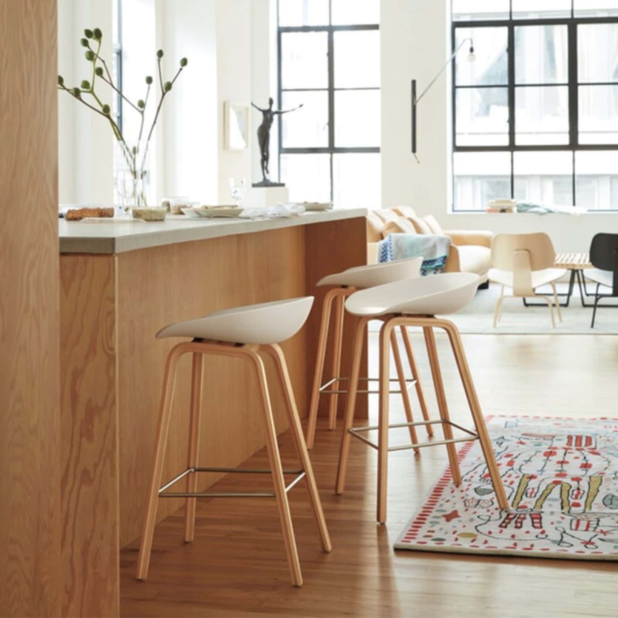 The bar stool About A Stool AAS 32 has the same capacity for transformation as the other designs in the series, ranging from a minimalistic plastic stool to a more full-bodied upholstered version. With a curved backrest and long, elegant wooden legs, it enjoys a simple yet strong visual presence that makes it ideal as a bar stool in a public environment, as well as for informal meetings and meals. Available in two heights and in a range of wood finishes and colours.