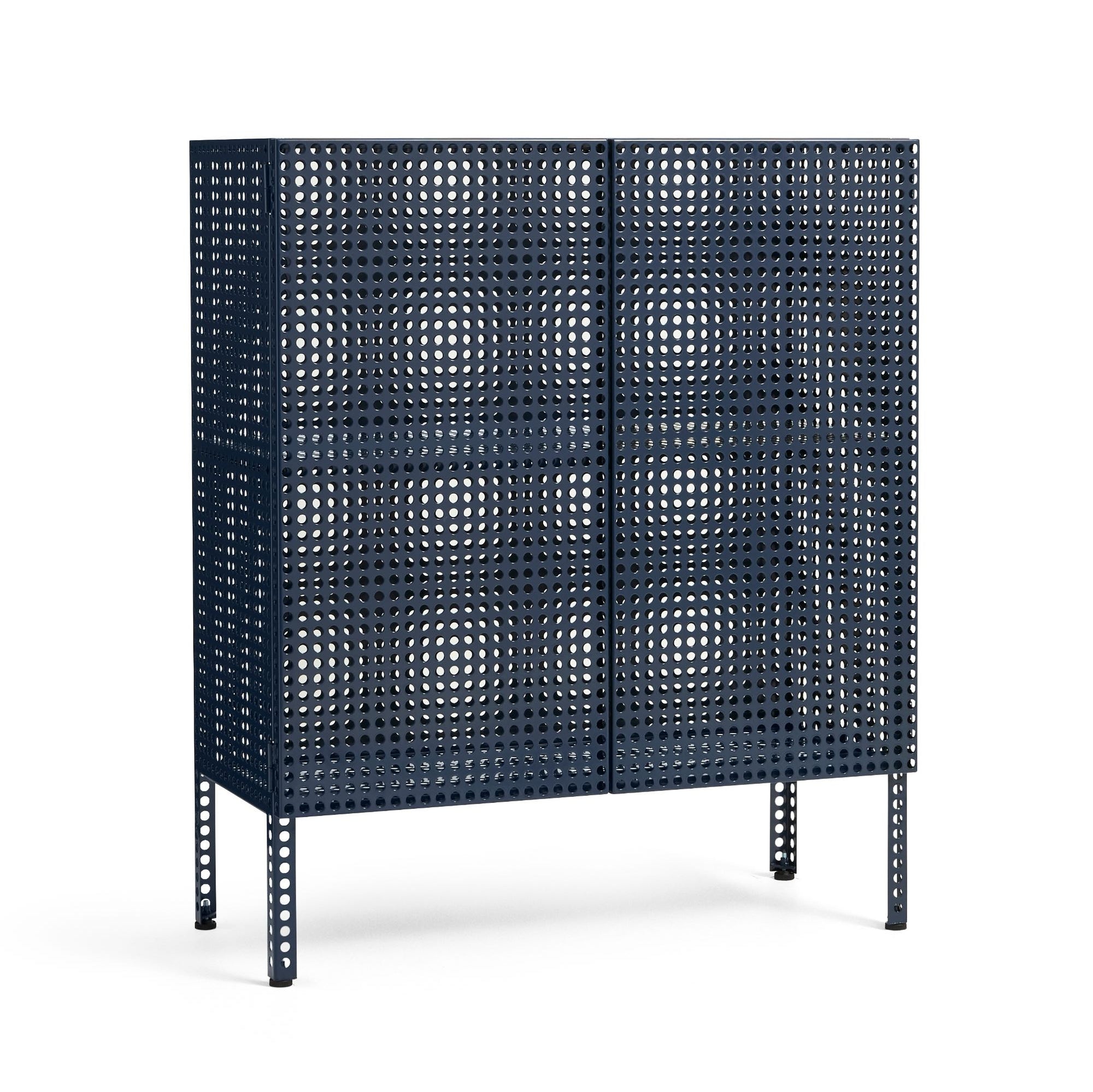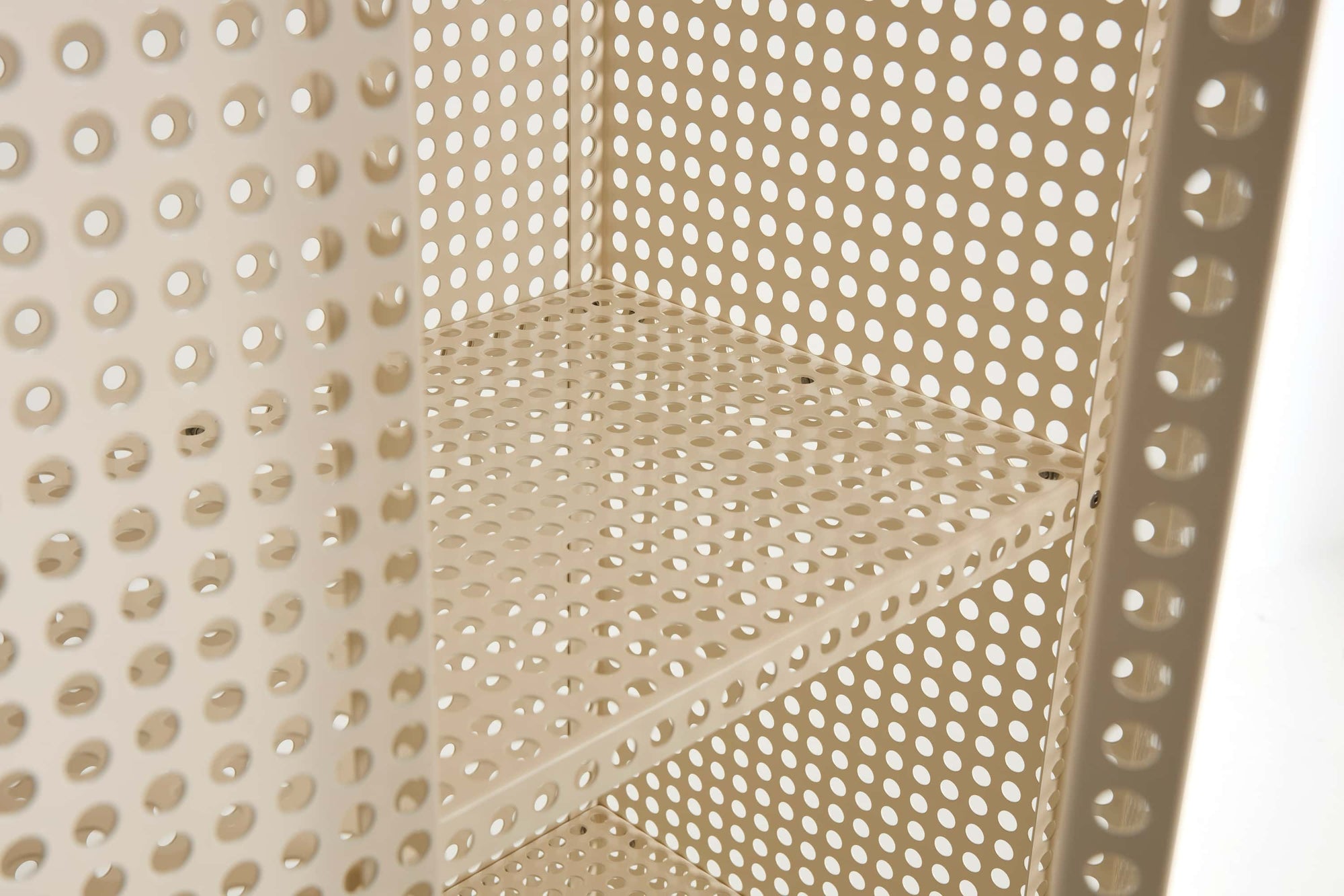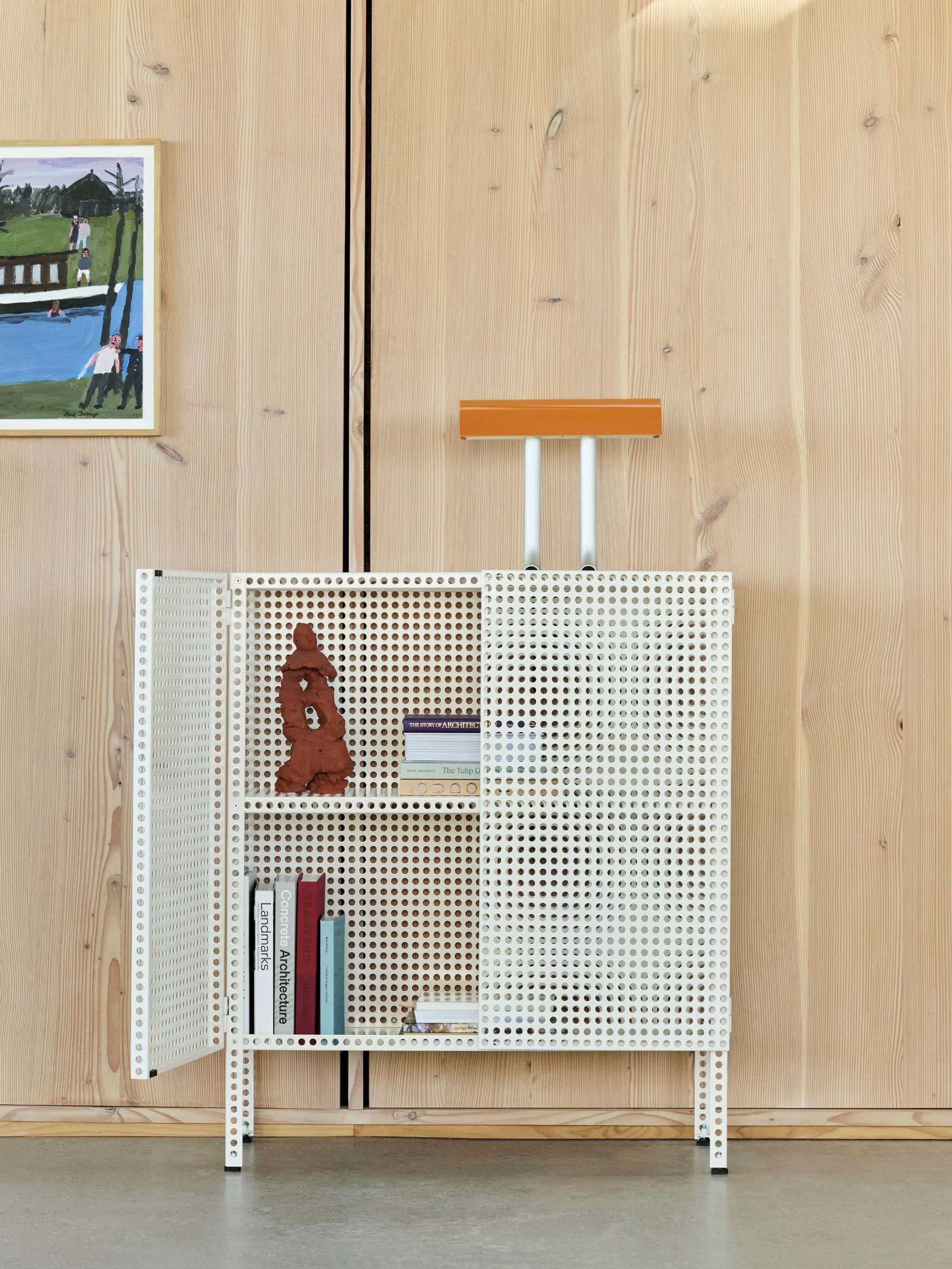 Defined by Muller Van Severen’s characteristic use of colour, form, and function, the Perforated Cabinet is a series of storage units that blend utility with bold aesthetics. The semi-transparent holes subtly conceal the contents while maintaining a sense of organisation. Available as wall-hanging and floor-standing variants, both featuring a magnetic door closure, they offer a practical and visually appealing solution for arranging and storing objects. Crafted in powder-coated steel, the cabinets come in different sizes and colours, providing a versatile storage solution for a wide range of domestic and public environments.