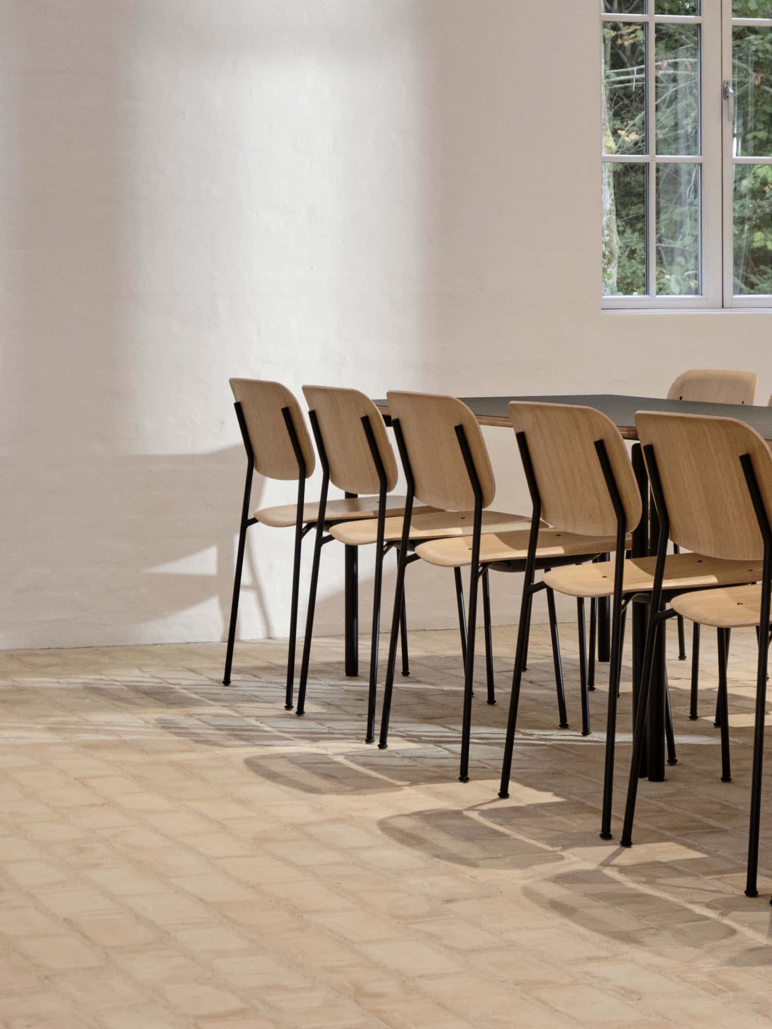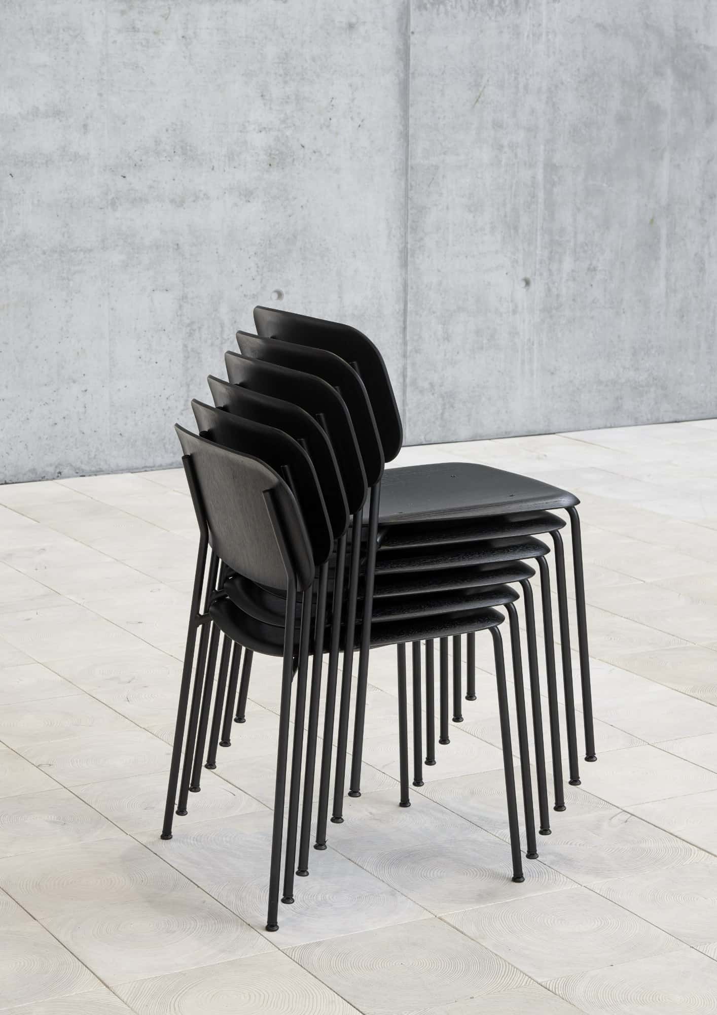 Material: Seat and back in moulded plywood, top veneer in oak. Frame in Ø16 mm steel tube.