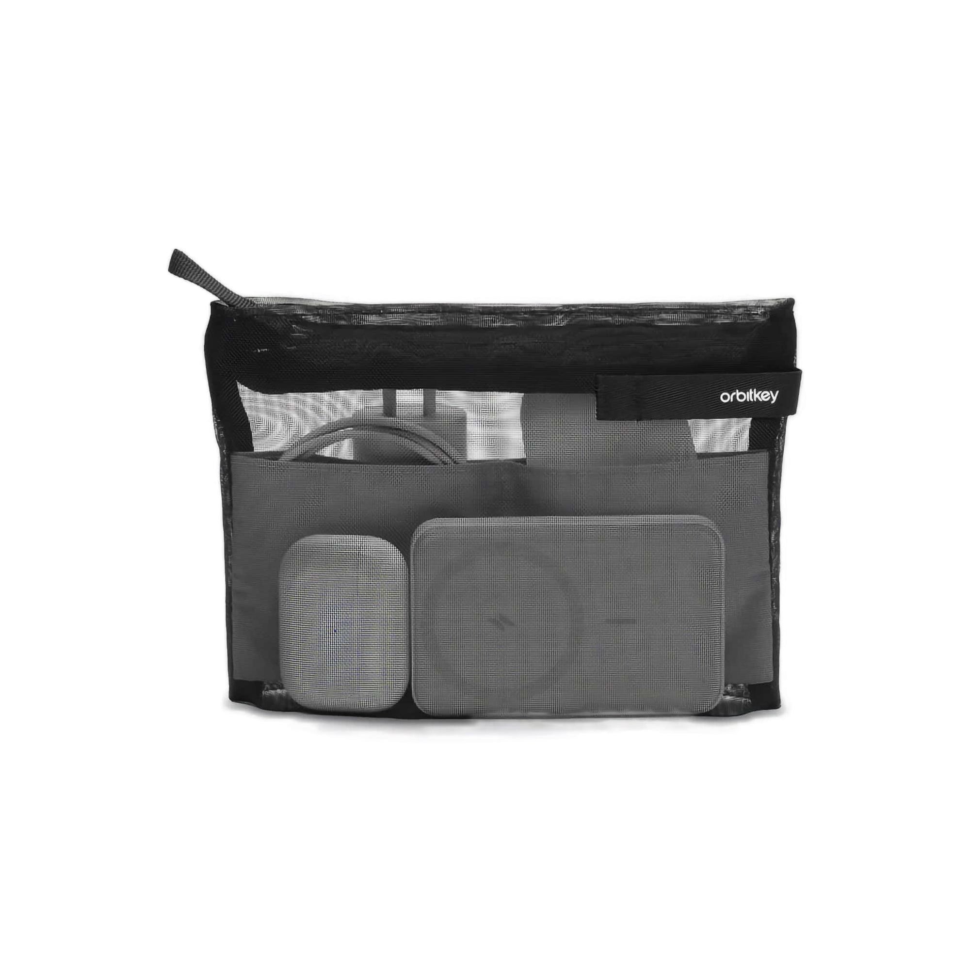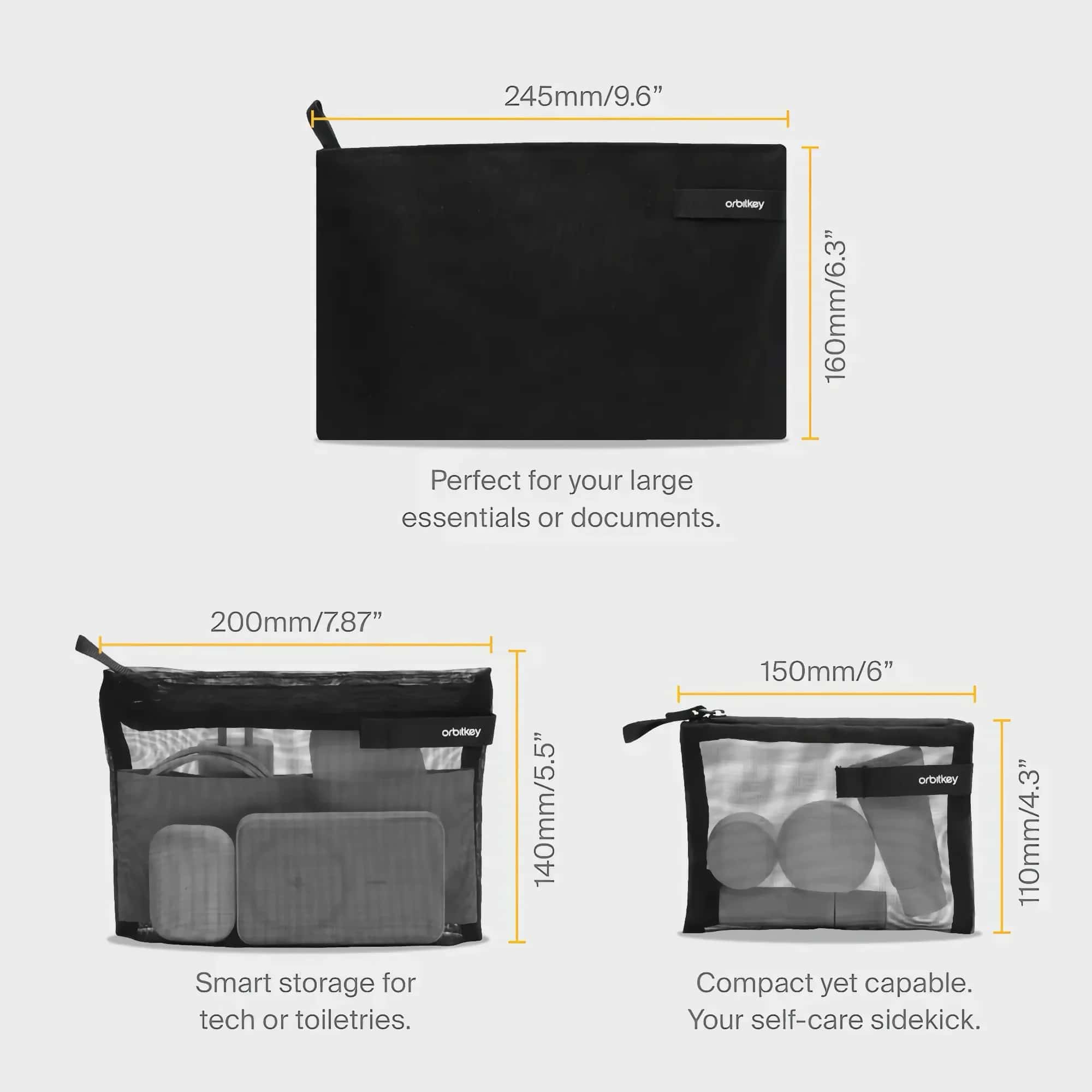 A set of three minimalist pouches for versatile organization. Designed to store tech, travel essentials, and personal items, each pouch features a floating divider for adjustable storage and quick-access grab handles for effortless transitions.