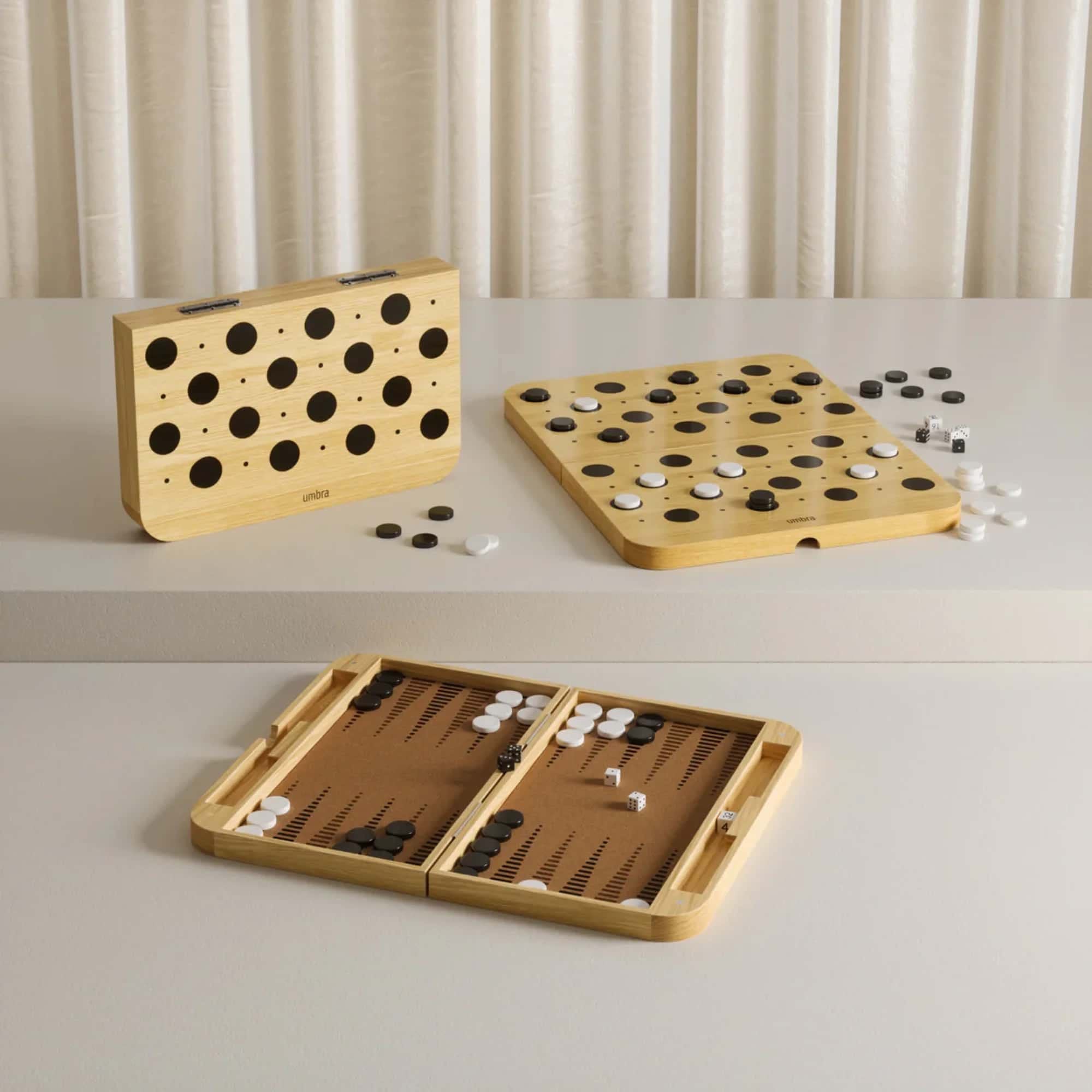 Blitz Backgammon combines two classic games - checkers and backgammon - in one sleek, modern design. Inspired by the soft curves of Umbra’s Bellwood collection, Blitz folds neatly in half for easy storage, portability, or display when not in use. Open it up to reveal a printed checkerboard on warm ashwood, with a soft cork interior for a tactile backgammon experience. Complete with five dice and 32 glossy playing pieces, Blitz offers everything you need for game night in one thoughtfully designed set. Measures 14.7” x 19” x 2” (5.78 x 7.4 x 0.78 cm).