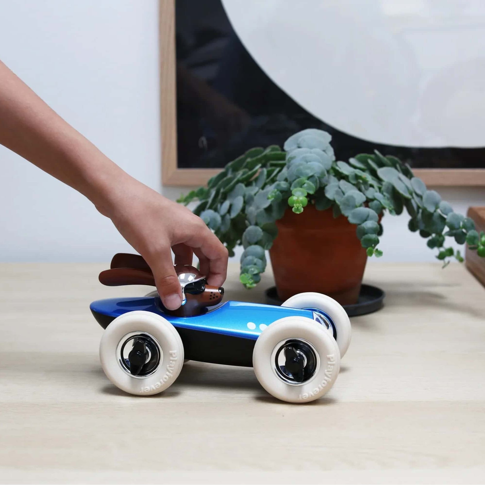 Grrrrreat fun is to to be had with the Rufus range of midi cars from  layforever. Patrick is a pooch who loves fast cars, so of course, red is the only colour he wants to be driving! His long ears make him look like he is flying past on the white rubber tyres of his red and black racer with his chrome helmet and rims gleaming. The original Rufus was specially designed in the UK for Hugo Boss and then expanded into it's own range under the Playforever banner. Rufus Midi's are made from heavy duty plastic and solidly constructed in chic nostalgic styles to look just as good on the shelf as they do at play.