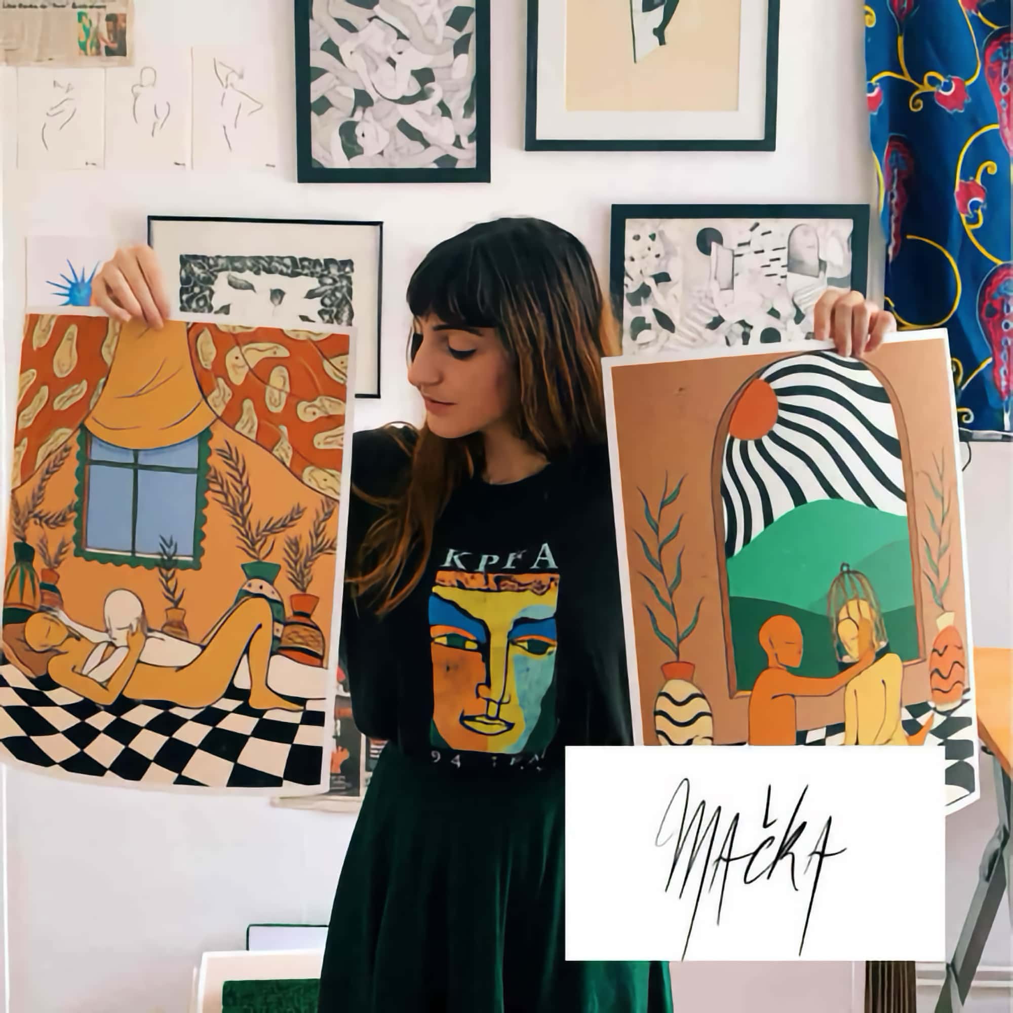 Each apron features an illustration by contemporary French artists printed in very high definition: Lucia Calfapietra, an artist from Marseille, Piment Martin, an artist from Lyon, Thomas Lateur, an artist from Lyon, Chloé Weinfeld, an artist from Lyon, Chacha Pop, an artist from Lyon and Léna Macka, an artist from Lyon.