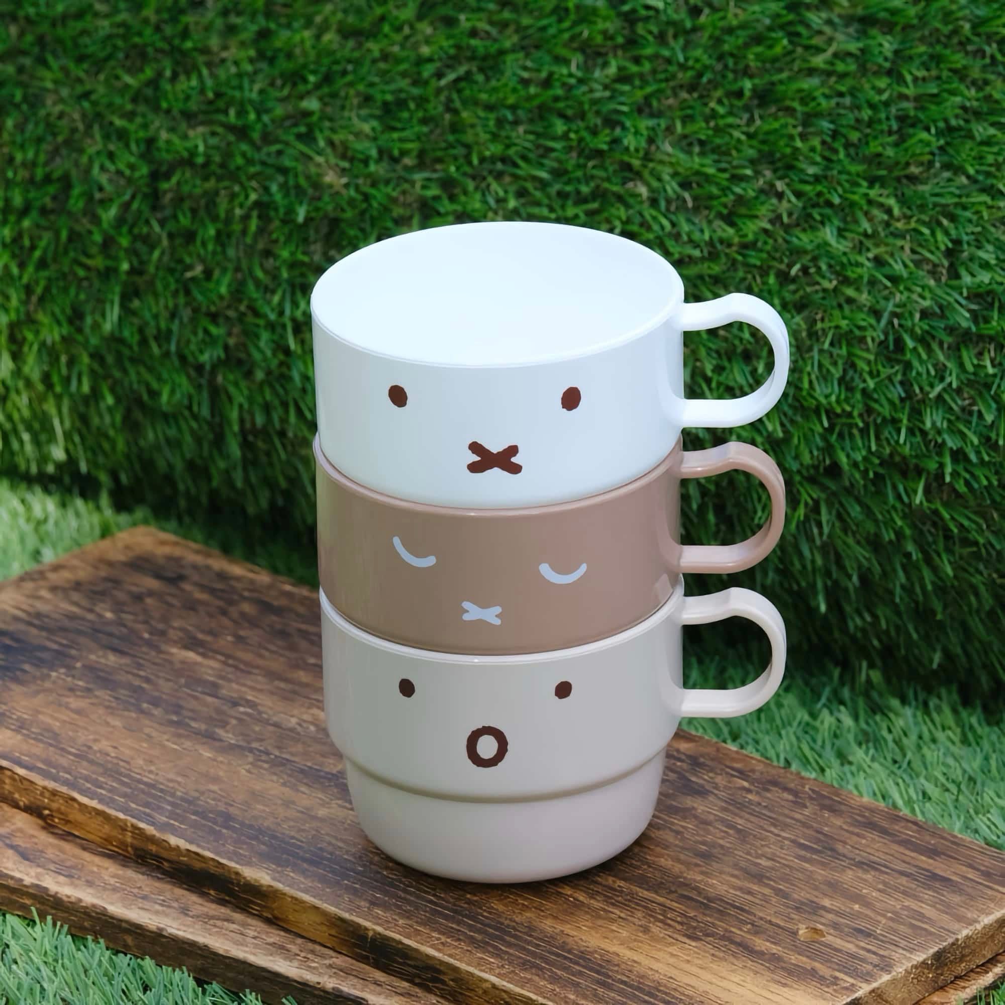 This is a plastic cup from the very popular simple and cute Miffy Face Lunch Series. It comes in a set of 3 cups with different patterns, and can be stacked for easy storage. It can be used as a drinking cup for children, for brushing teeth, or as a portable cup for lunch boxes.