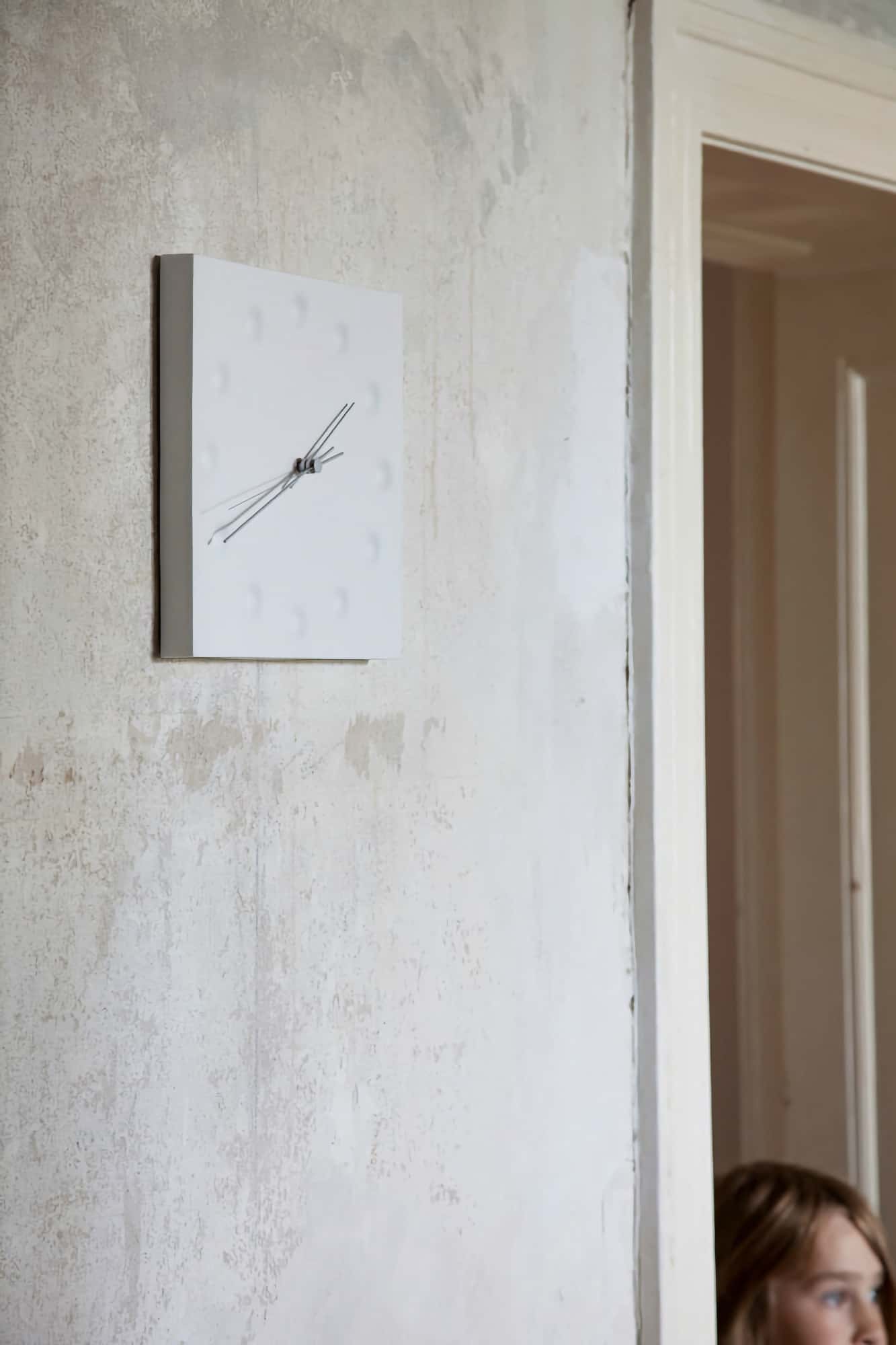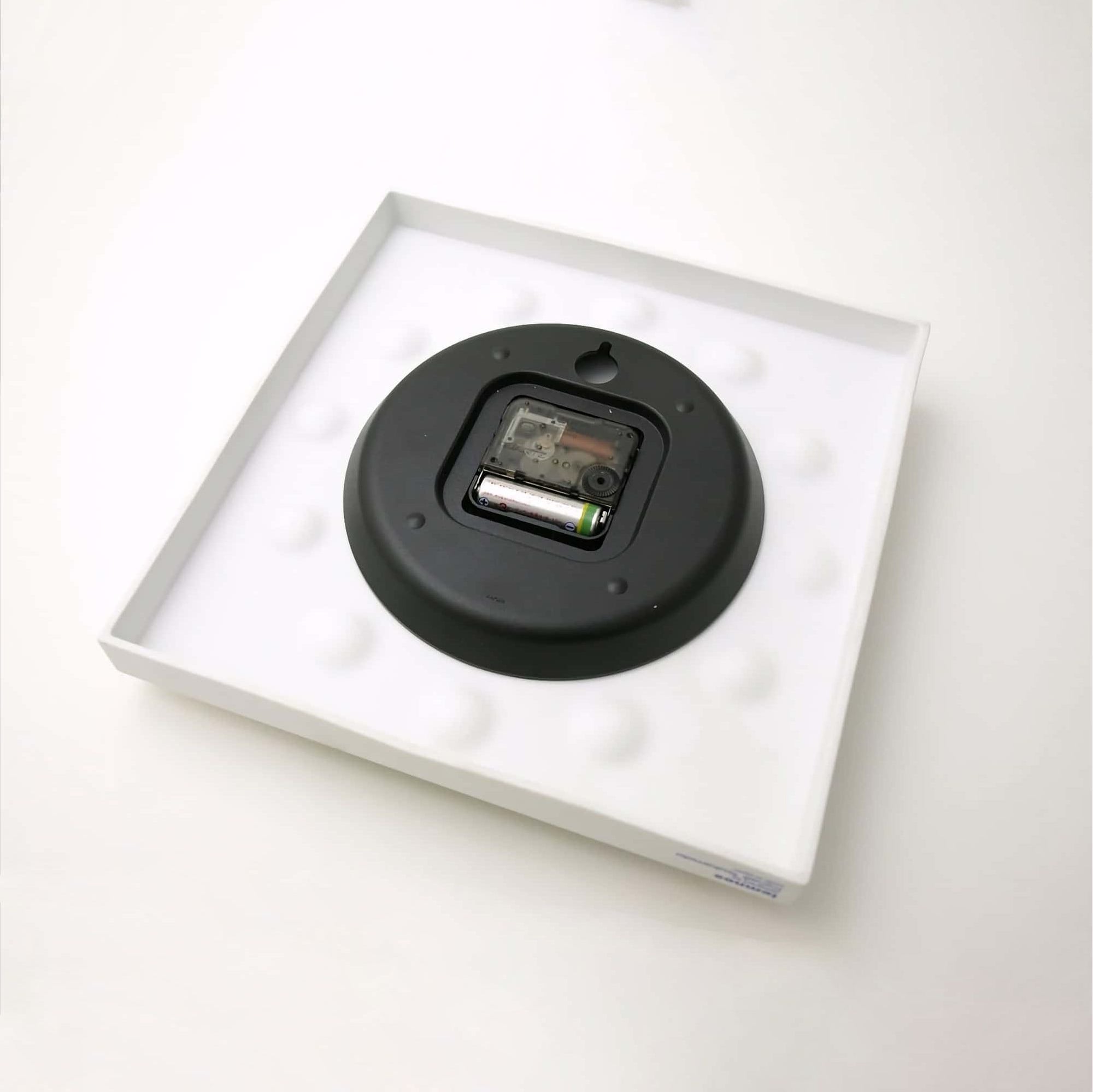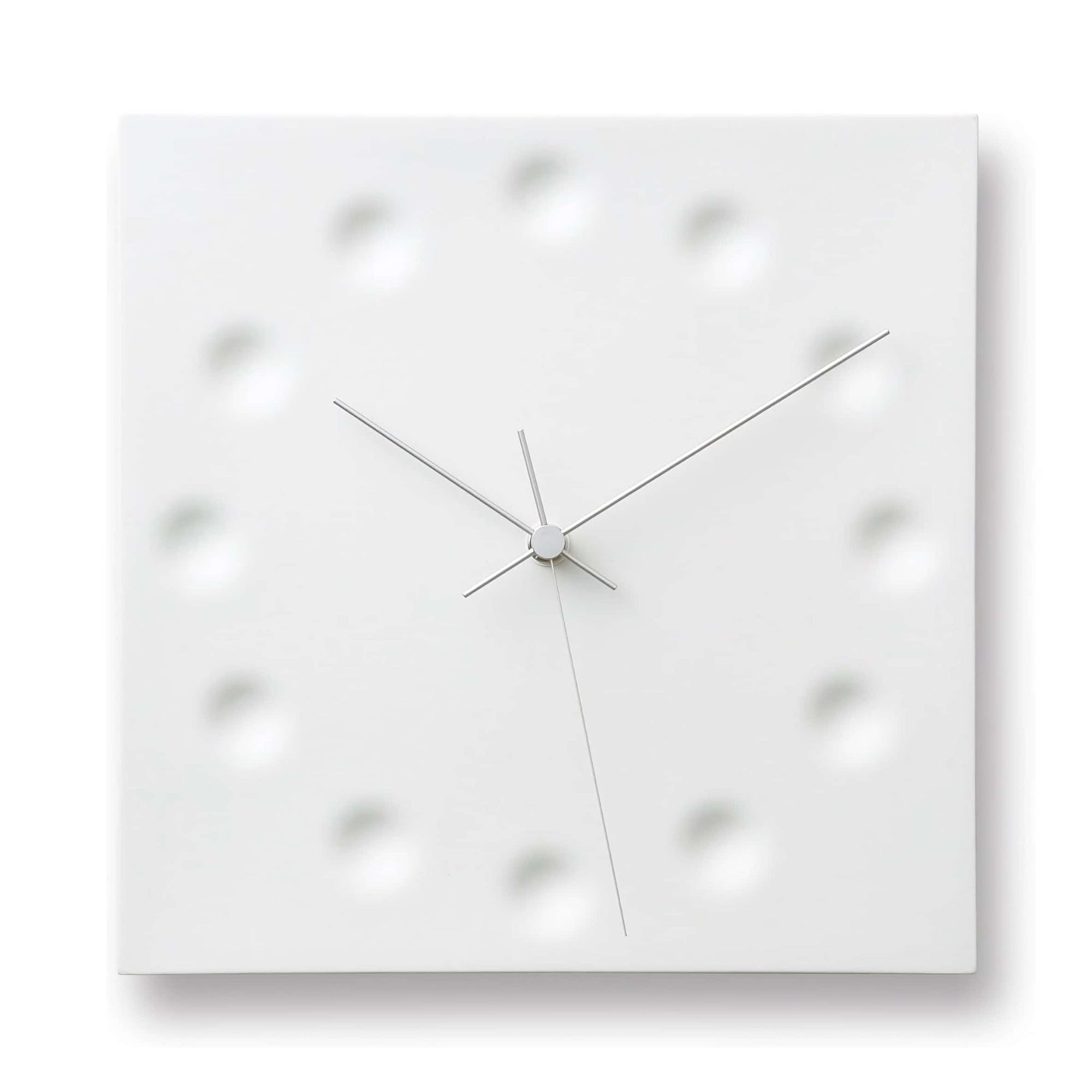This clock is inspired by the shapes that water droplets leave on the ground from the eaves of a building, a motif I once saw while sheltering from the rain. The soft shadows created by the gentle unevenness of the surface enhance its presence. The sharp, beautiful hands against the pure white matte porcelain texture create an elegant atmosphere.