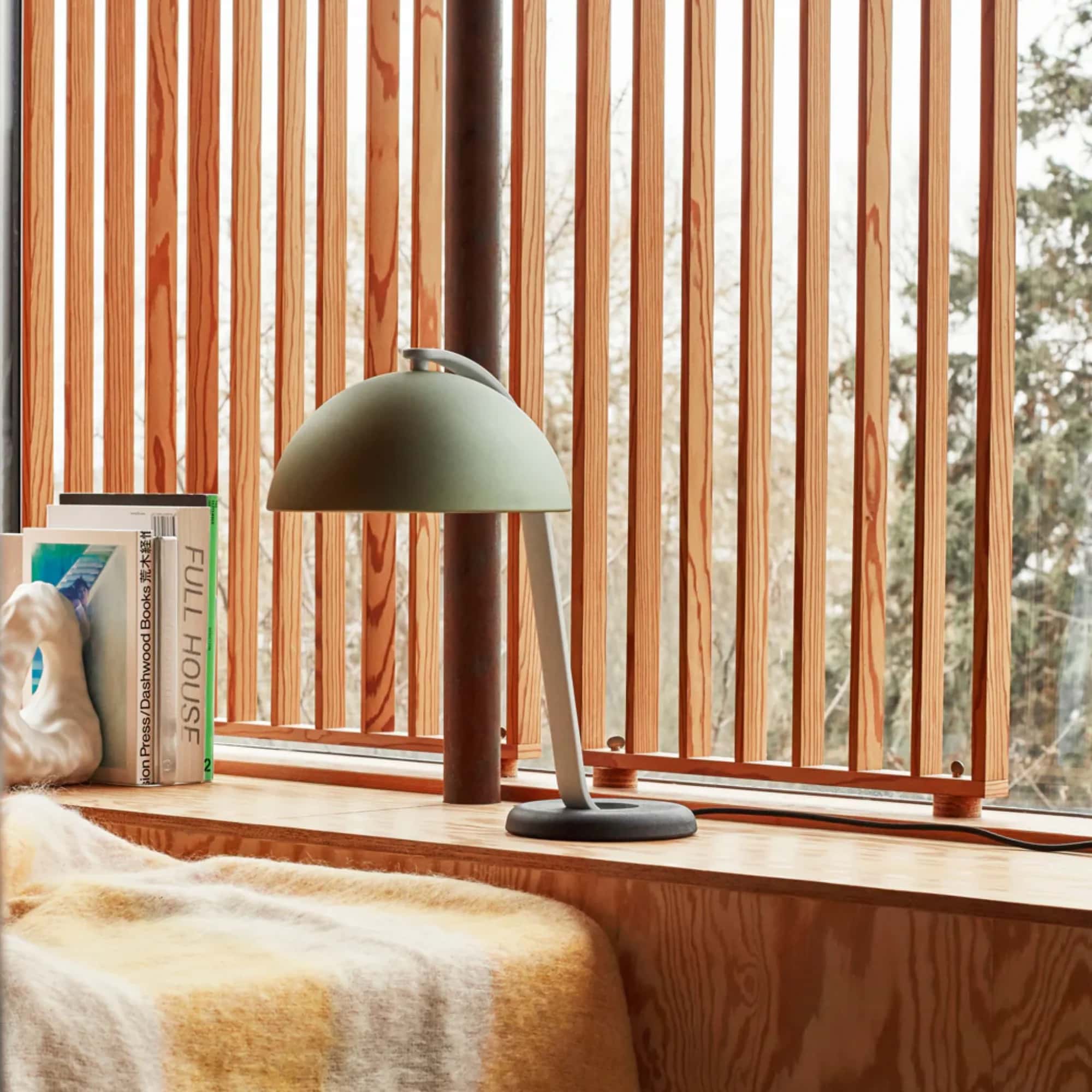 Cloche is a table top lamp providing a directional light. Its black powder coated arm and off-set cast iron base create a visual imbalance, resembling the suspension of a traditional dining cloche.