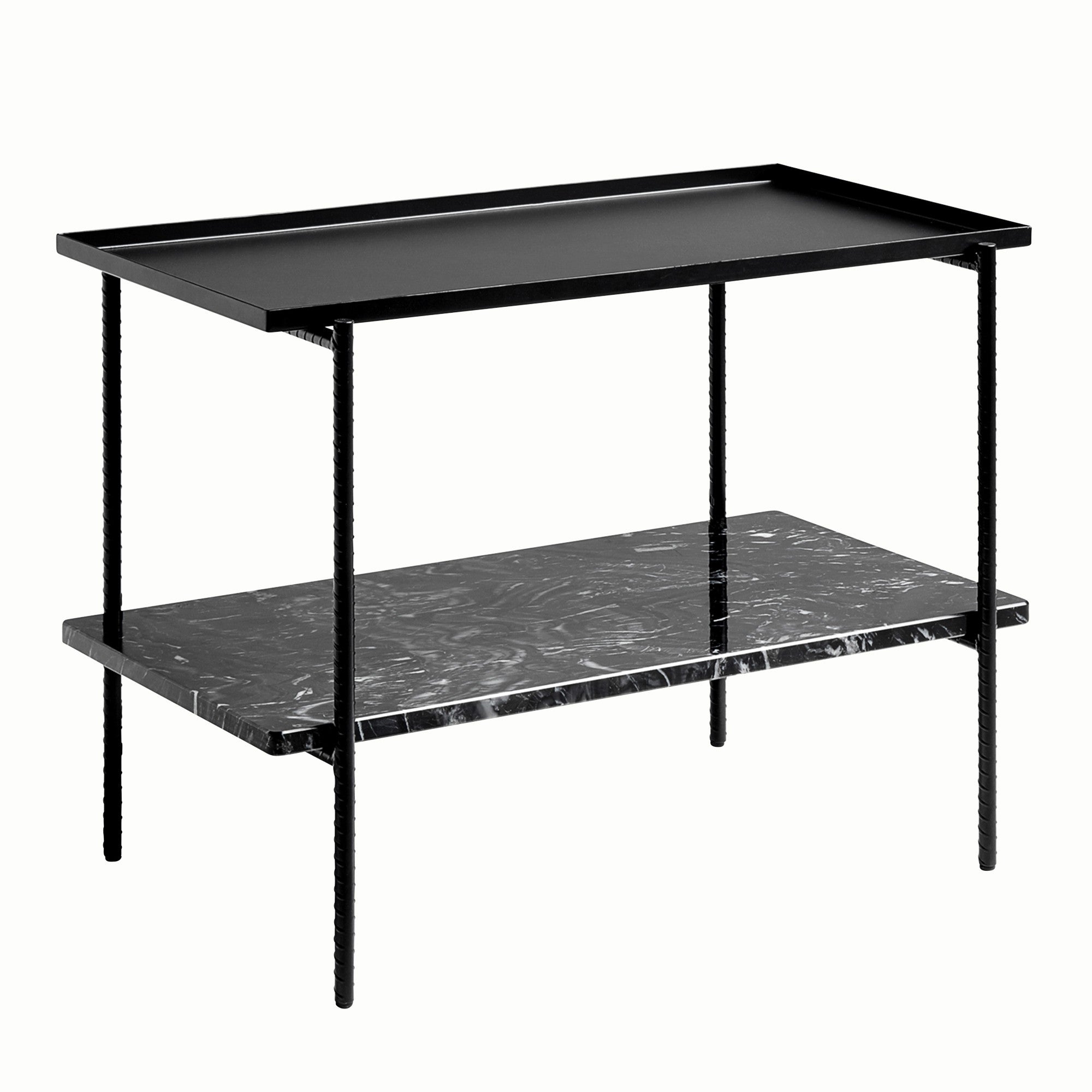 Material: 18 mm polished marble table top with chamfered edges. 2 mm powder coated steel tray top. 16mm anchor rebar fully welded frame.