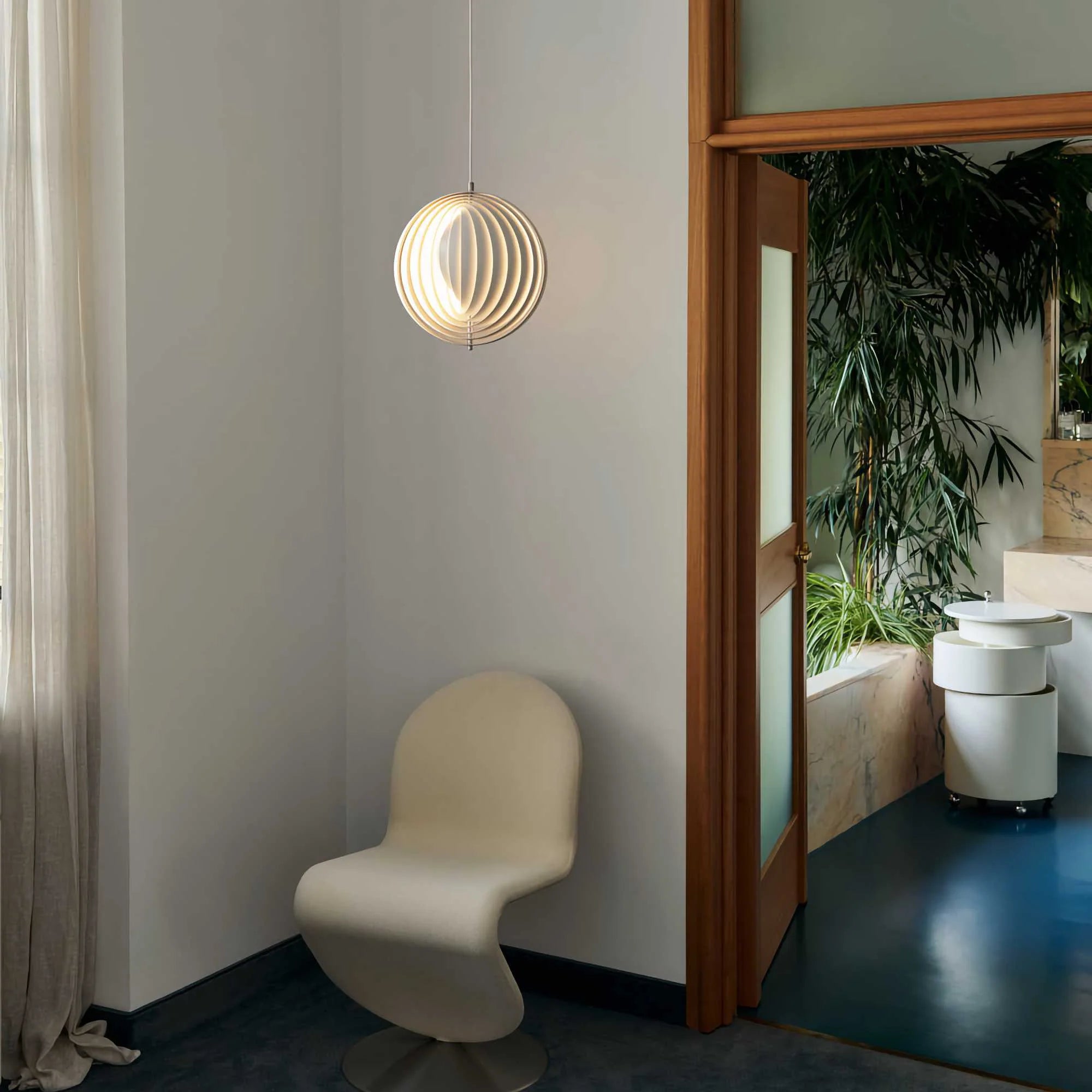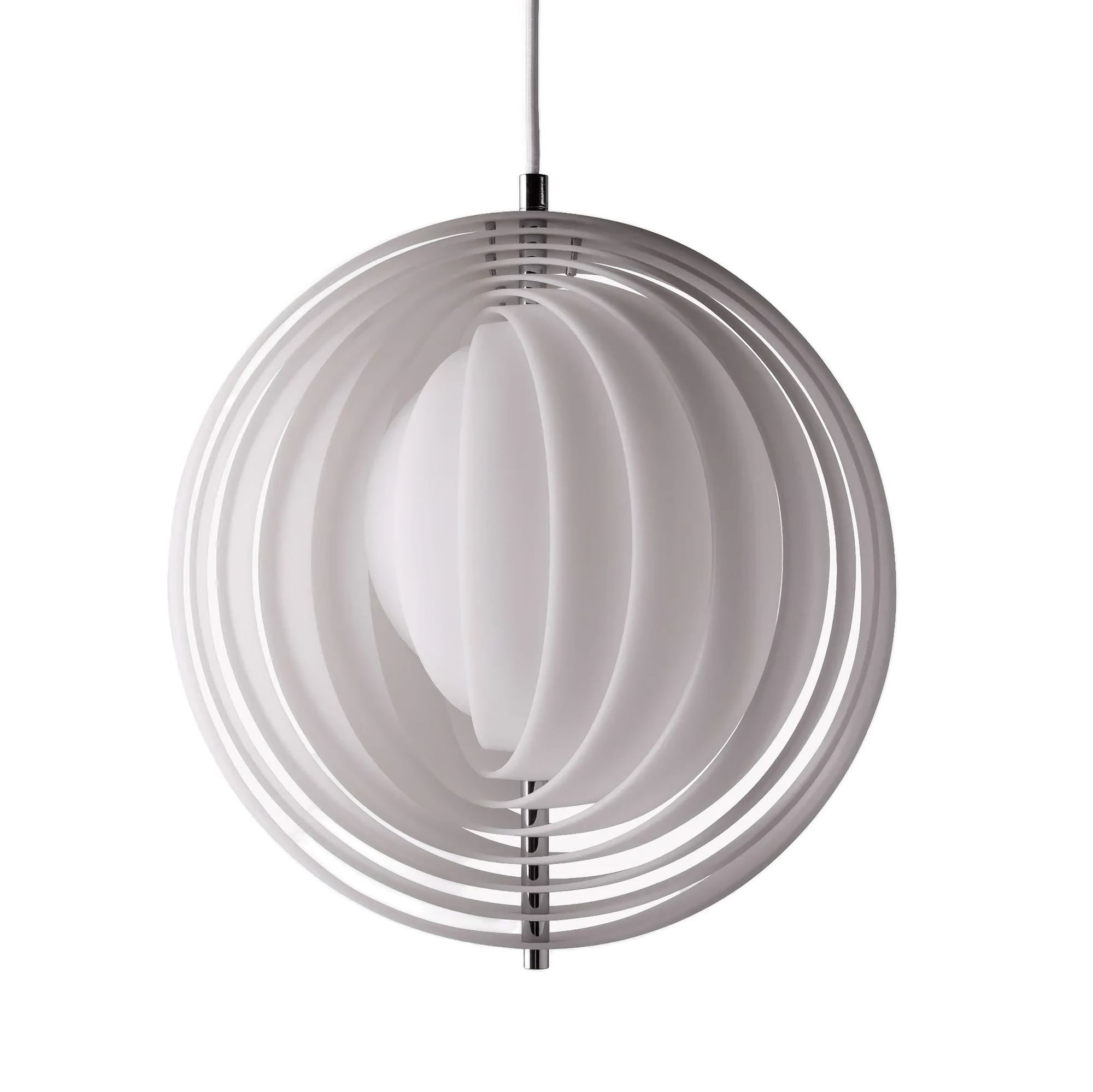 Designed in 1960, the Moon represents one of Verner Panton’s earliest designs in lighting. The iconic pendant is characterized by its fan-like design with ten ring-shaped lamellae perfectly positioned to provide a soft, ambient and glare-free light. The blades reflect and filters the light and the pendant changes its appearance depending on the angle at which you view it.