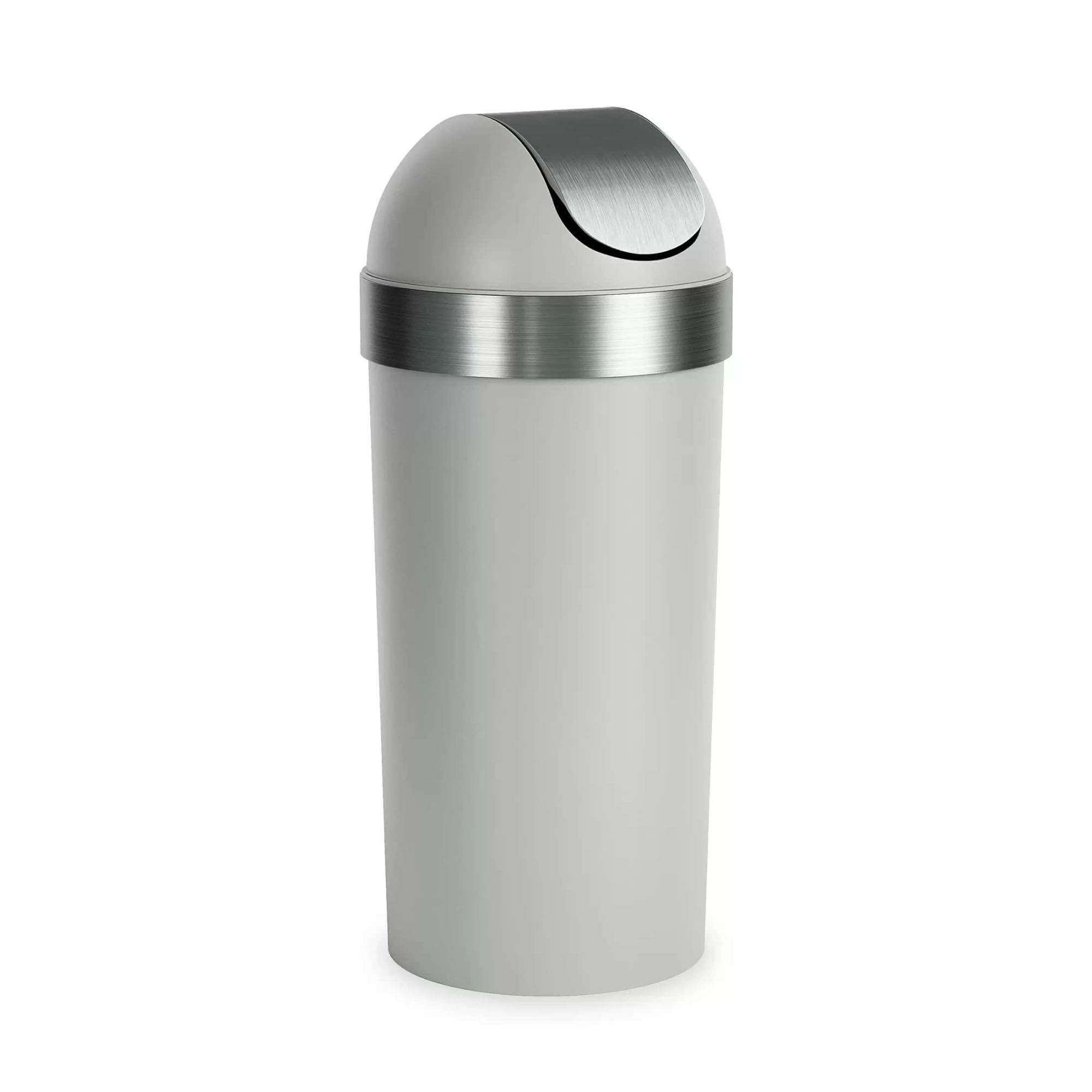 Style meets function with this large, easy-to-use garbage can. With sleek brushed metallic accents, a hassle-free molded swing-top lid, and an integrated neck ring, Venti keeps your waste out of sight. Venti Trash Can is sturdy, stable, and constructed of durable black polypropylene, which can be quickly wiped down with a damp cloth. Venti Trash Can is 35 inches (89 cm) tall by 14.6 inches (37 cm) in diameter, with a 16-gallon (62L) capacity. It works with 30-gallon garbage bags, including draw-sting and flap-tie bags. Venti is large enough in size so the bag doesn’t require constant changing but compact enough to fit in almost any space in your home.