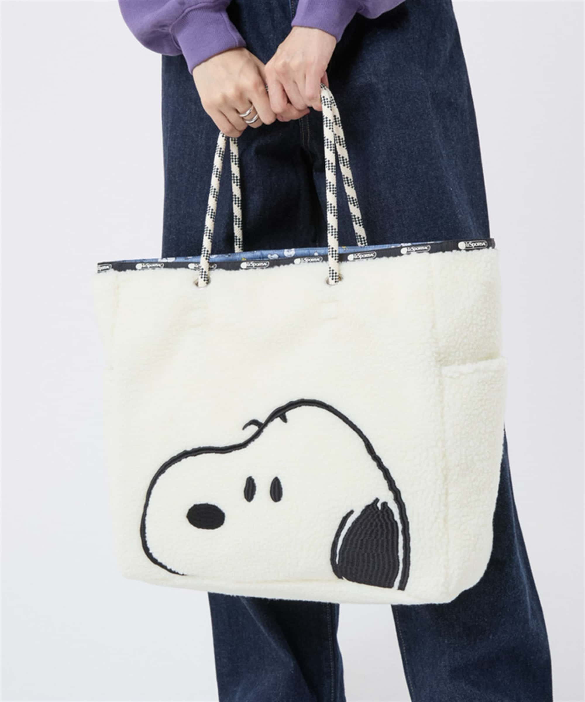 This year's collection features PEANUTS, the comic by Charles M. Schulz, one of America's most iconic cartoonists! This fluffy design features Snoopy embroidered on white boa. The reverse side features a cute reversible denim design featuring Snoopy and his friends. This large, reversible tote bag is perfect for both work and play. Its simple, no-compartment design allows it to accommodate any type of item. Its wide gusset allows it to comfortably fit A4 documents and even a laptop, making it ideal for commuting to work or school, as well as for those days when you're carrying a lot of luggage like the gym, as a mom bag, or for travel. The side pockets fit a 500ml water bottle and are convenient for storing items you need quick access to, like your smartphone or IC card.