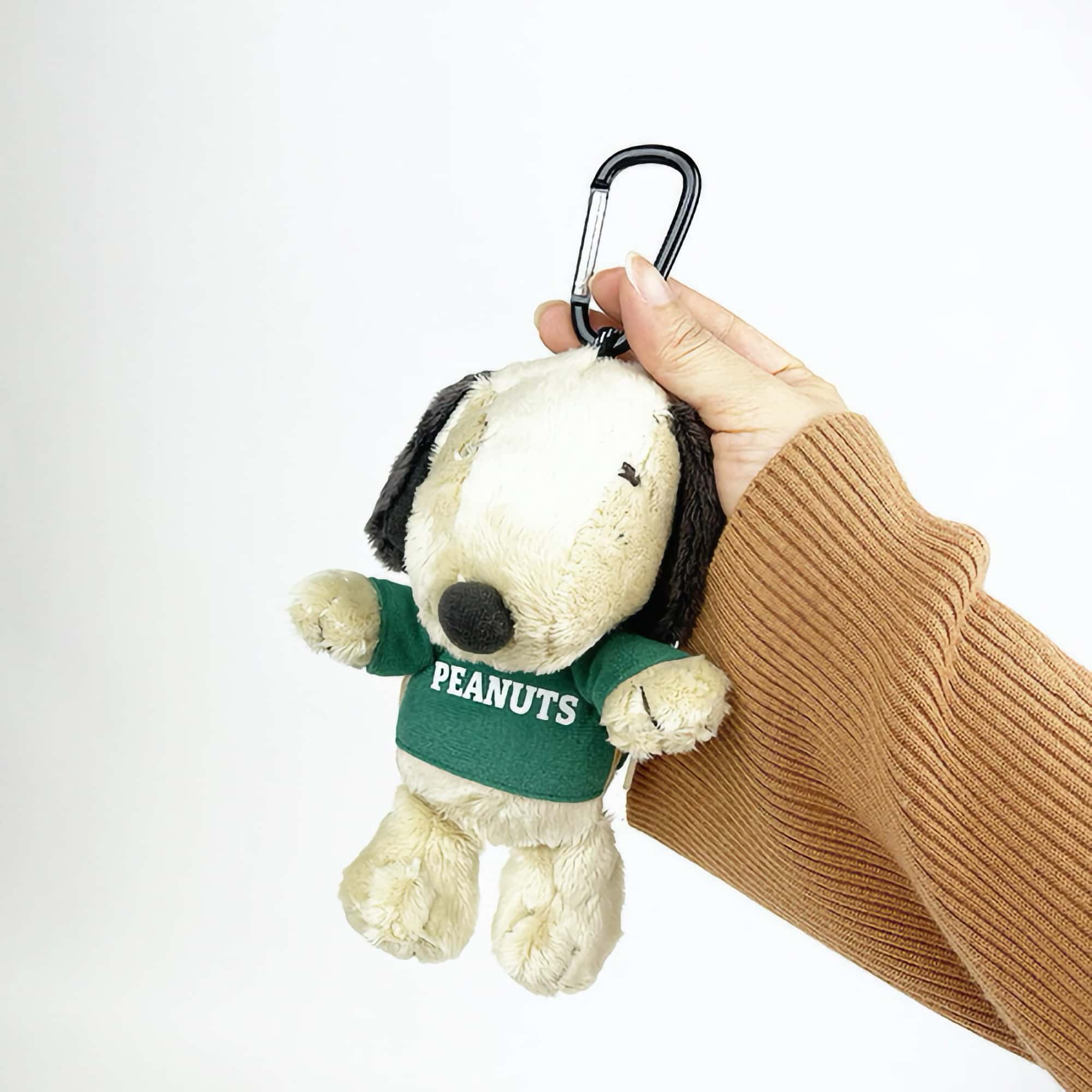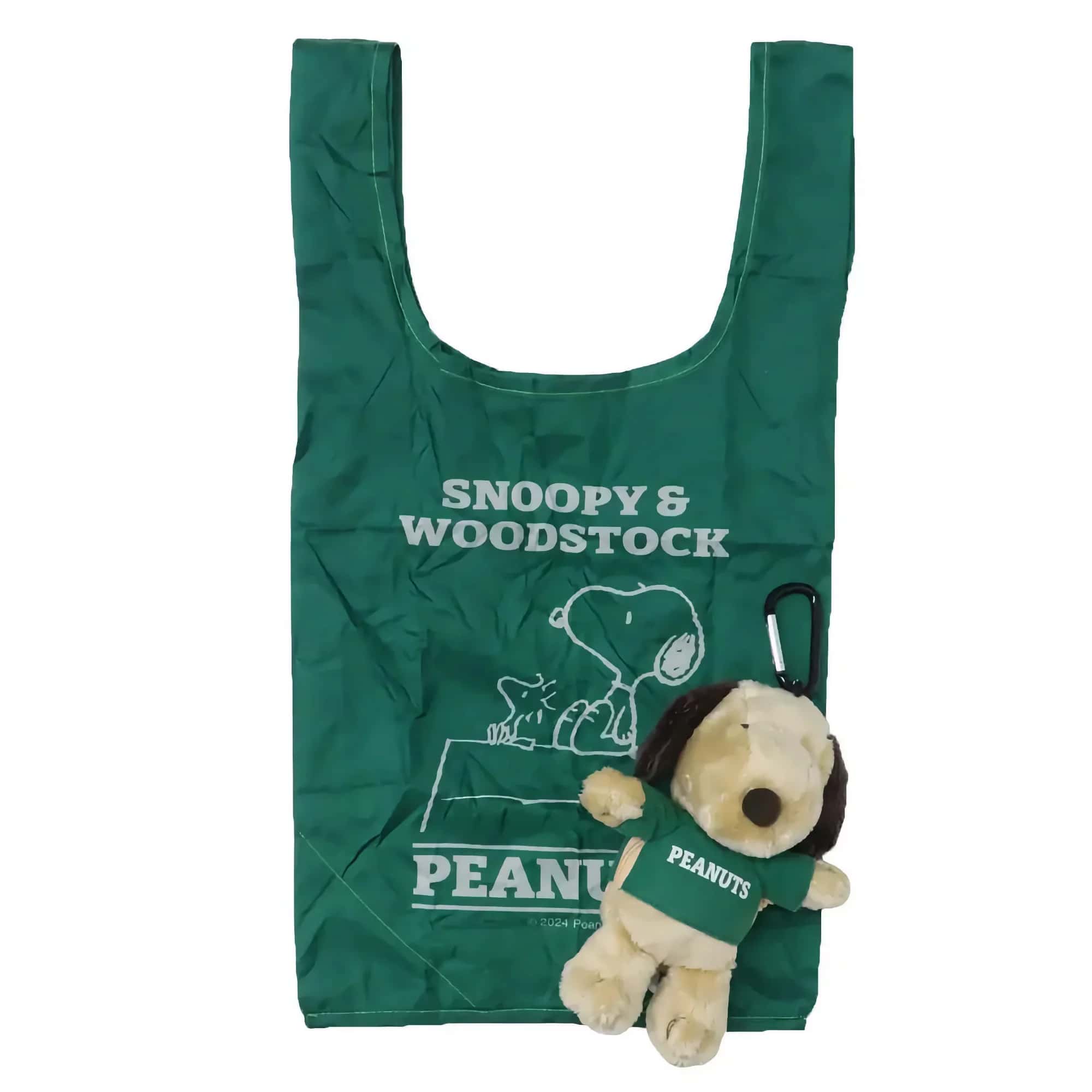 Snoopy Plush Eco Bag that comes with a carabiner case. Wear it as a mascot charm on your bag when not in use, or unfold it for shopping. Compact at 14cm × 12cm × 19cm, made from polyester. Perfect for eco-conscious collectors who love Peanuts character design.