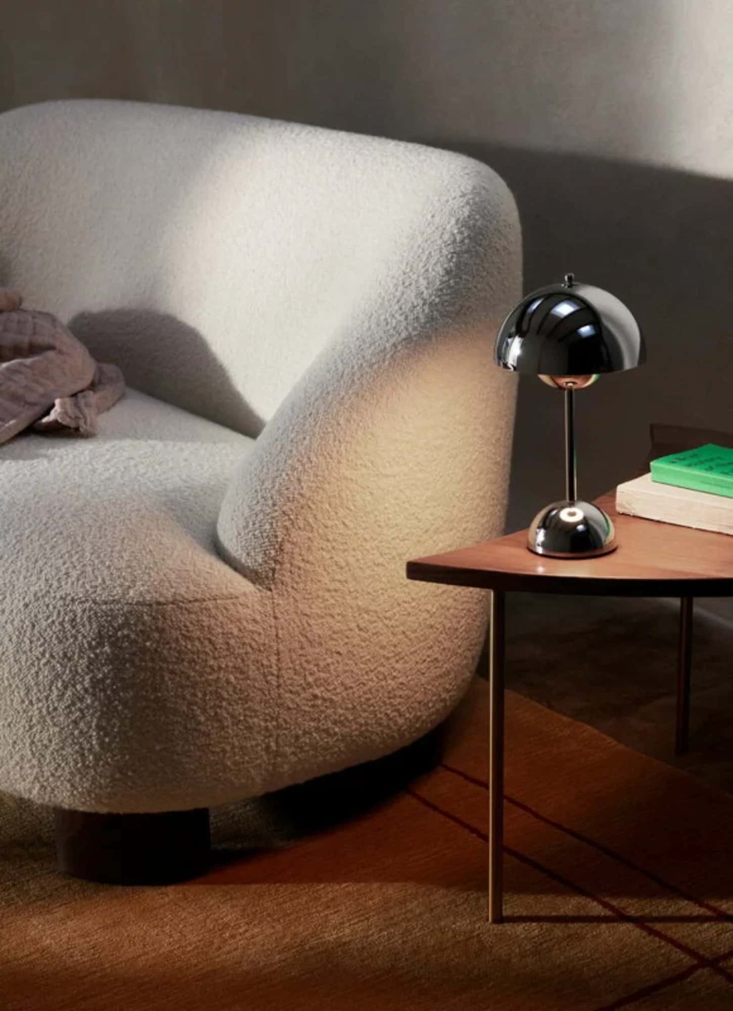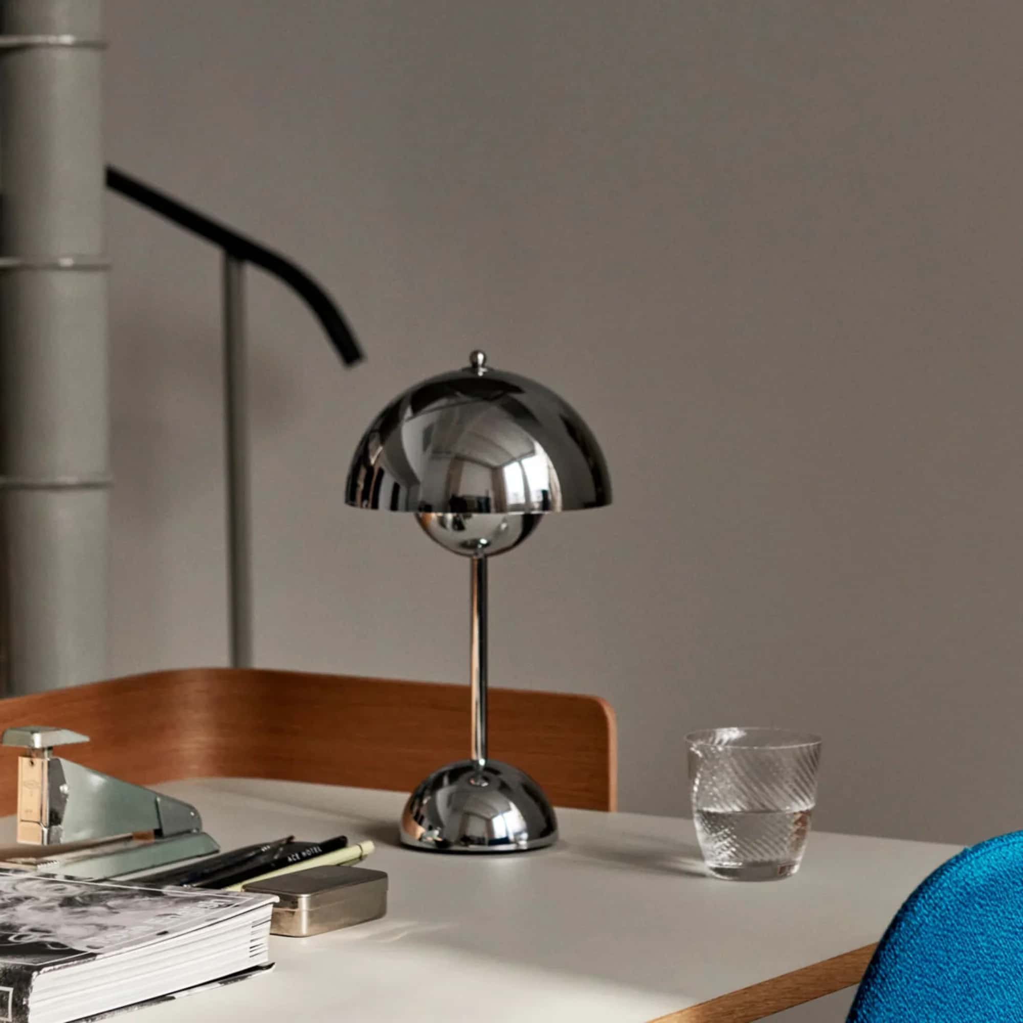 The Flowerpot, a vividly coloured lamp with a rounded pendant that hangs from the semi-domed upper shade, embodies the experimental attitude of Verner Panton. Slightly smaller in size than the table lamp version, and deliberately lightweight, the portable VP9 comes equipped with a USB charging cable. It is available in a wide range of contemporary colours and will bring a cozy atmosphere to indoor and outdoor settings.