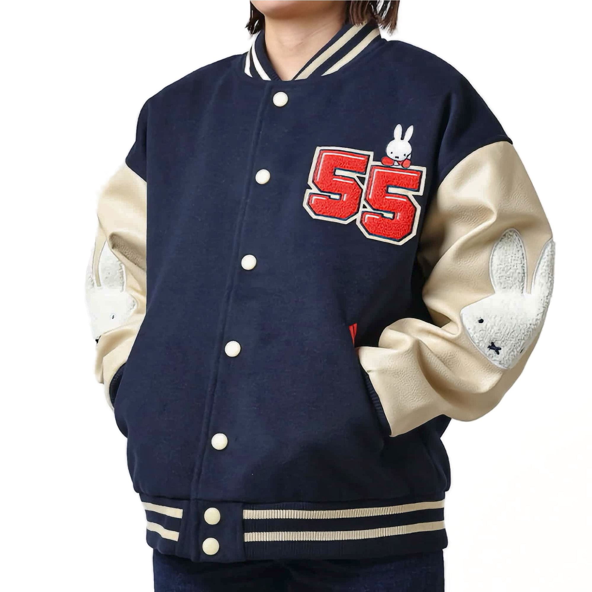 Stylish sukajan jacket featuring adorable Miffy embroidery across the back, with charming accent details on the sleeves and chest. The unisex design works for all genders—women can rock an oversized fit for extra cool factor. Perfect for mixing cute and edgy vibes in one piece.