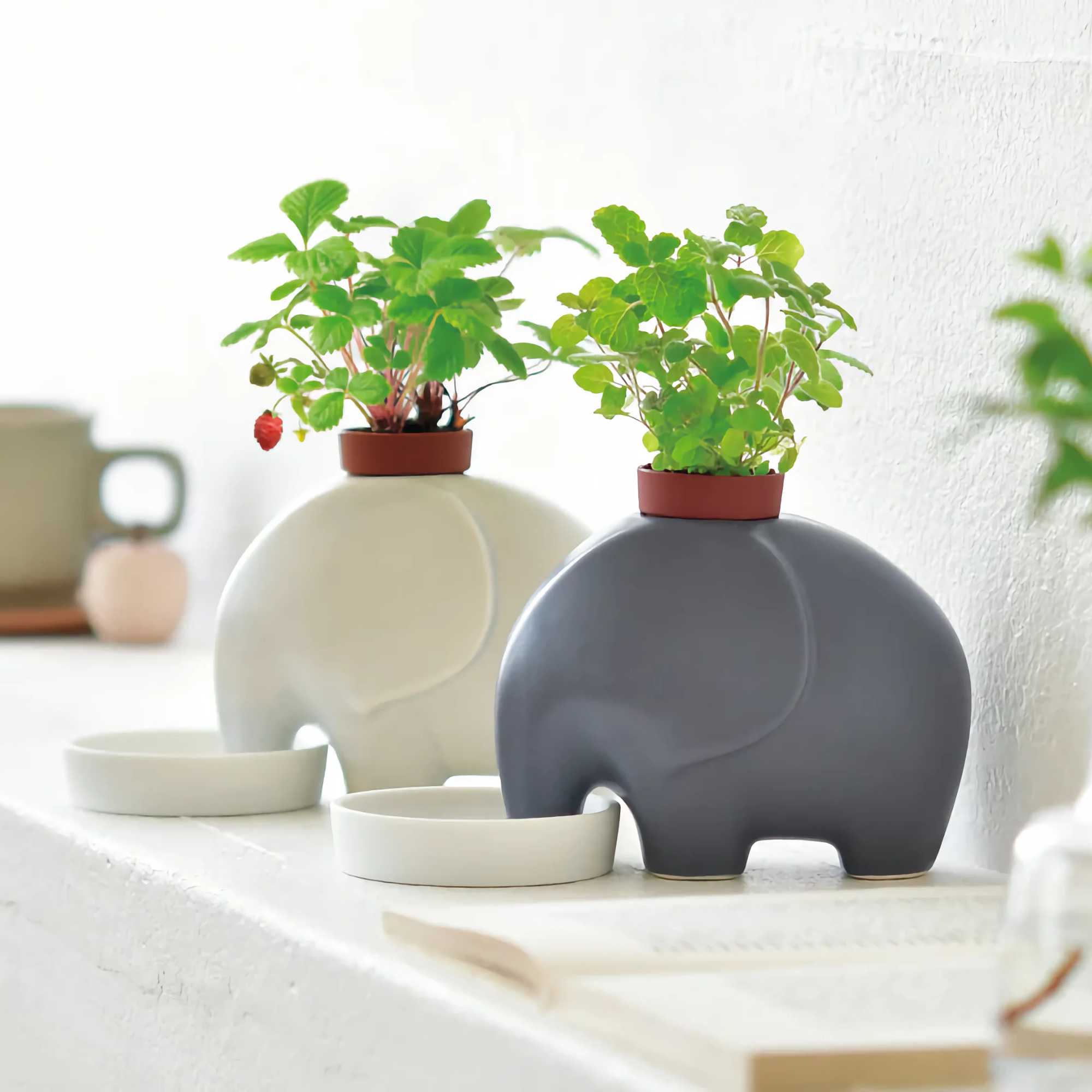 Introducing the Seishin Ceramic Elephant Potted Plant, featuring a beautifully crafted porcelain elephant from Seto Ware City, Aichi Prefecture. The accompanying saucer is also made of high-quality domestic ceramic. After enjoying the cultivation of your wild strawberry, utilize it as a stylish pen holder. Elevate your space with this elegant and functional piece.