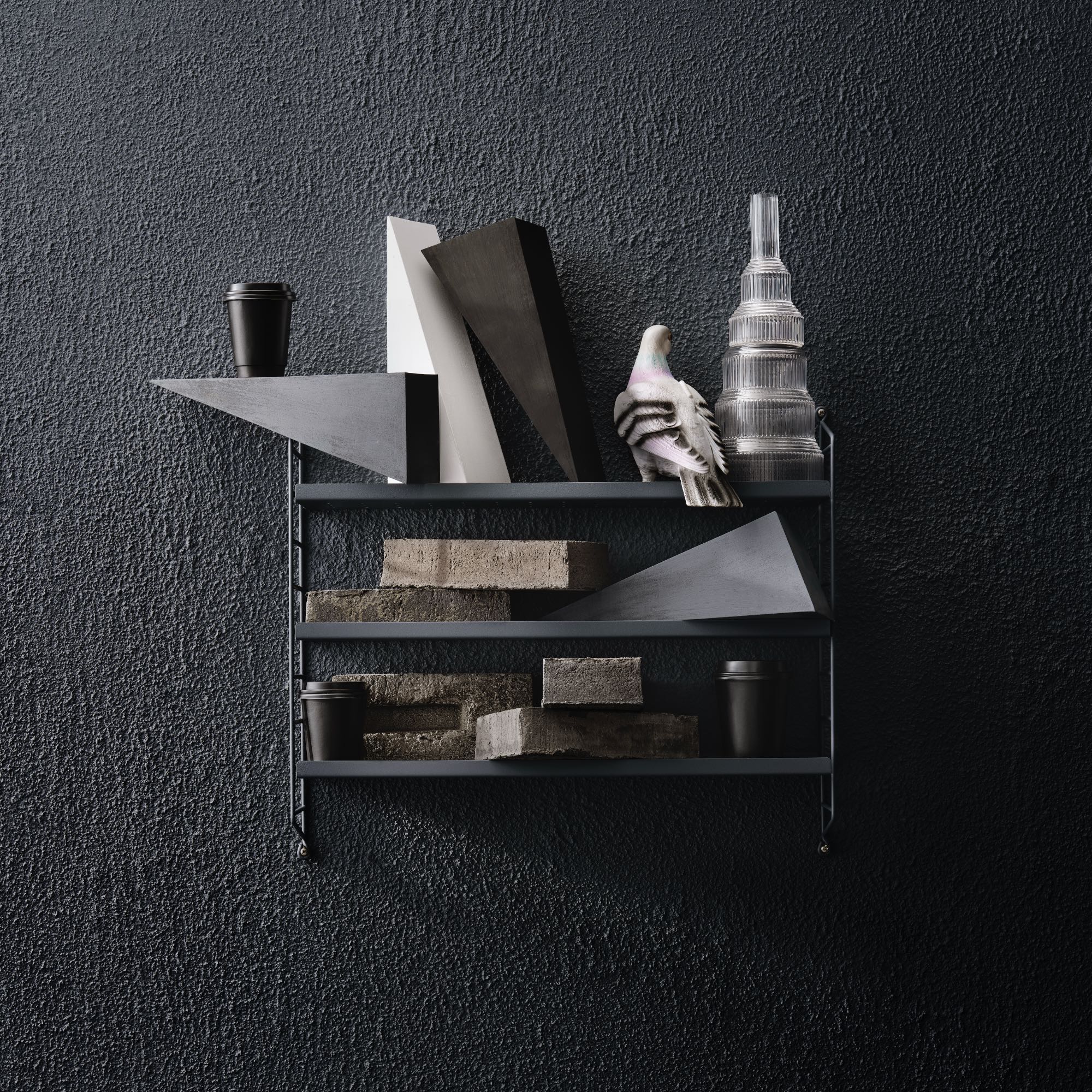 String® Pocket metal is sold as a complete shelf but is equally flexible as String® System. String® Pocket invites creativity and personality where you can combine two or three String® Pocket shelves into one larger shelf. Mix and match different colours to suit your style and preferences. The perforated metal shelves with low edge, 2 cm, makes it possible to add hooks and rods (30 cm and 58 cm) to increase the storage possibilities. String® Pocket metal is sold as one complete unit containing two wire panels, height 50 cm, and three metal shelves, width 58 cm and depth 15 cm.