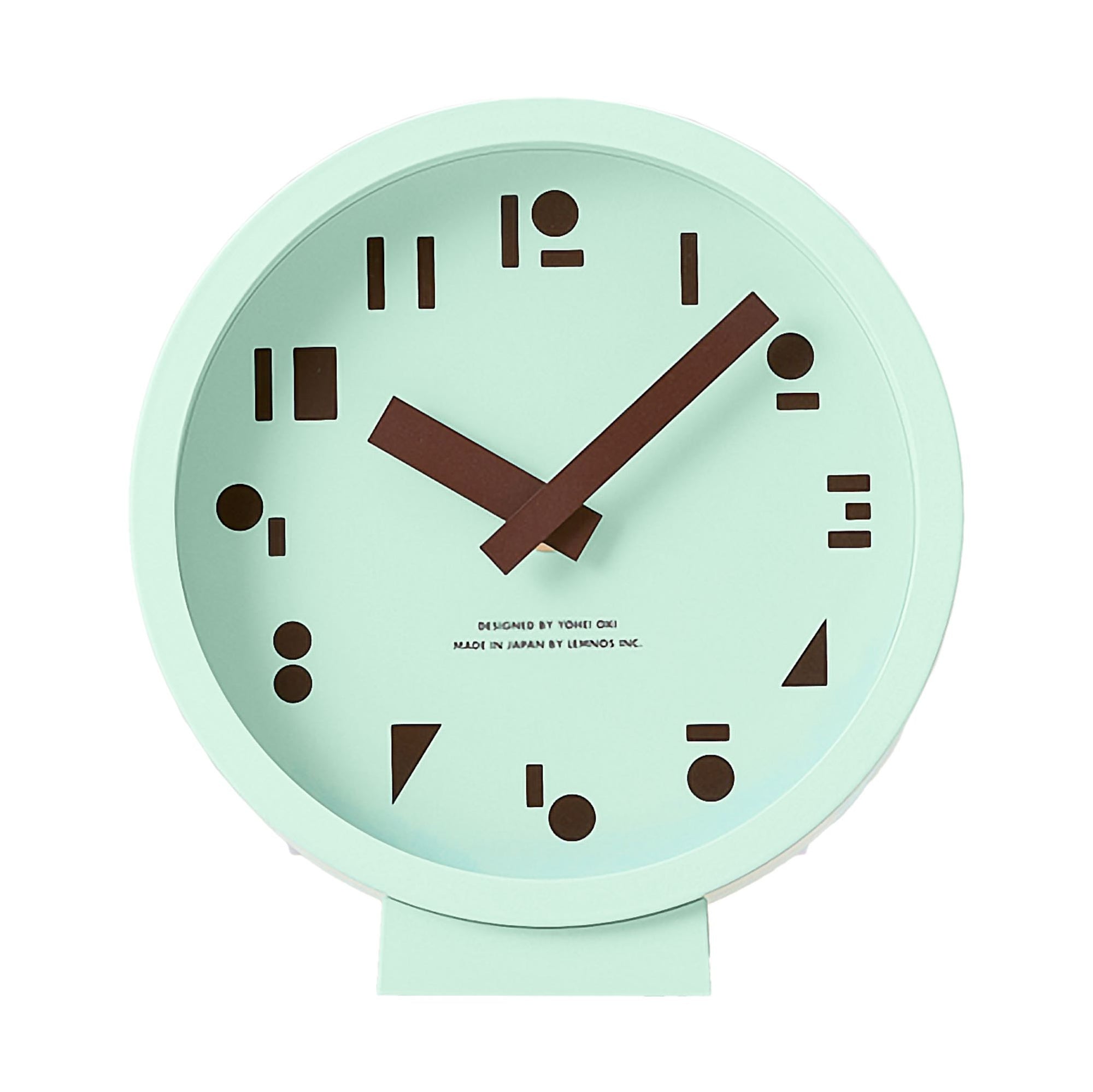When these geometric shapes are combined, they begin to resemble numbers. The rhythmically arranged shapes that indicate the time create a new design for this clock. Available in four colors: deep black and three pop colors reminiscent of ice cream. Remove the included stand to use it as a small wall clock to accent your interior decor.