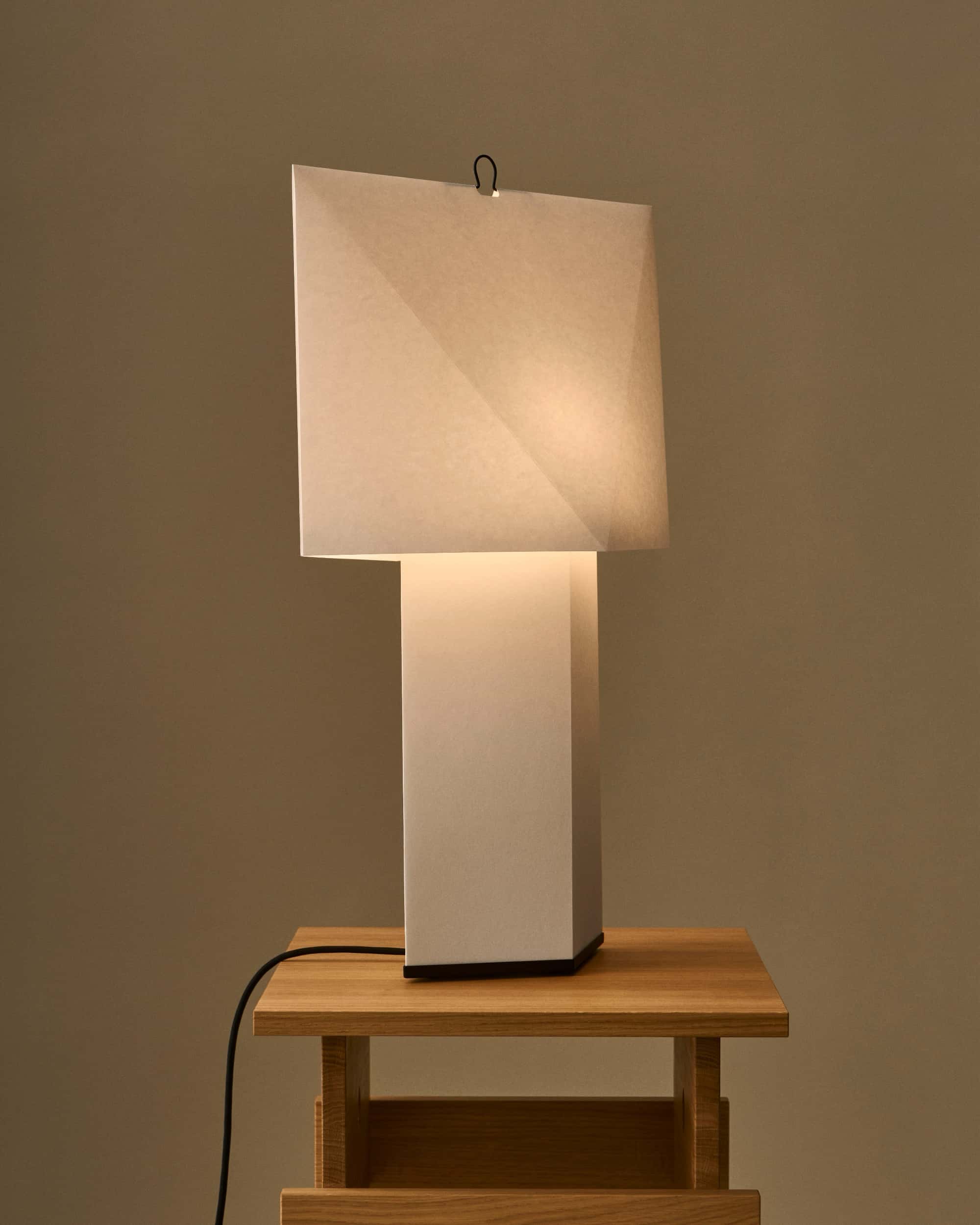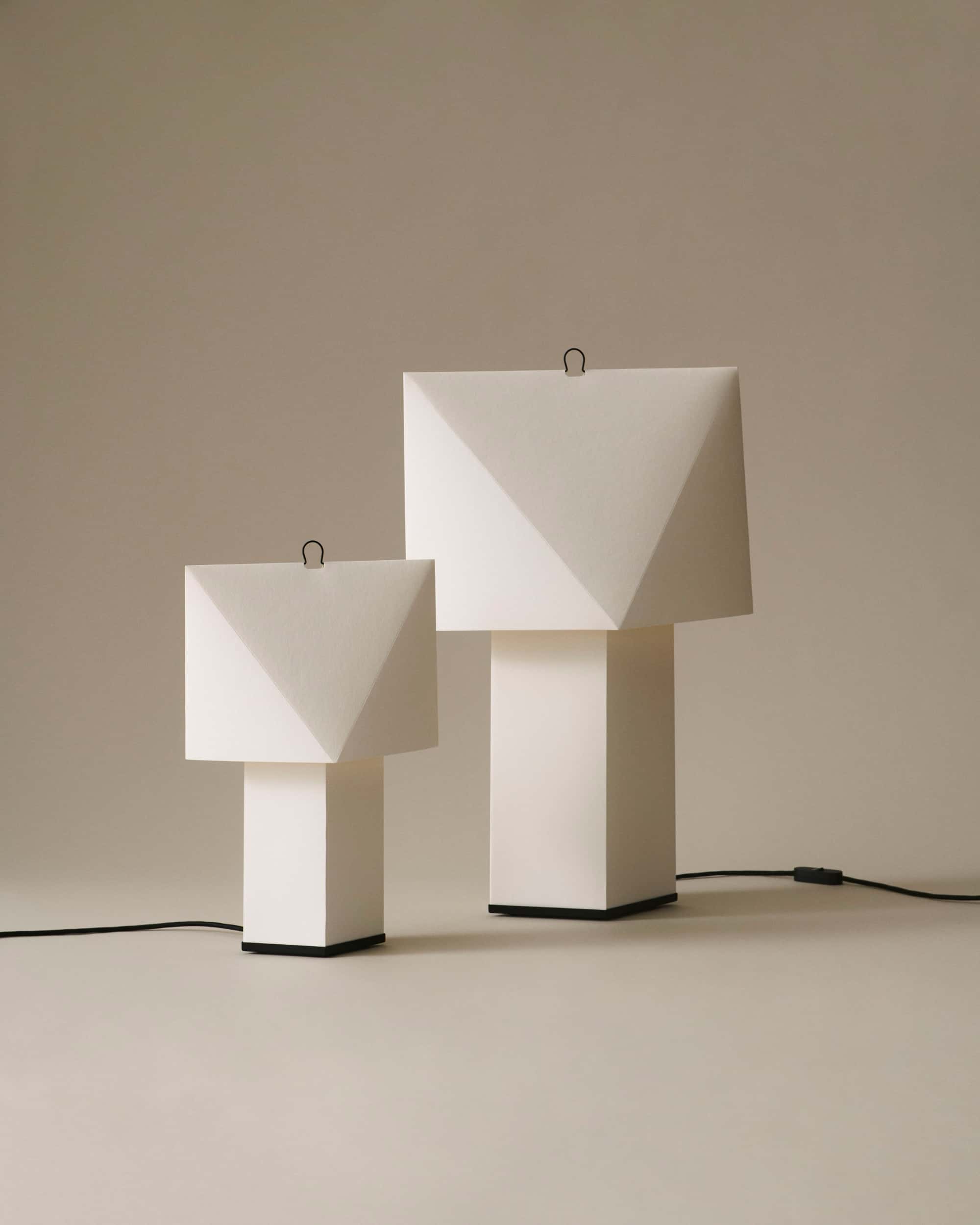 Designed by the French design duo CPRV, Aplat Table Lamp is a lightweight, sculptural lamp crafted primarily from folded paper. Its flat-packed design is assembled by the user, with precise lines and angles that build volume and shape it into a simple, graphic form. The diffused paper surface emits an ambient glow reminiscent of candlelight, adding warmth and atmosphere to its surroundings.