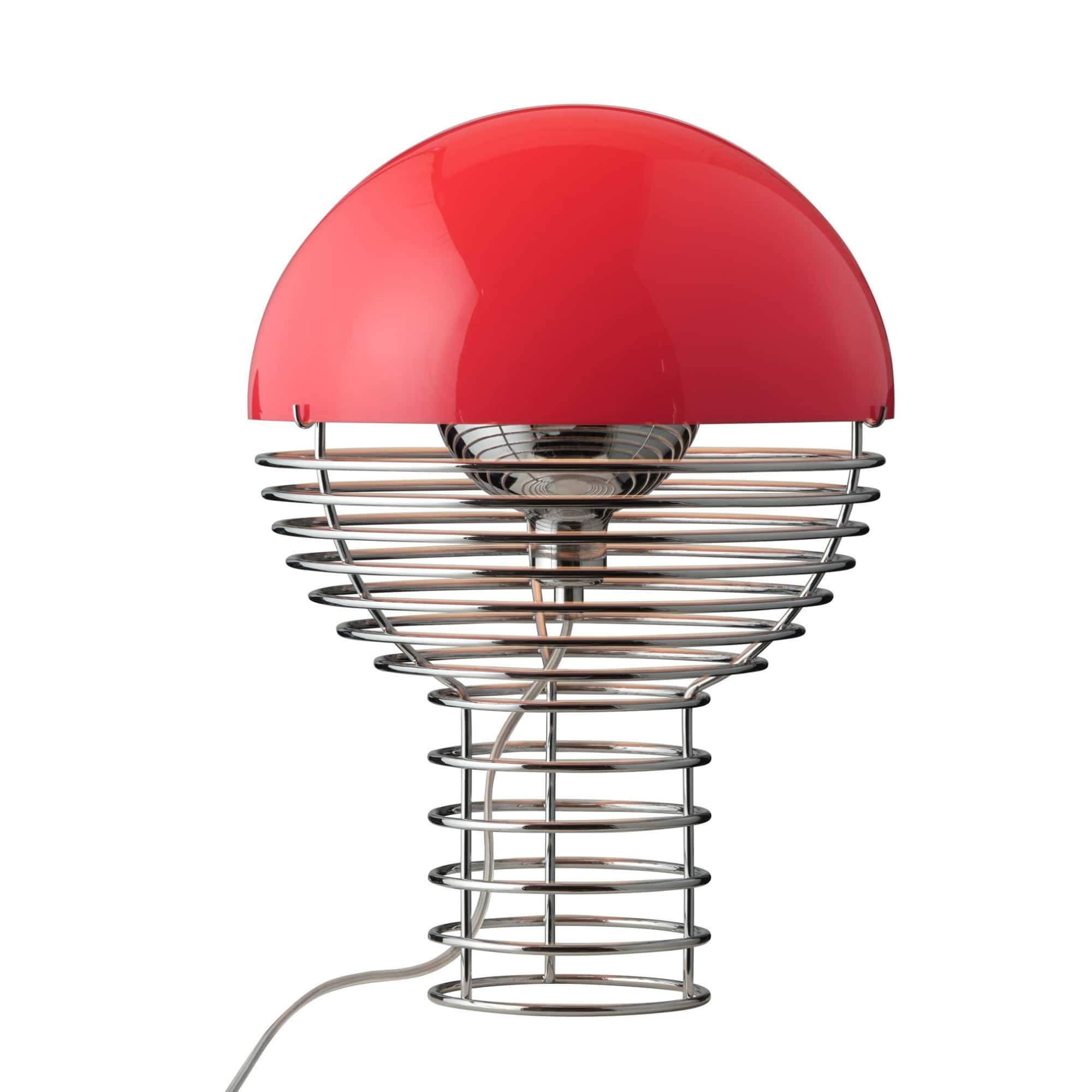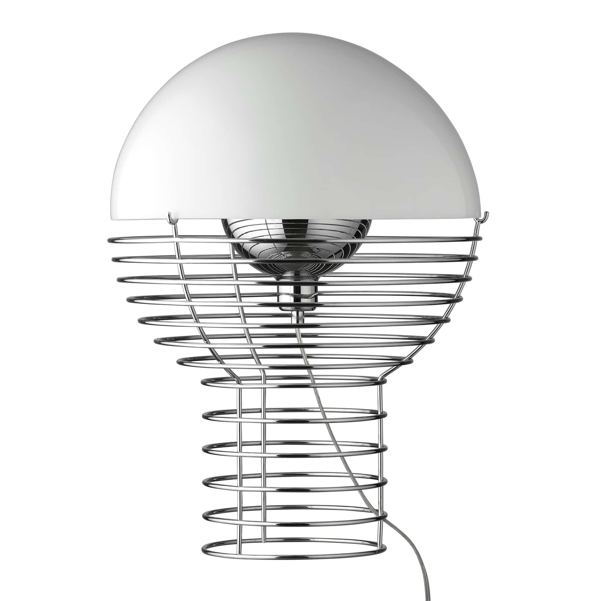 The decorative Wire table lamp is defined by the chrome-plated steel wire framework that widens at the top to support the white hemispherical plastic shade. The bulb is contained in a small, also hemispherical metal reflector, which guides the light to the inside of the shade. The wire frame gives the design a distinctive, yet very light and non-intrusive appearance, and the white shade offers plenty of ambient light.