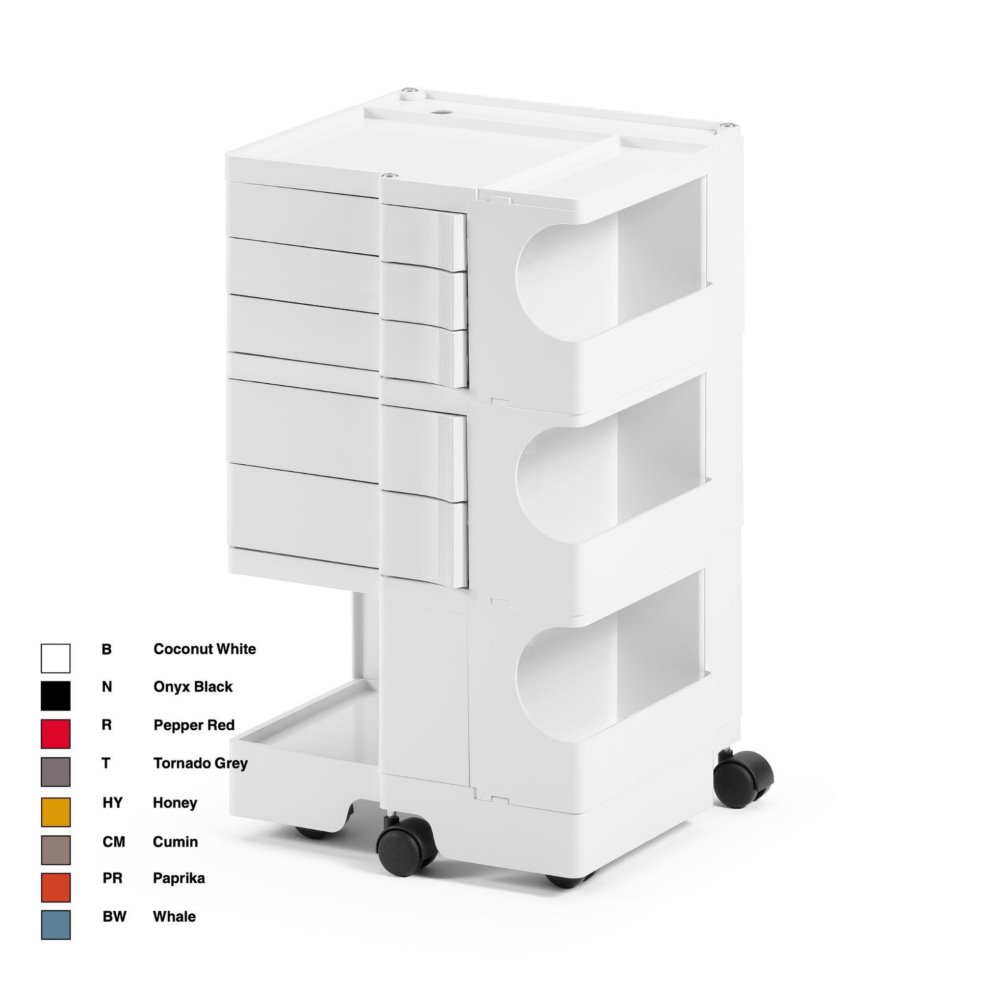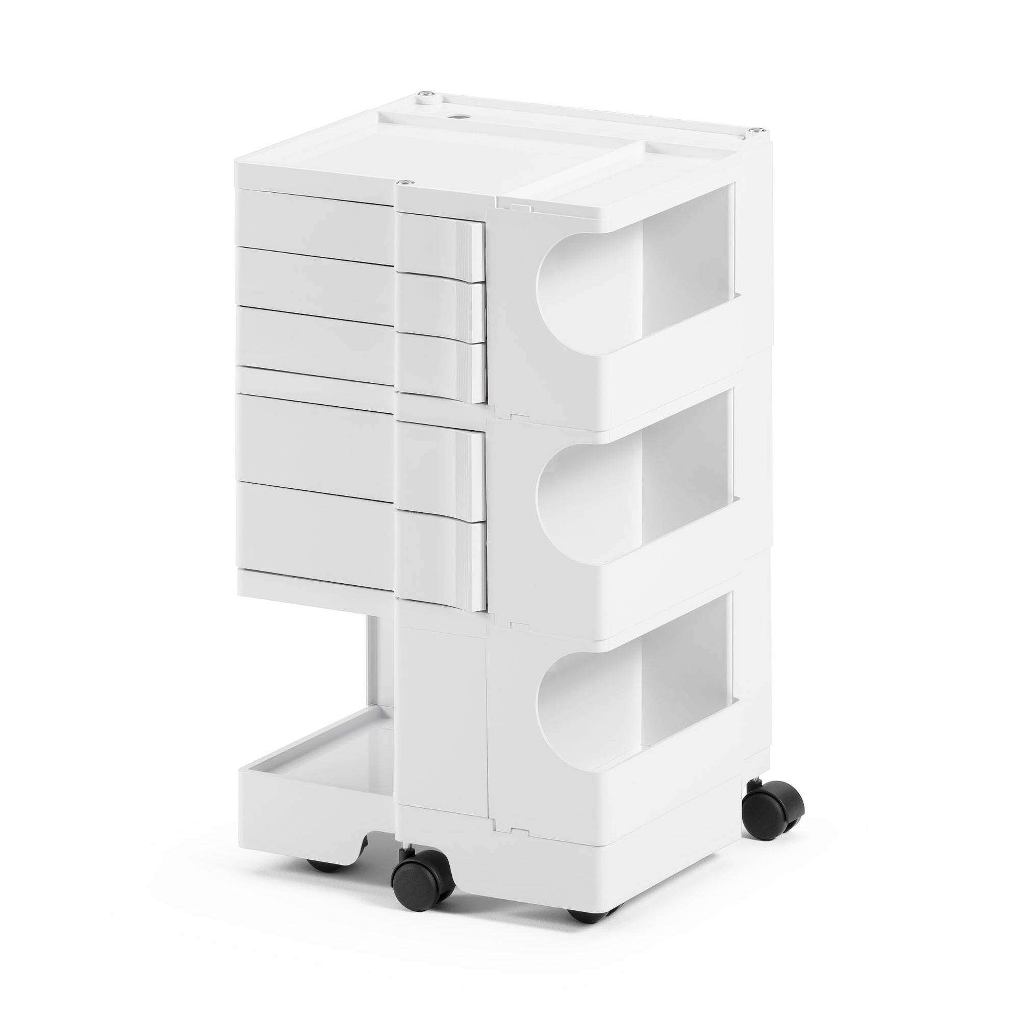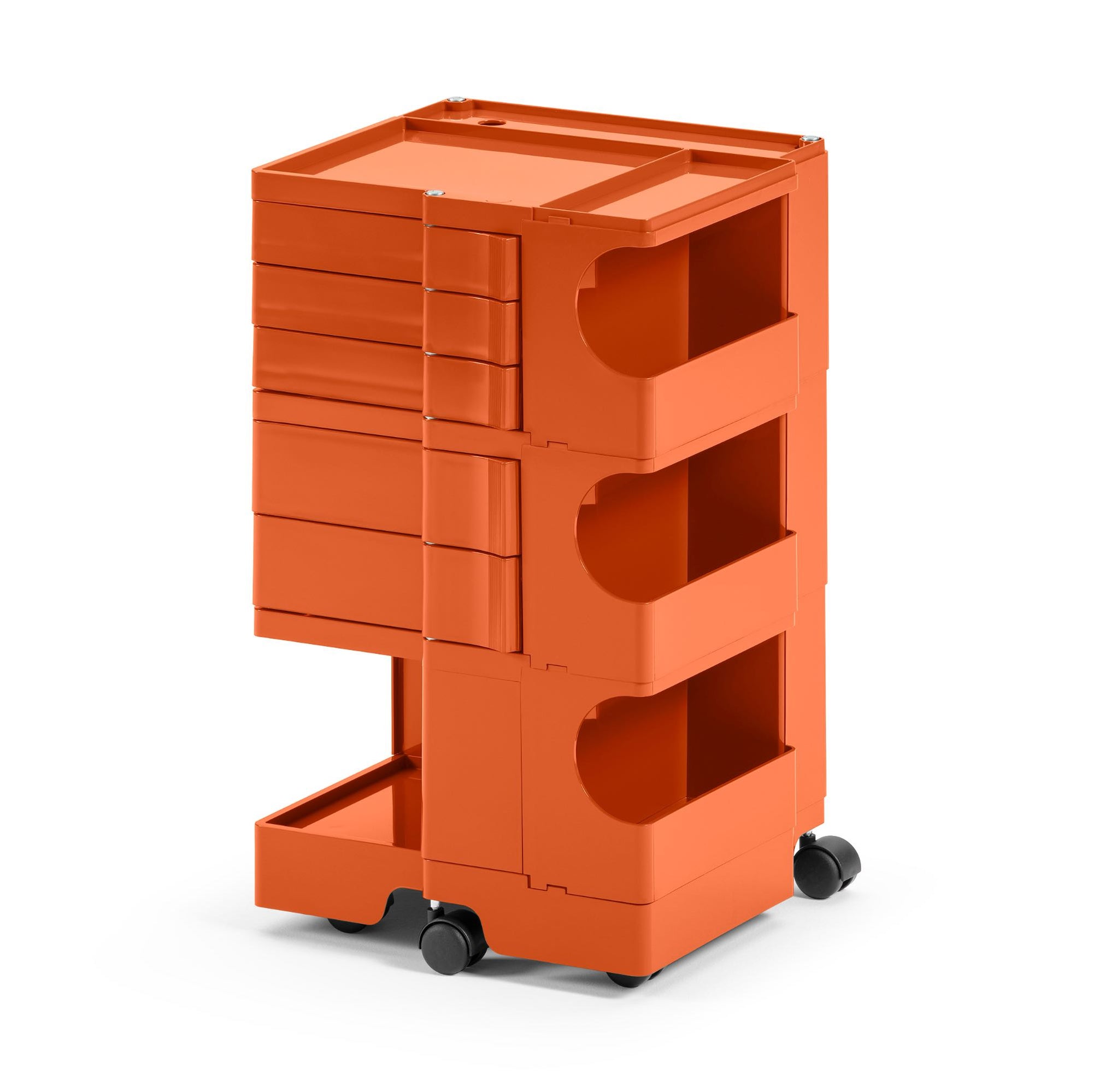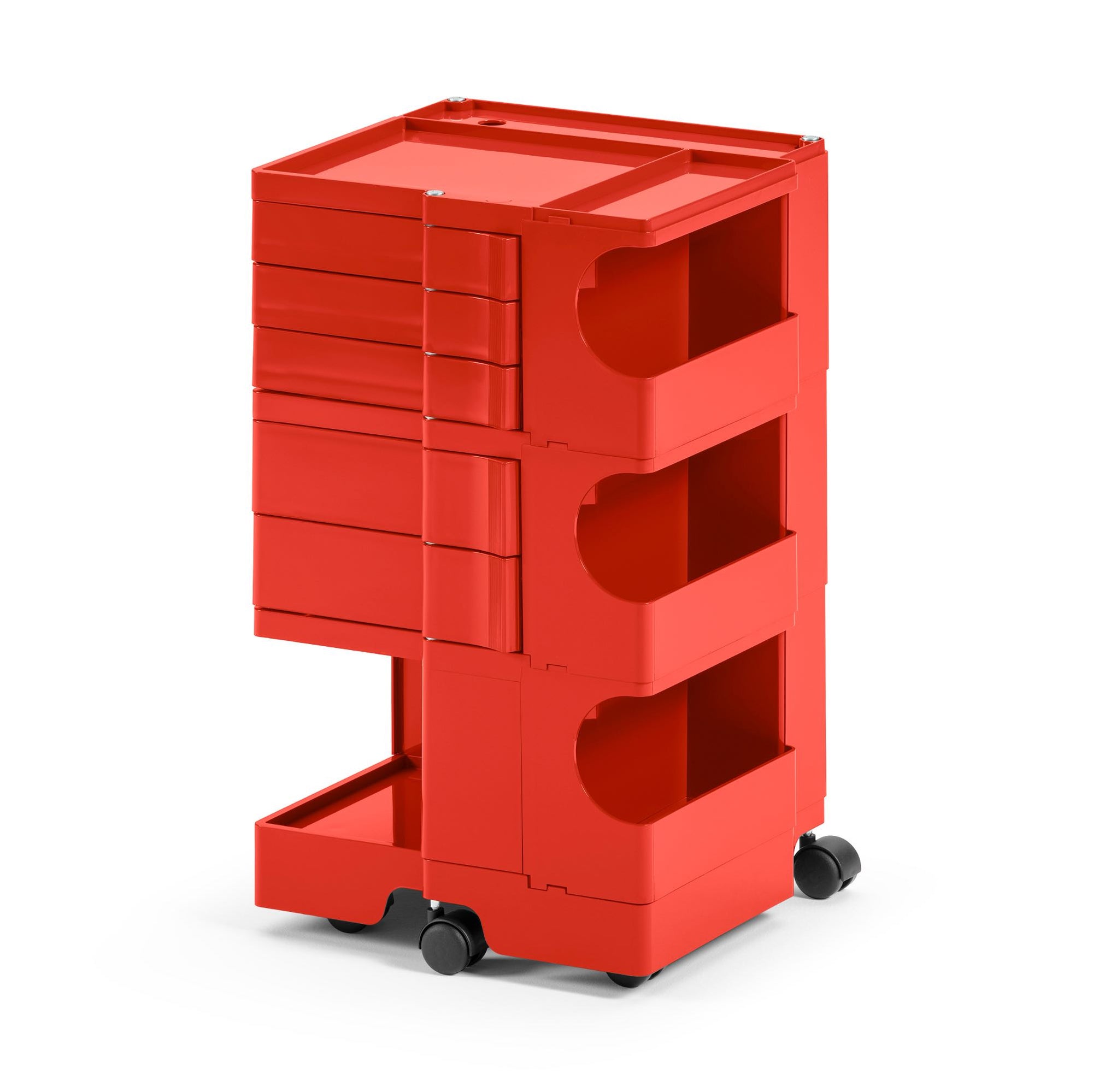 Boby is a trolley case and storage system that made history, characterized by its high versatility. Designed to ensure ease of vertical modularity, allows to obtain custom capacities. The structure and the drawers are made of injection-molded ABS, while the wheels are made of polypropylene. First prize at SMAU in 1971. Part of the permanent collection of the Museum of Modern Art in New York and the "Triennale" in Milan.
