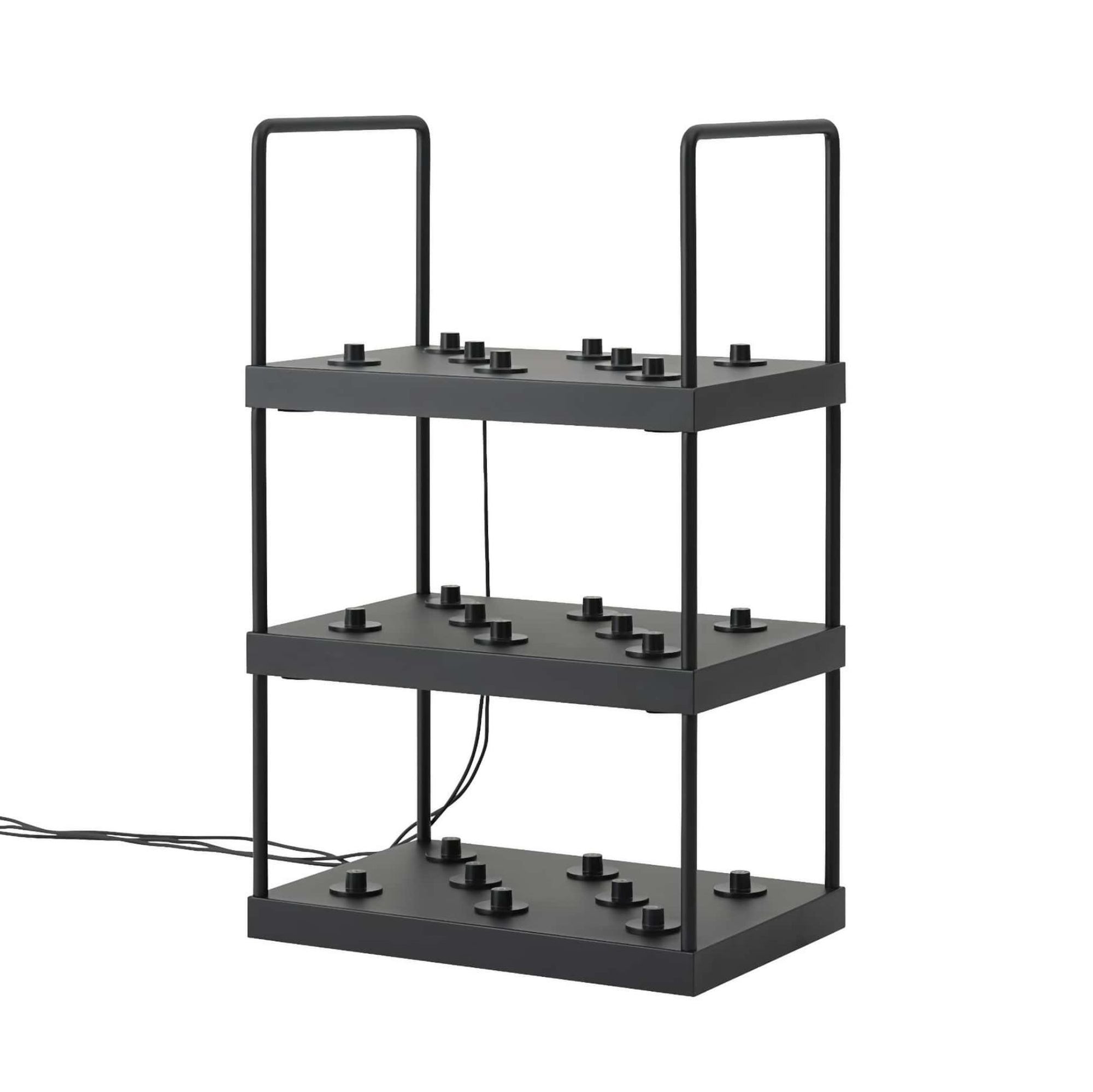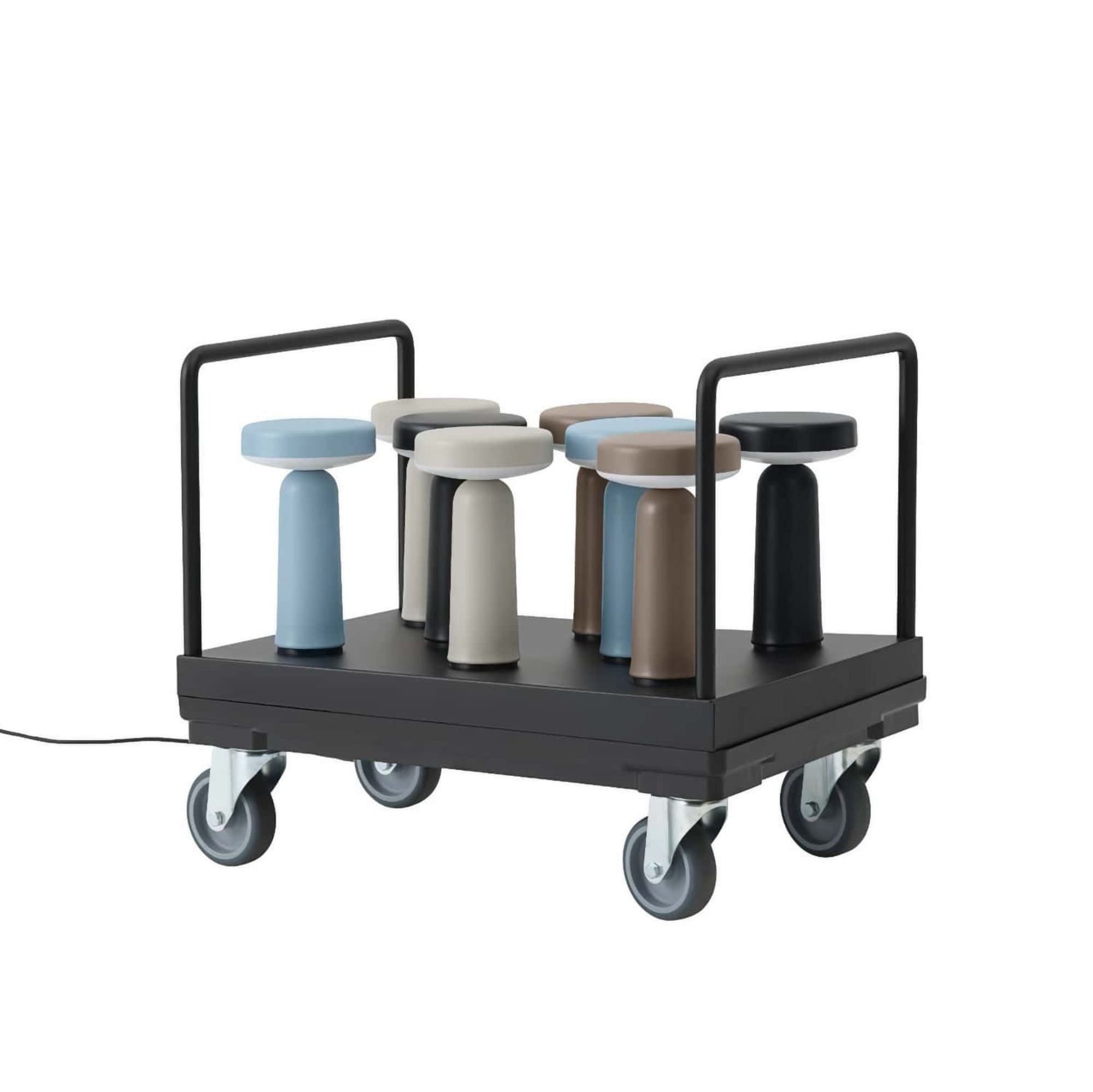 A charging tray unit allows one to charge 8 portable Ease Portable Lamps at the same time. The system is scalable, as it allows one to stack trays, and the unit is easily made mobile by placing it on top a standard euro container dolly or trolley. This makes it a solution that fits the needs and requirements of a broad customer range; from small cafés and restaurants to large conference centers and hotels. The charging station is easy to assemble and comes flat packed.