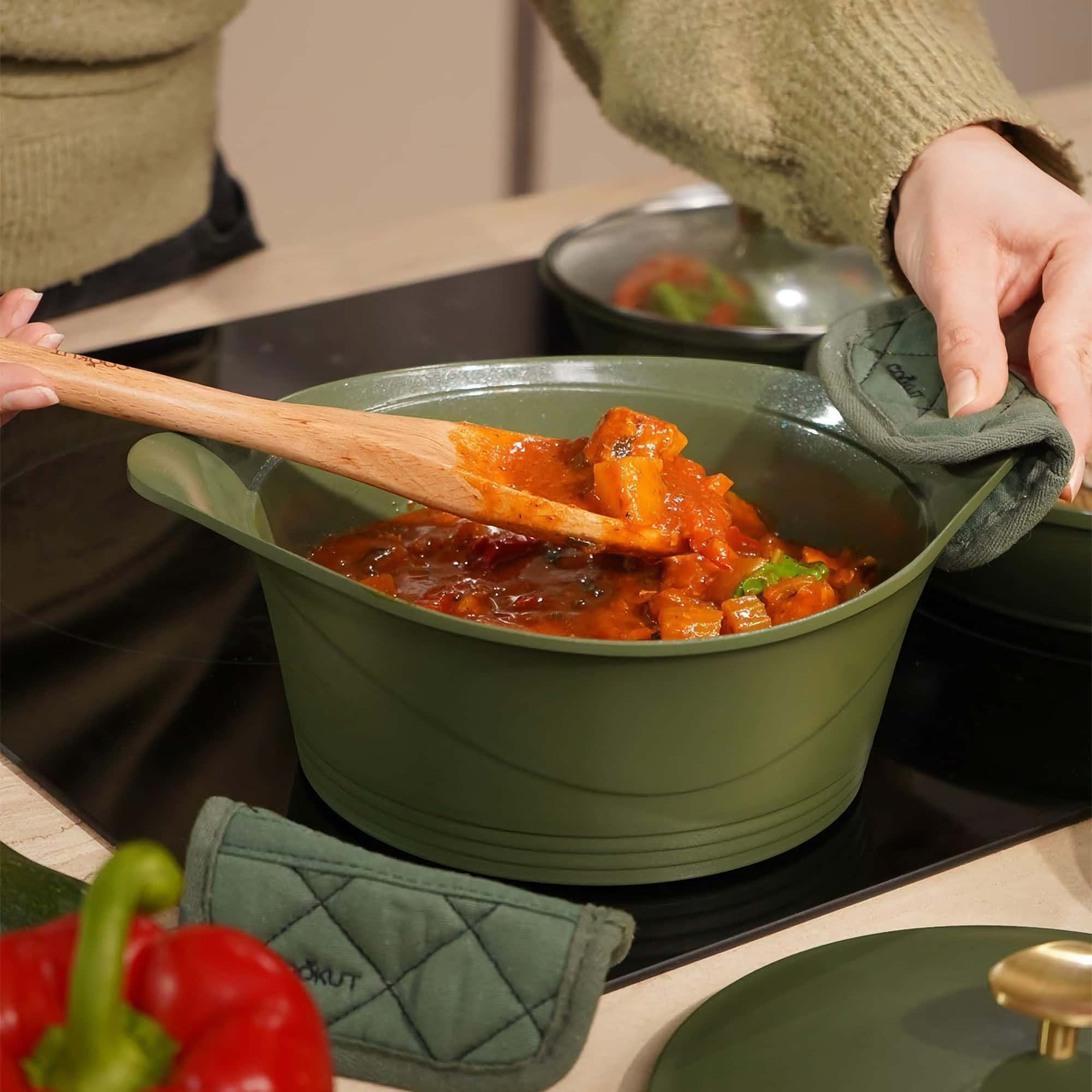 Discover the Cookut - The incredible 24 cm casserole dish in fern colour, equipped with an elegant metal handle and matching pot holders. Ideal for preparing delicious stews, this casserole combines design and functionality to enhance your kitchen. Made with high quality materials, it ensures that your favorite recipes are cooked evenly and tasty.