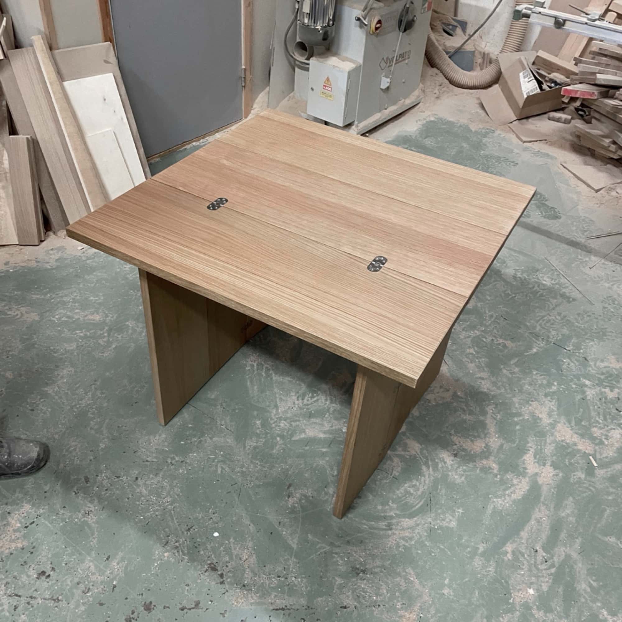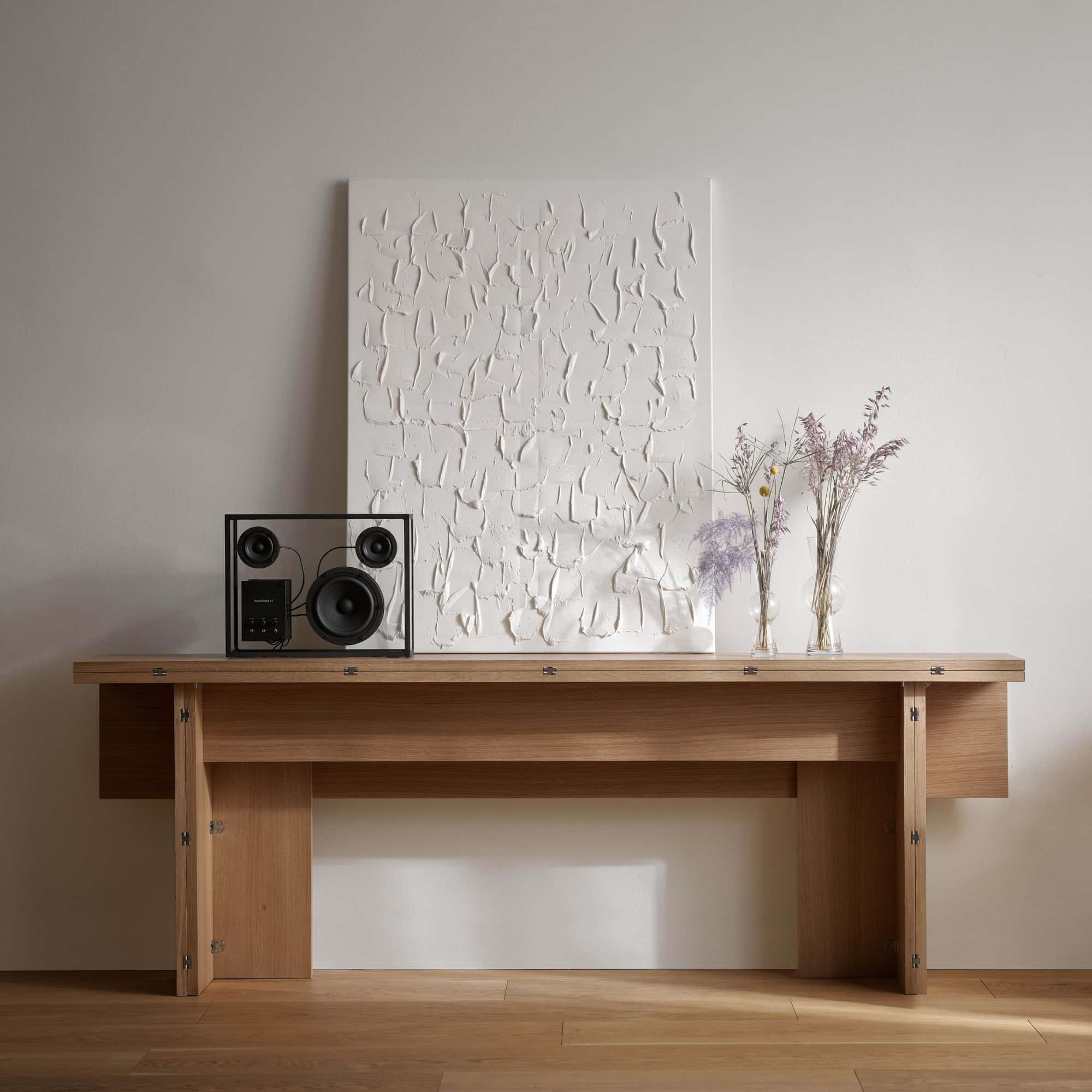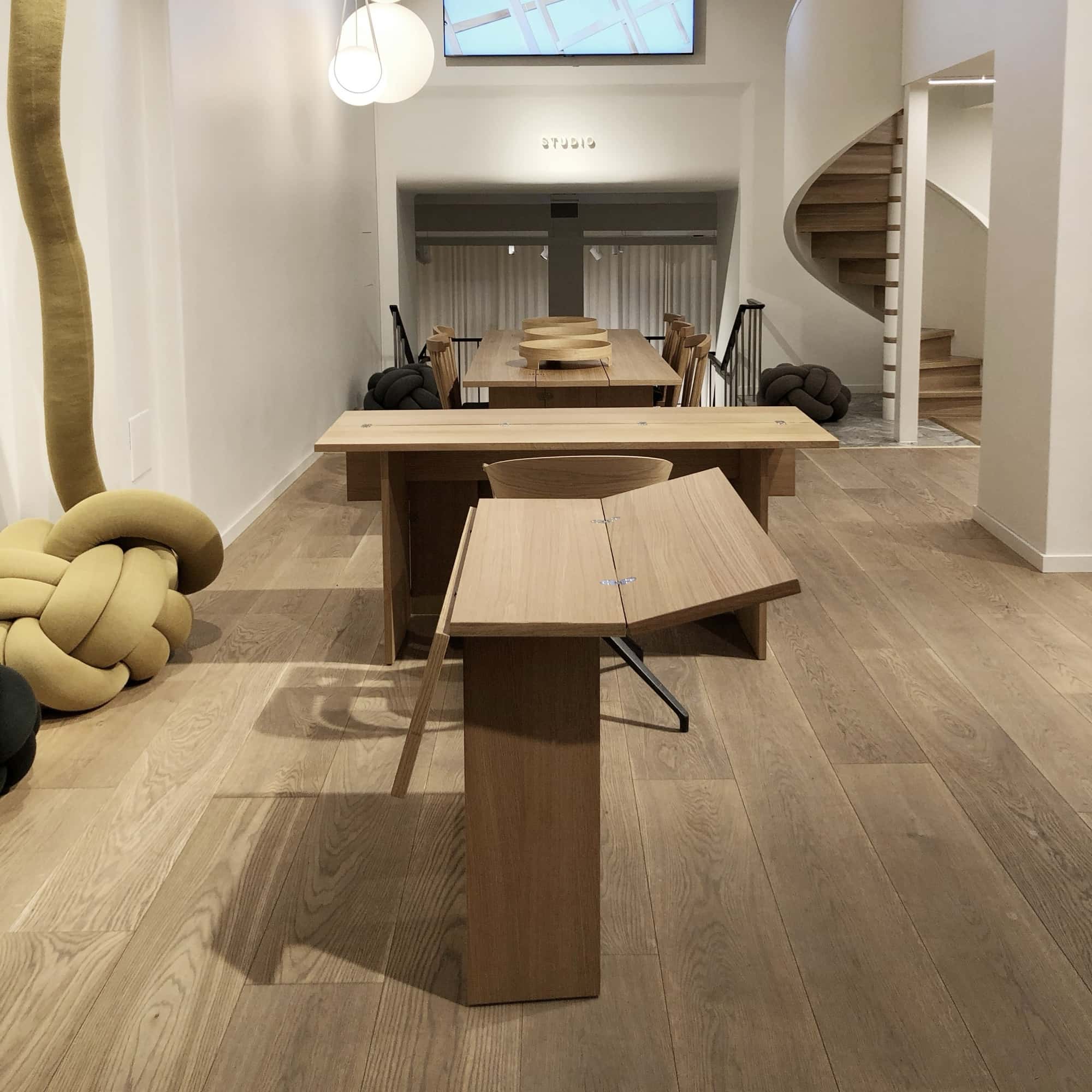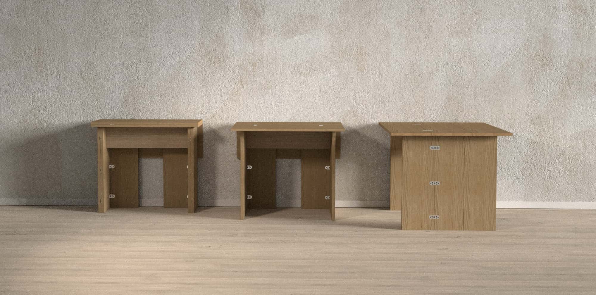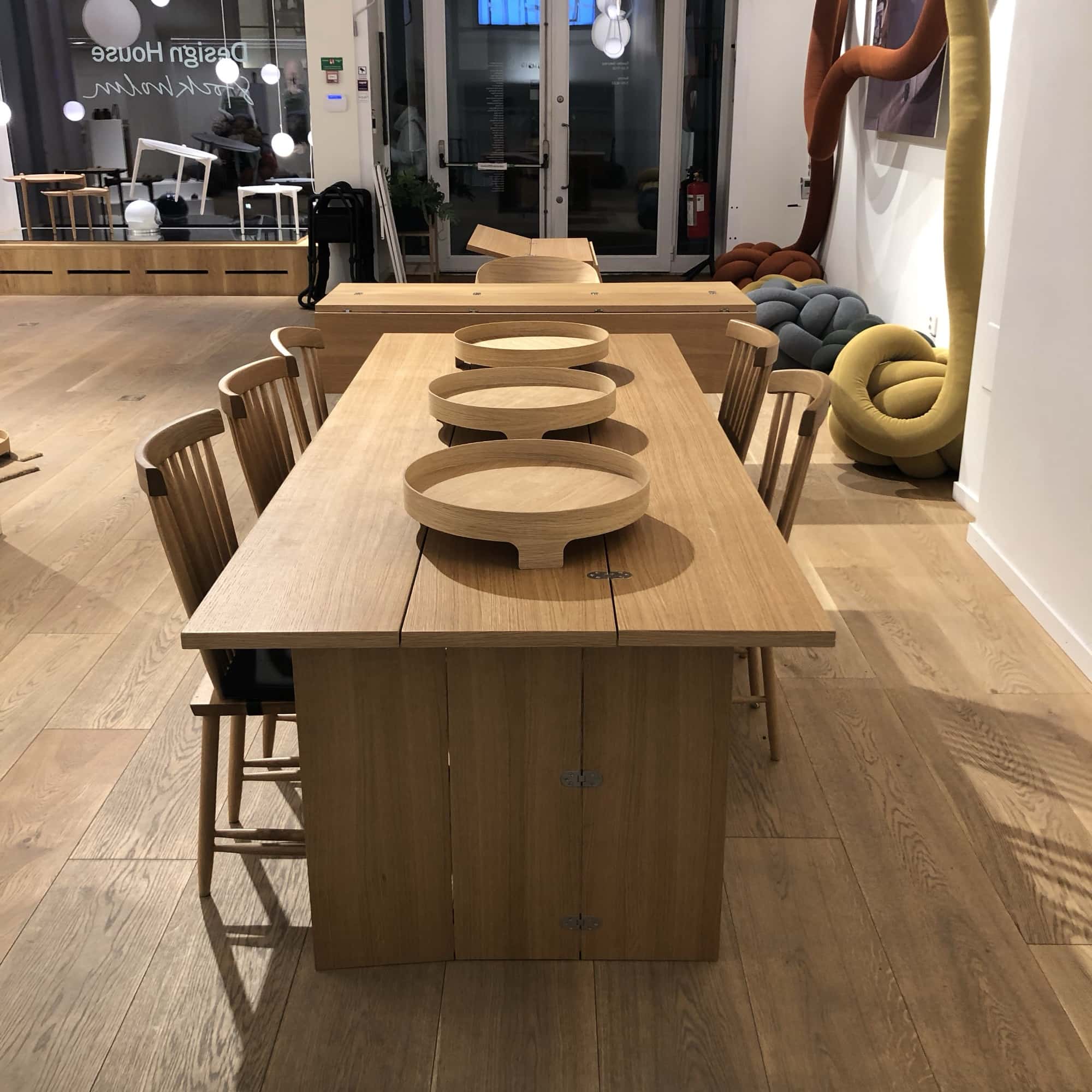 jesper ståhl has solved a problem for many people with a shortage of space. flip table is a folding table that folds in three different sizes. most tables folds once, flip table folds twice from the alongside and as a result, presents distinctive expressions. flip table goes from large, to medium and small. from 90 centimeters wide to 30, makes it attractive for compact living and useful as a dinner table for six, a workspace, or a display table.