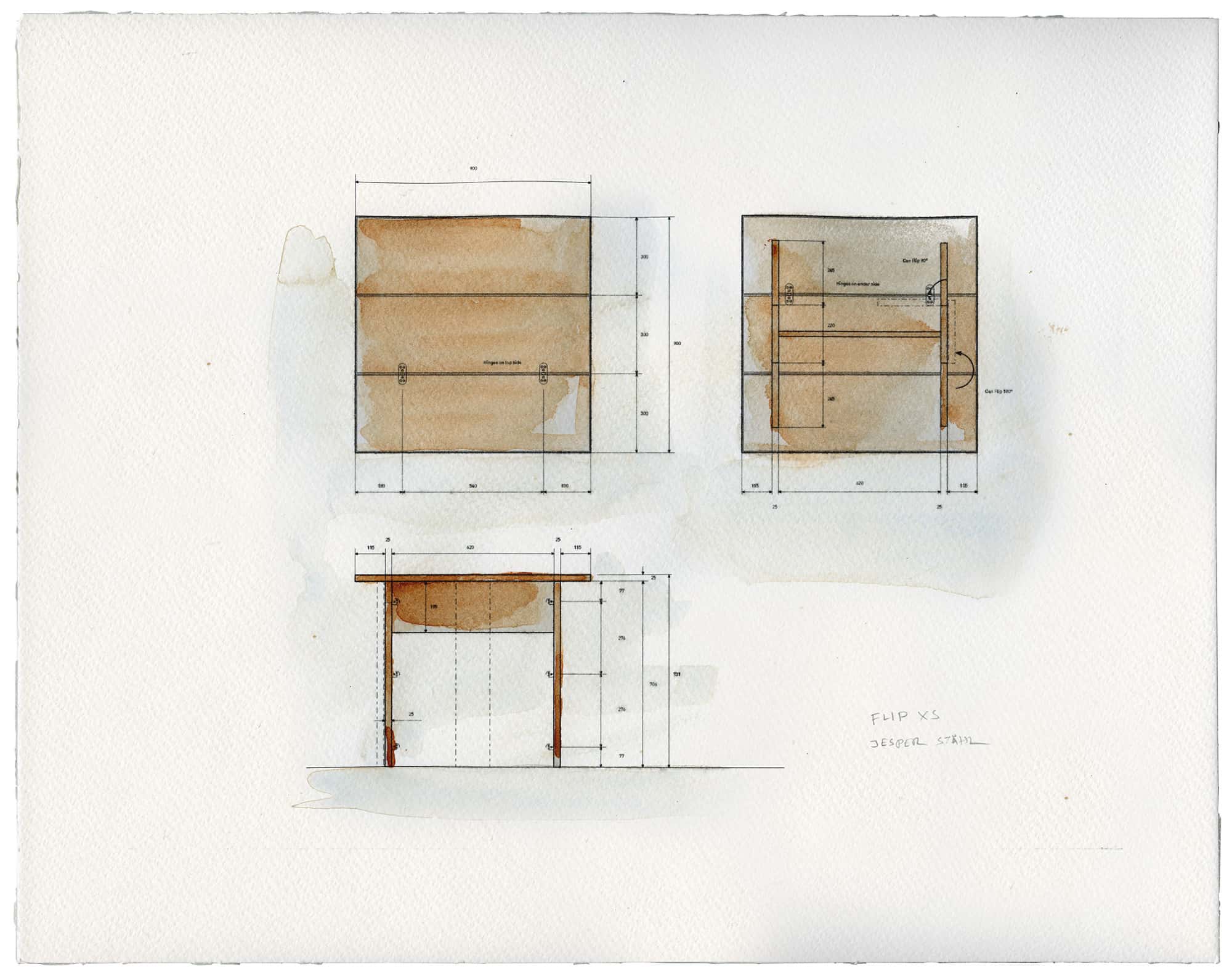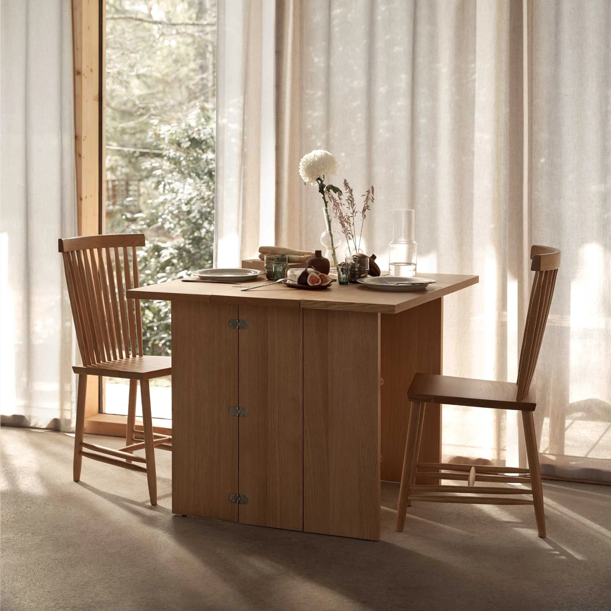 jesper ståhl has solved a problem for many people with a shortage of space. flip table is a folding table that folds in three different sizes. most tables folds once, flip table folds twice from the alongside and as a result, presents distinctive expressions. flip table goes from large, to medium and small. from 90 centimeters wide to 30, makes it attractive for compact living and useful as a dinner table for six, a workspace, or a display table.