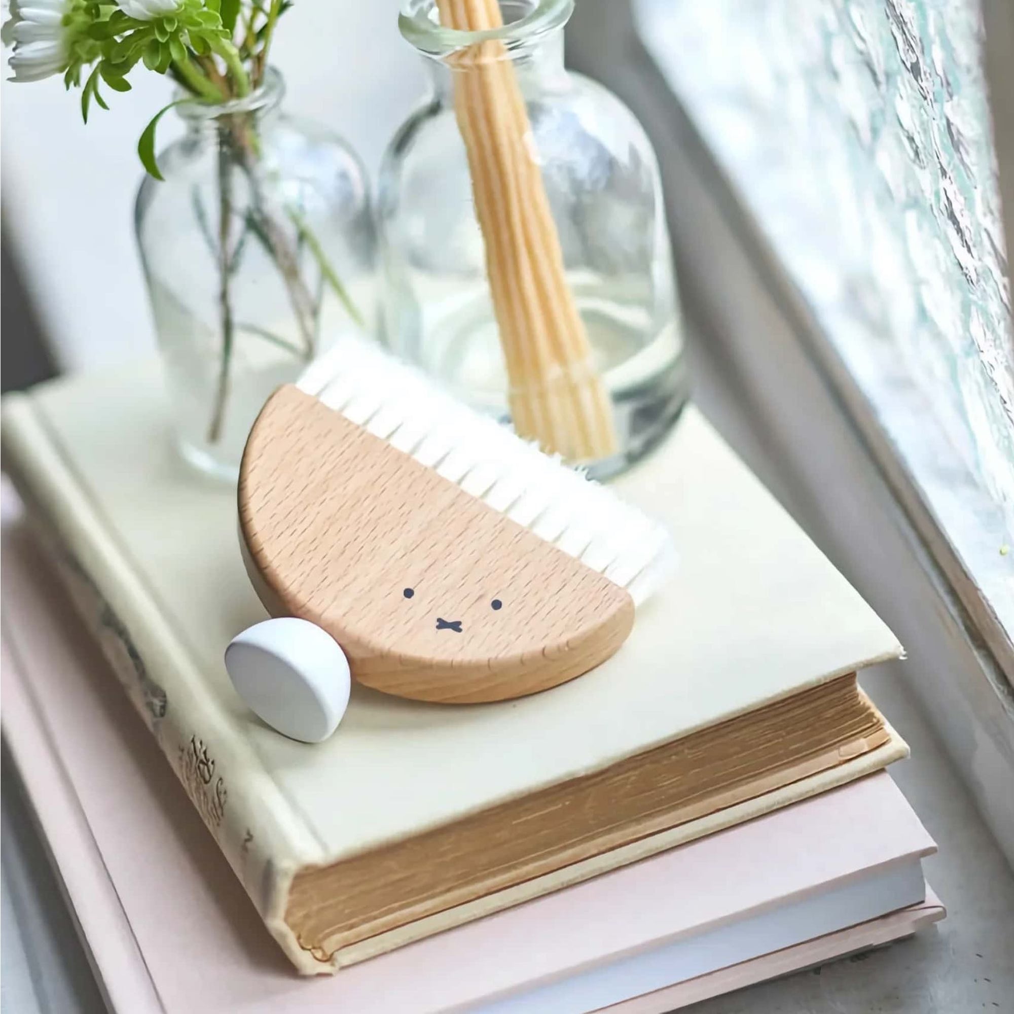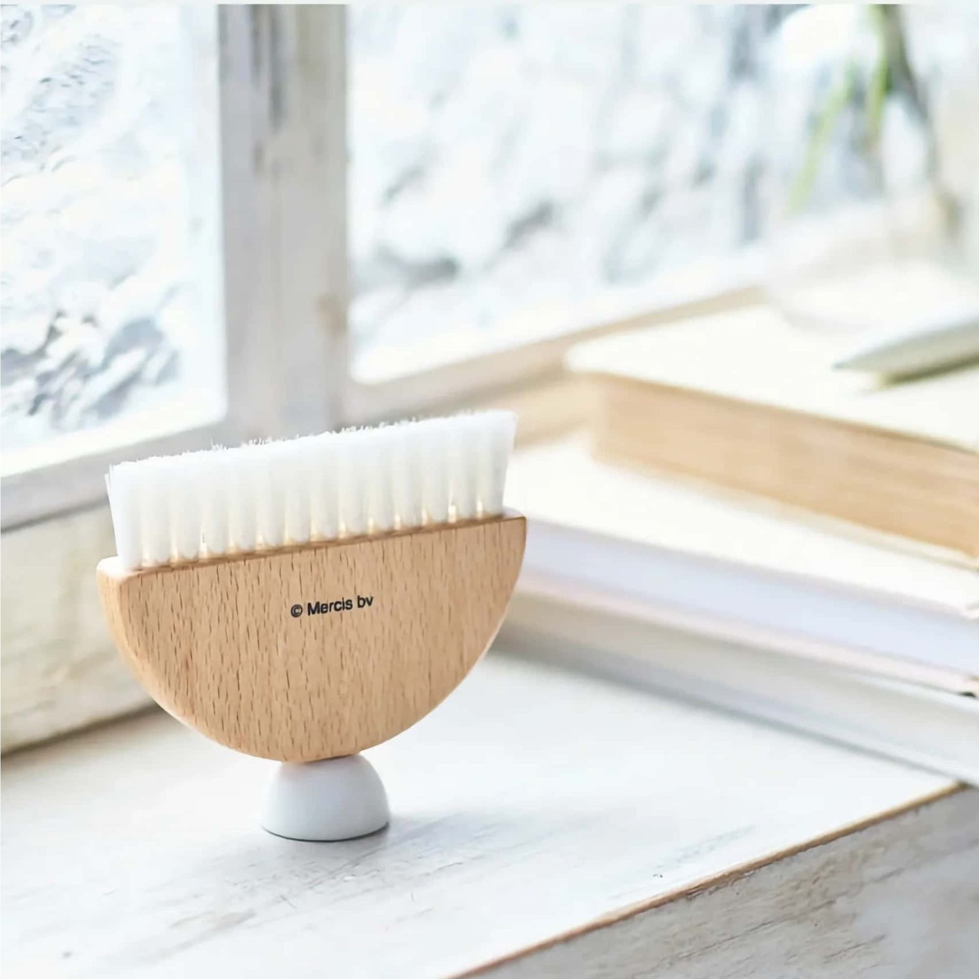 This compact desk brush can be used to clean dust off your desk. It is freestanding and can be placed in a small space such as a desk or entryway.
