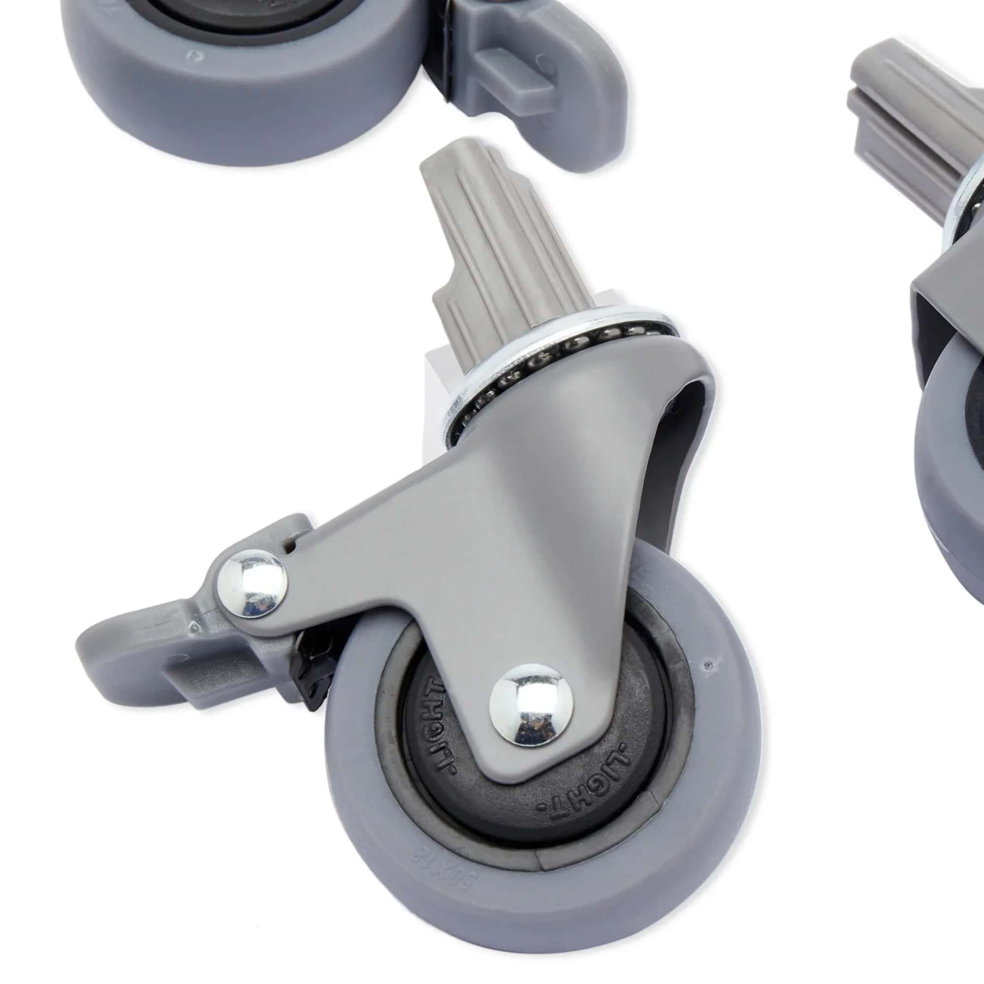 HAY’s medium stacked colour crates just turned into a set of smooth-moving, swivelling drawers with this set of wheels. Specially designed for HAY’s medium-sized colour crates, this set of four plug-in wheels adds effortless mobility and extra functionality to your storage. With two locking wheels for stability, they’re easy to assemble and perfect for creating a versatile, portable storage solution. Whether for home or office, these wheels make your vibrant, stackable crates even more practical and adaptable.