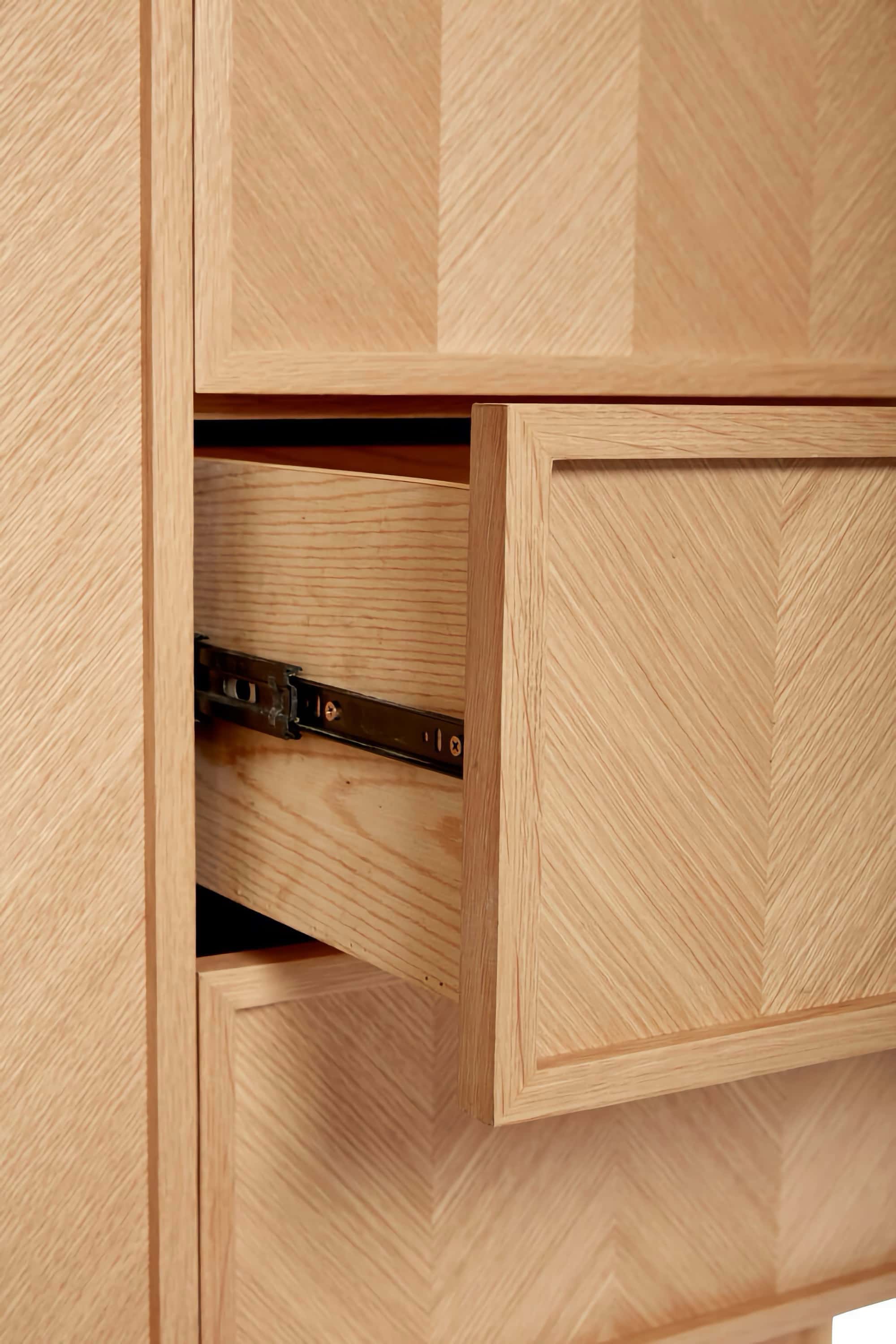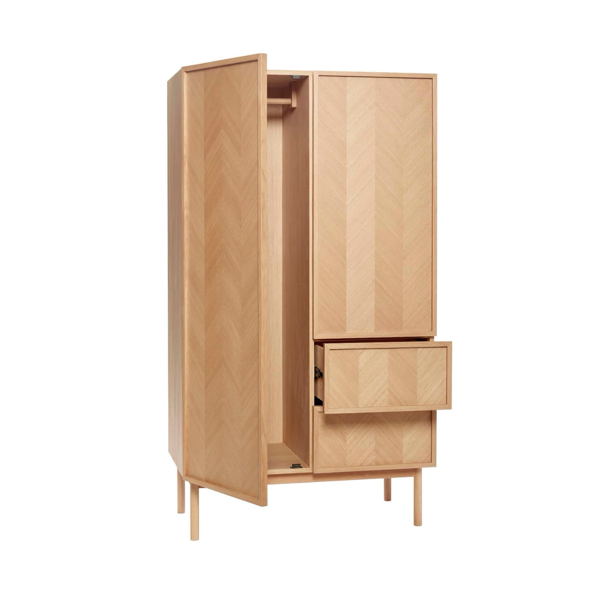 Introducing the Herringbone Wardrobe. Crafted from FSC certified Oak veneer and Oak wood, this wardrobe is the perfect addition to any bedroom. Highly durable and stylish, its herringbone pattern makes it a unique and eye-catching piece of furniture. It comes with plenty of storage space for all your clothing needs and is easy to assemble. Add a touch of sophistication to your home with this beautiful wardrobe.
