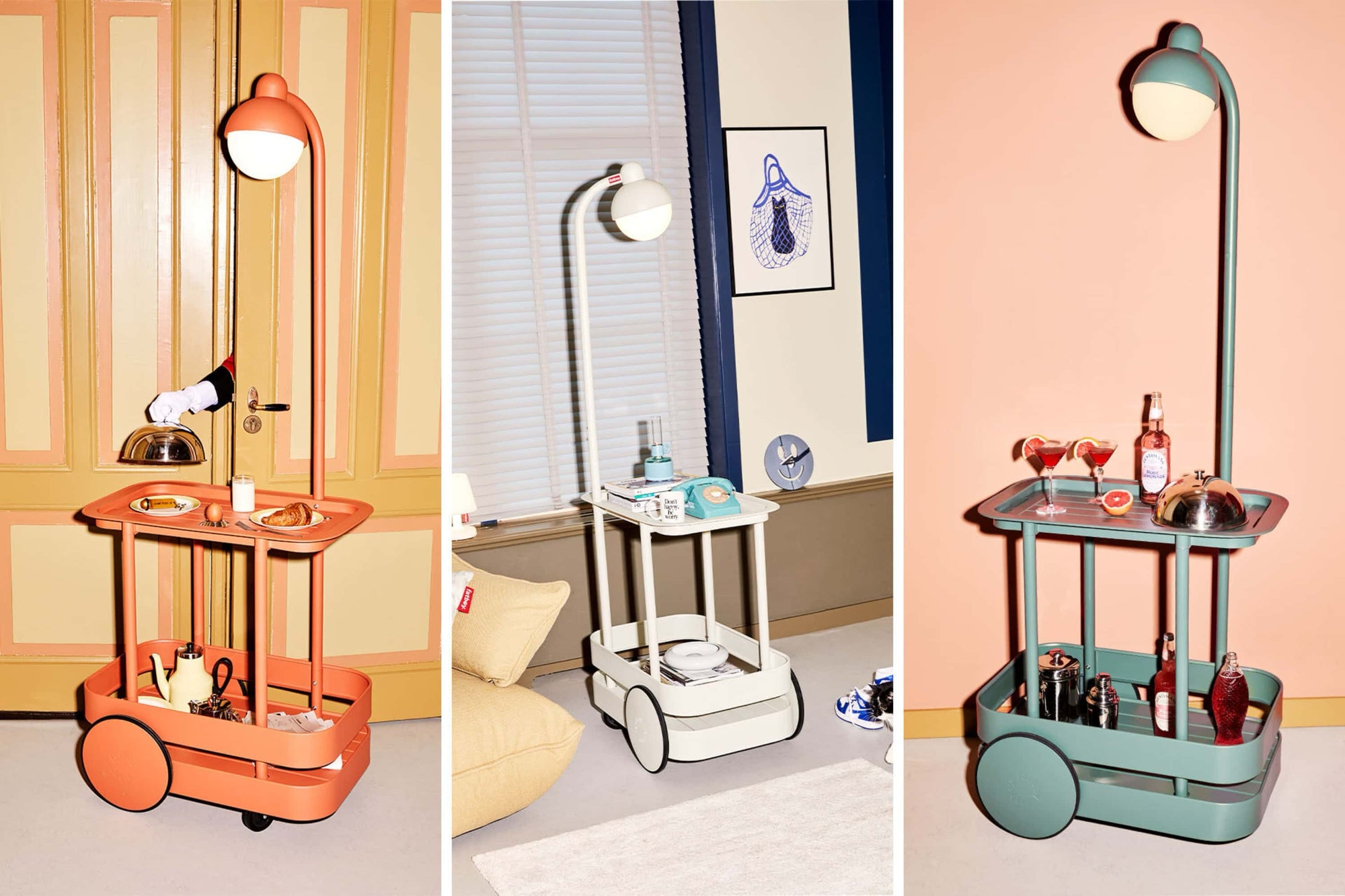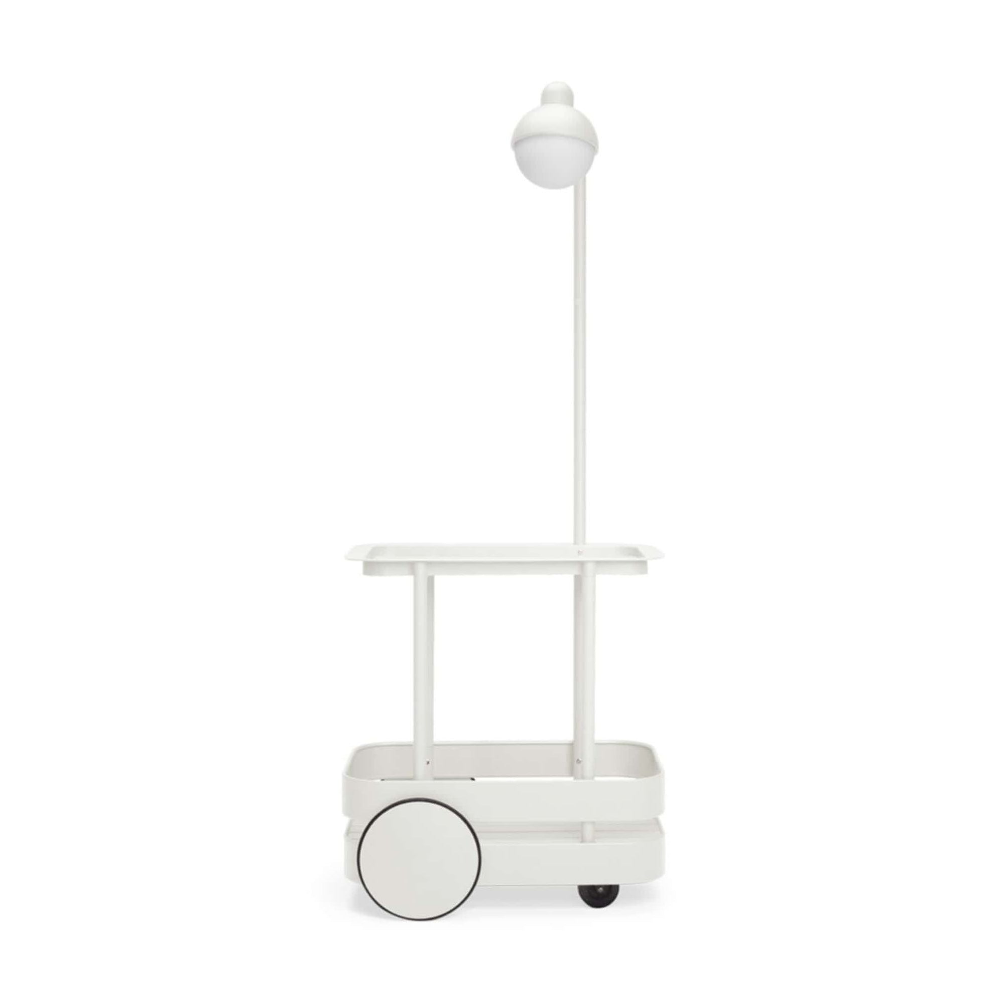 The Jolly Trolley made of aluminum is a real design highlight on wheels. Its upper part is a removable tray, which can also be used separately. The LED lights are dimmable to perfectly adjust the atmosphere.