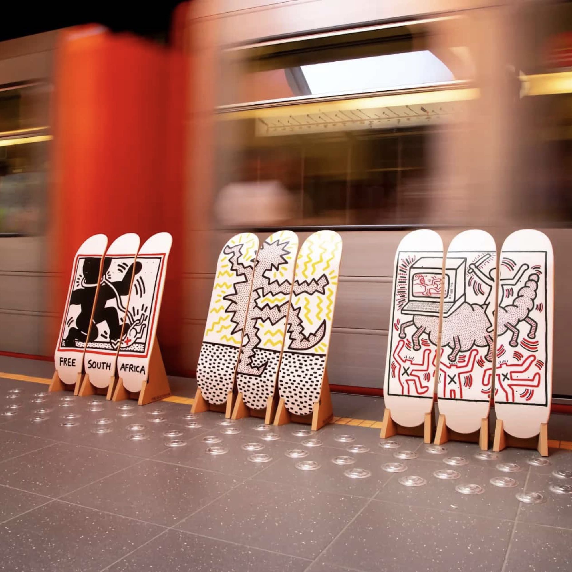 This piece features the iconic Untitled (Electric) artwork on skateboard decks by Keith Haring, as part of THE SKATEROOM’s 2022 collection. Throughout his career, Keith Haring produced murals, sculptures, and paintings to benefit hospitals, groups for underprivileged children, and various community health organizations. Before his death, Haring established a foundation in his name to maintain and enhance his legacy of giving to organizations for children and AIDS. The foundation is also committed to sustaining and expanding public awareness of Keith Haring.