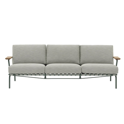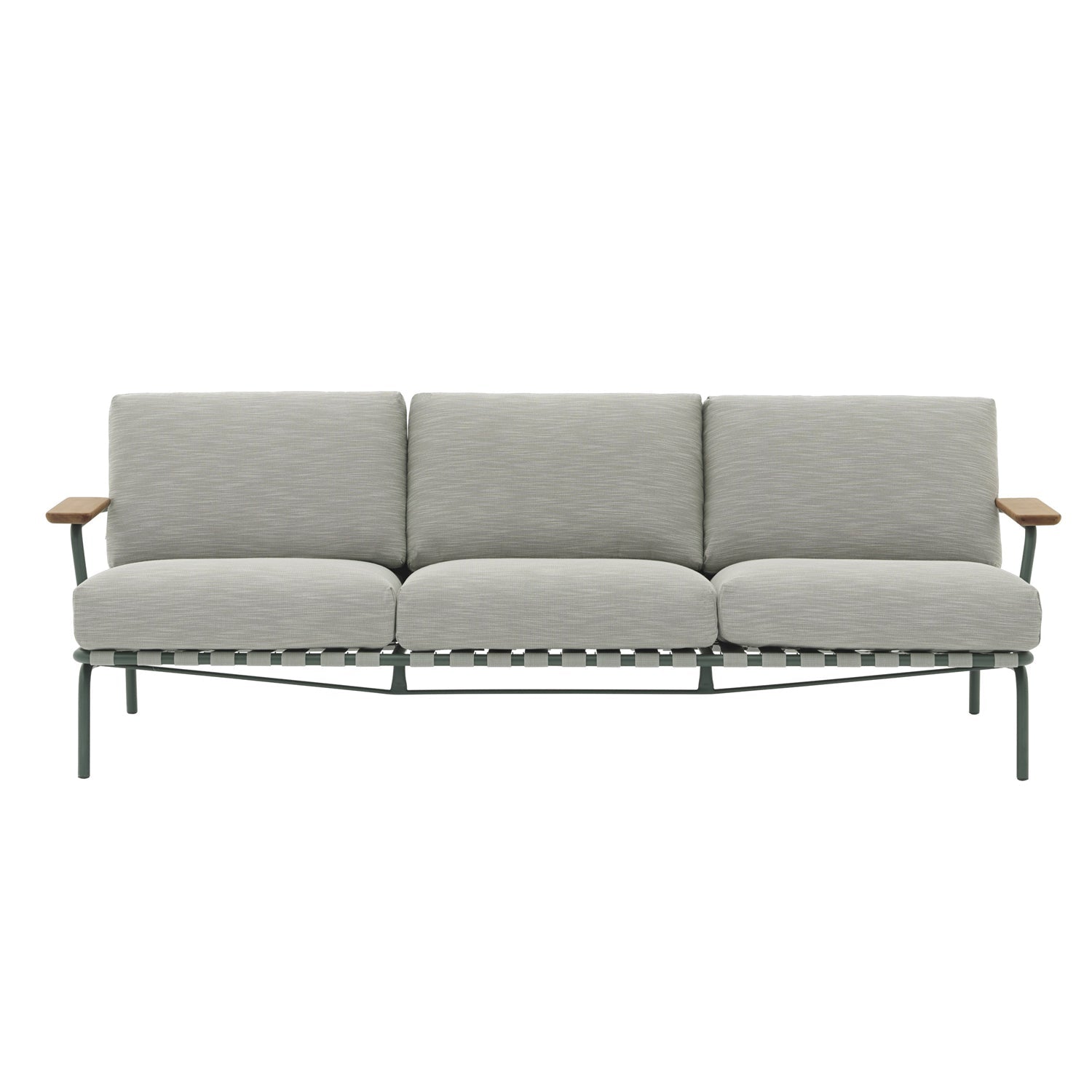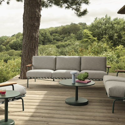 The armrests of the Settle Sofa are beautifully made from FSC™-certified sapele mahogany wood, providing a warm, natural touch to the sleek metal frame. This contrast not only enhances the sofa’s visual charm but also offers a tactile richness that invites you to relax and enjoy the outdoors.