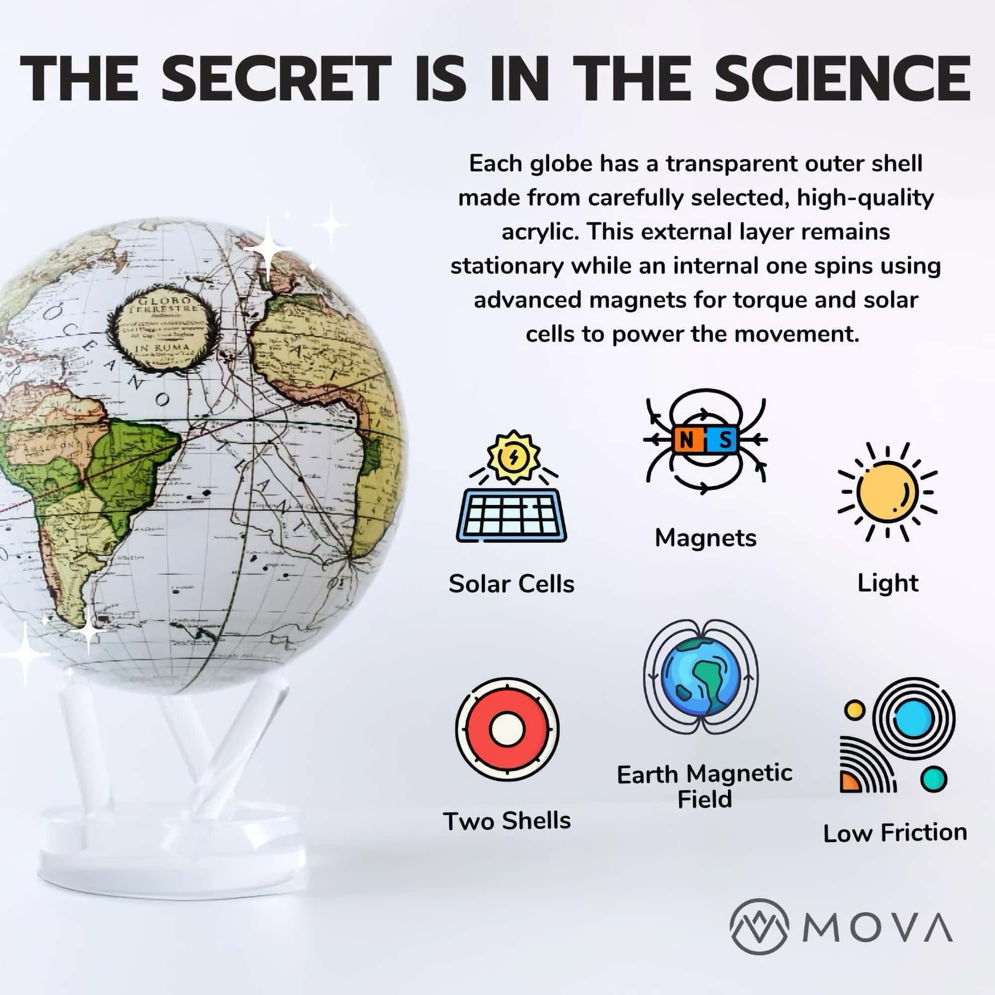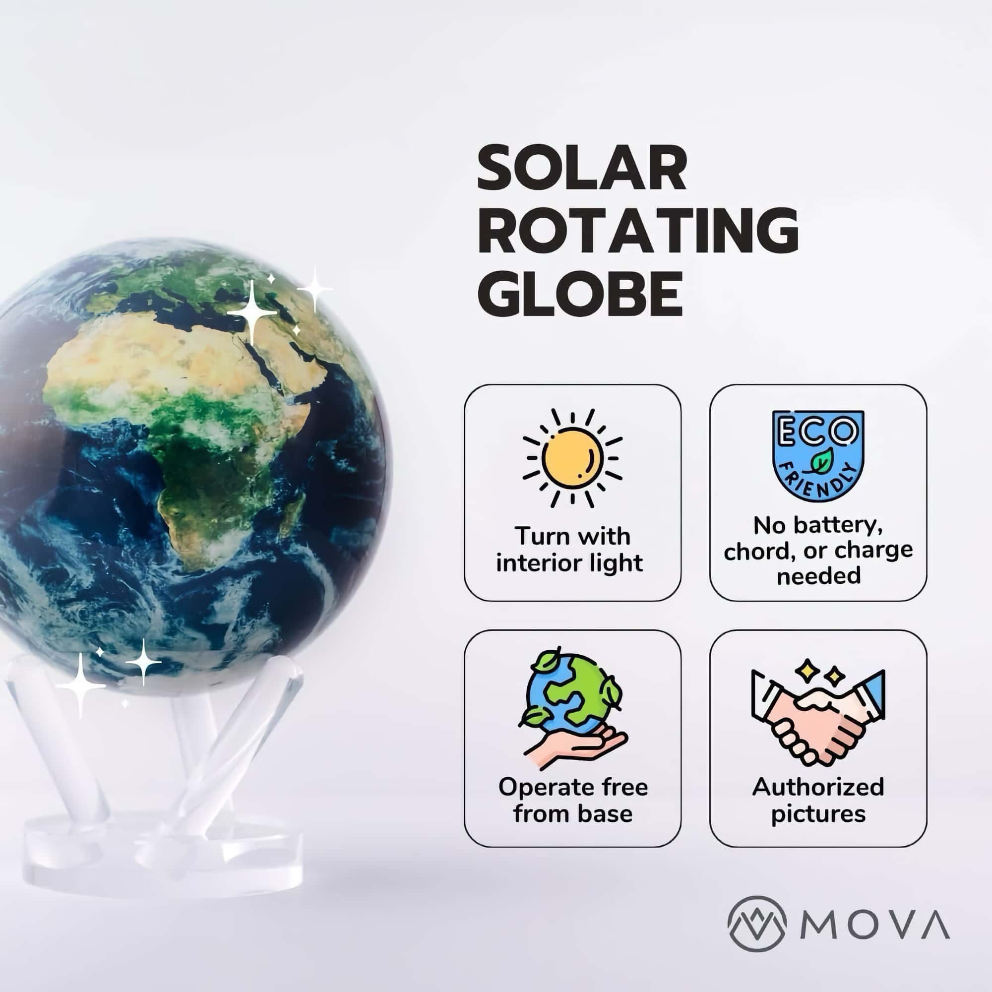 the beautiful mova rotating globes are known for their innovative solar cell technology, which enables them to spin independently when exposed to light. without needing batteries or power cords, only natural or artificial light is required to start the mova globe's rotations. - turns using ambient light - hidden magnets provide movement - no cords or batteries material: magnet, acrylic shell and base dimension: dia. 11,4 cm (without acrylic base)