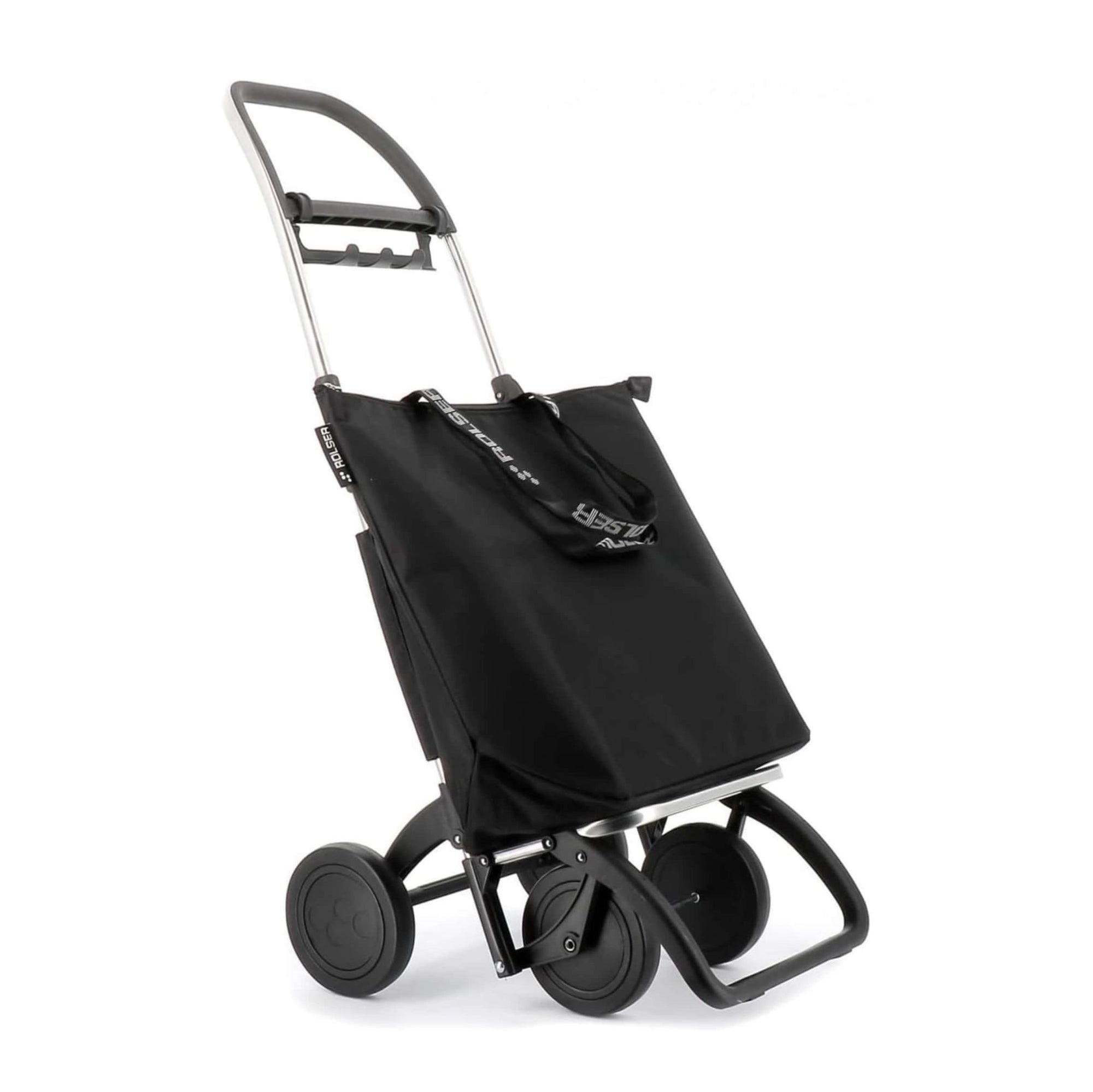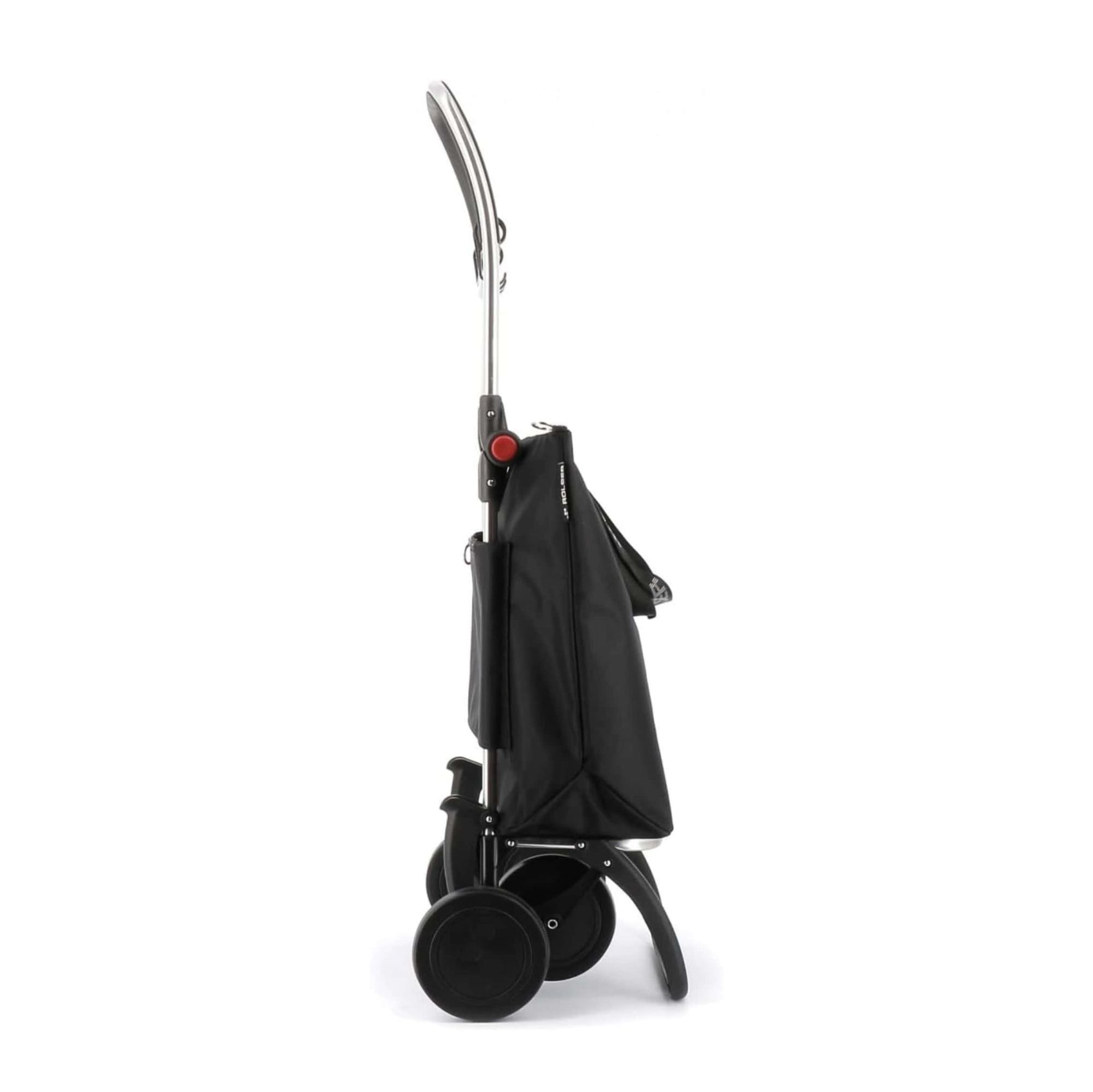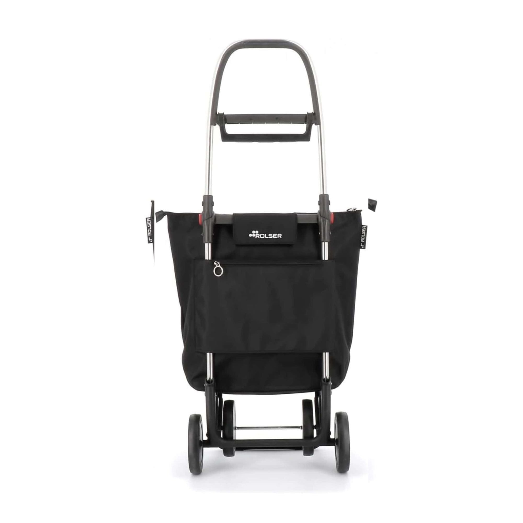 Rolser folding trolley made of aluminium with 2/4 wheels, to prevent the user from carrying the weight of their purchase. In two wheel position to carry behind when empty, and pushing forward when filled with 4 wheels. The 4L chassis has a forward folding system for complete folding. Multi-function hook for attaching to the trolley of the super and also for attaching to bags and/or other products. Trolley with independent bag and easily removable, to have the possibility of using it as a bag without the need for the chassis. The MINI BAG PLUS bag has a zip closure, double inner pocket and interior folding system with drawstring closure, which increases its capacity.