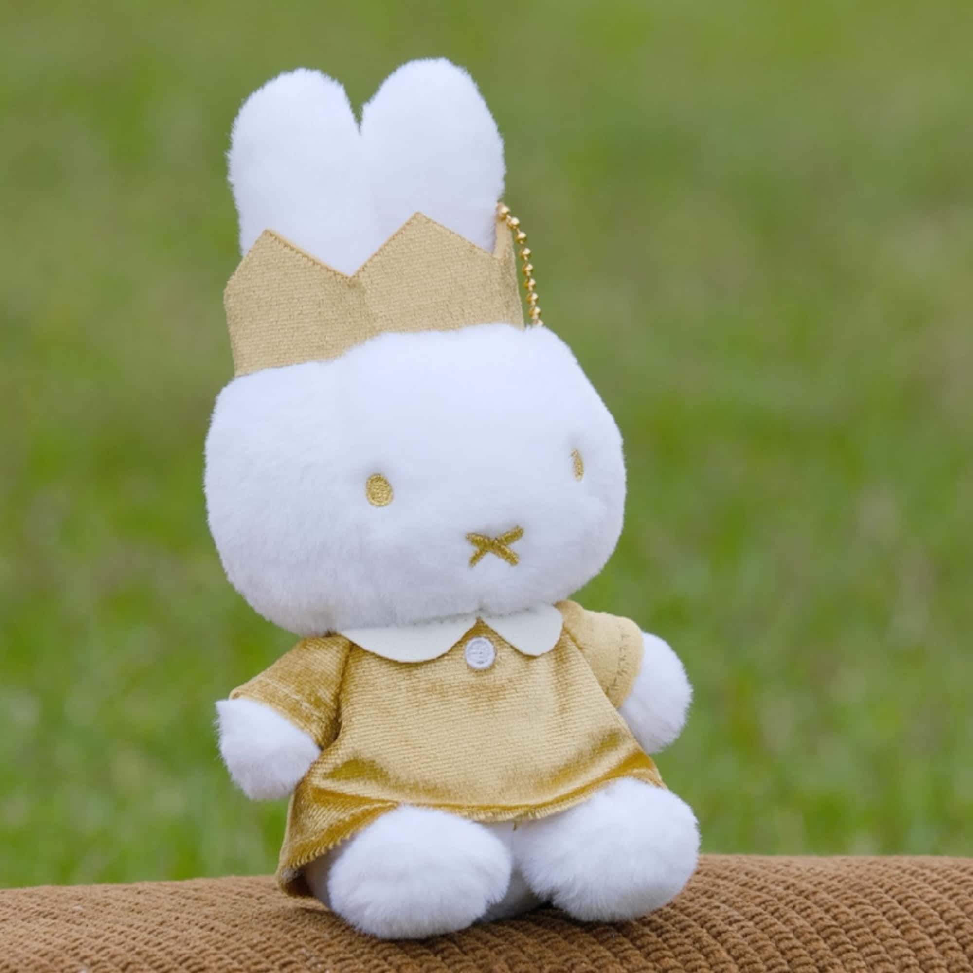Miffy celebrates 70 years of charm in this exclusive anniversary edition. Dressed in luxurious gold with a matching crown, this plush mascot captures the spirit of the milestone year. The black tag stamped with gold "miffy70" marks the occasion. Equipped with a ball chain, clip it to your bag or keychain to carry this beloved character wherever you go.
