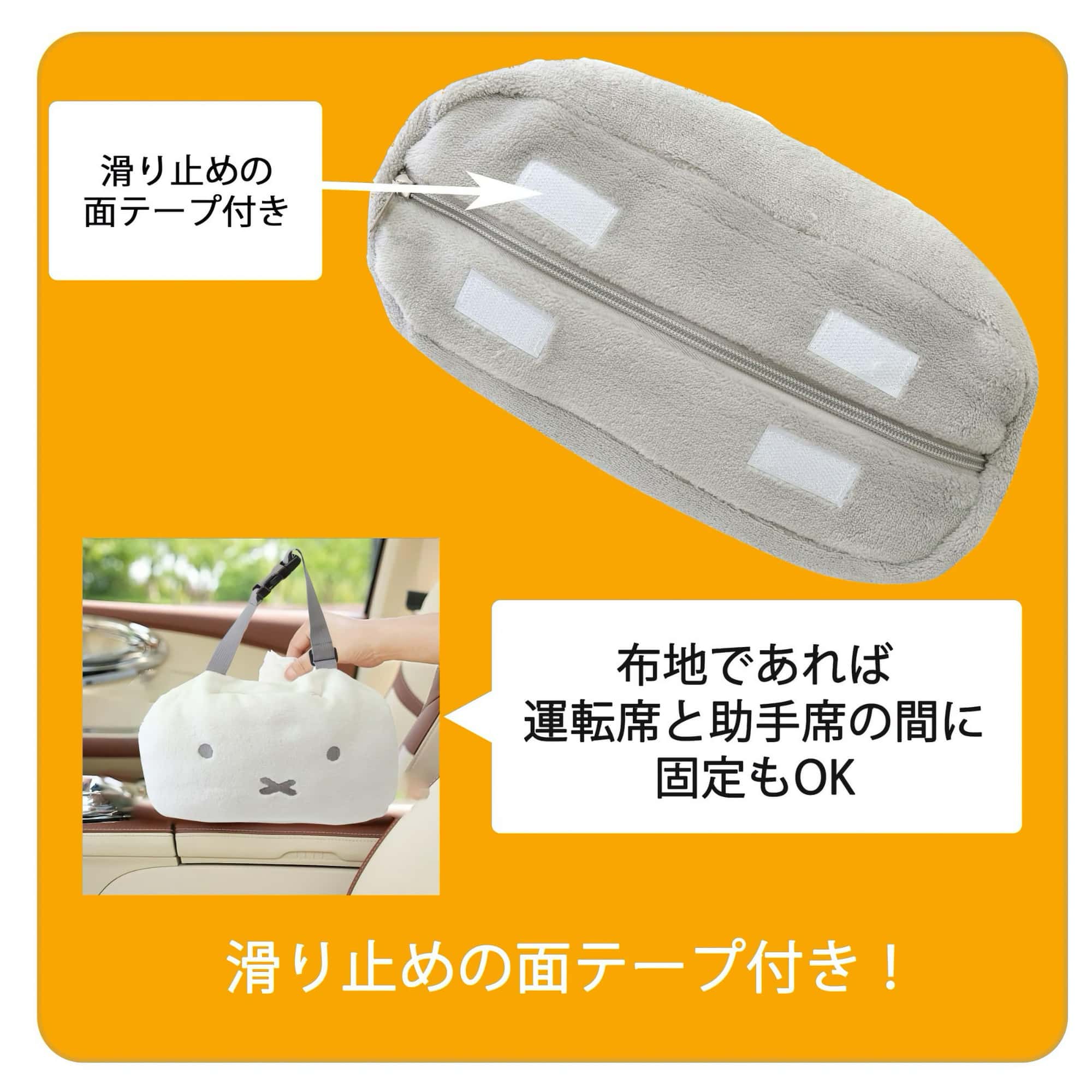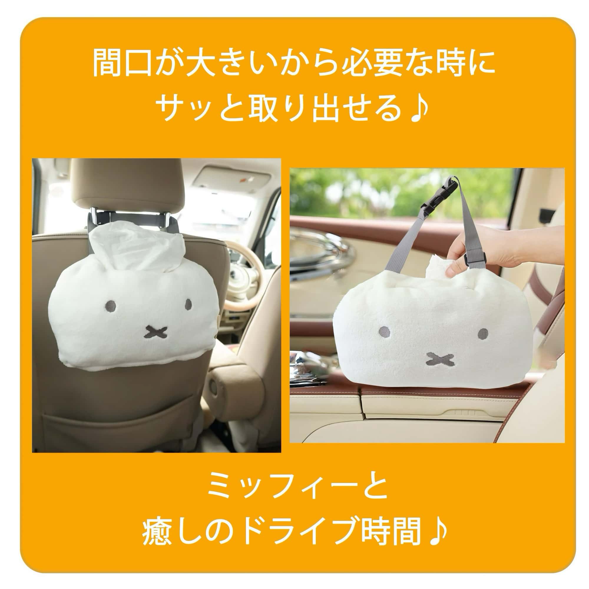 Soft plush tissue case designed to hang from your car's headrest. Features the iconic Miffy character in white, adding a touch of charm to your vehicle interior. Practical and adorable—keep tissues within easy reach during drives.
