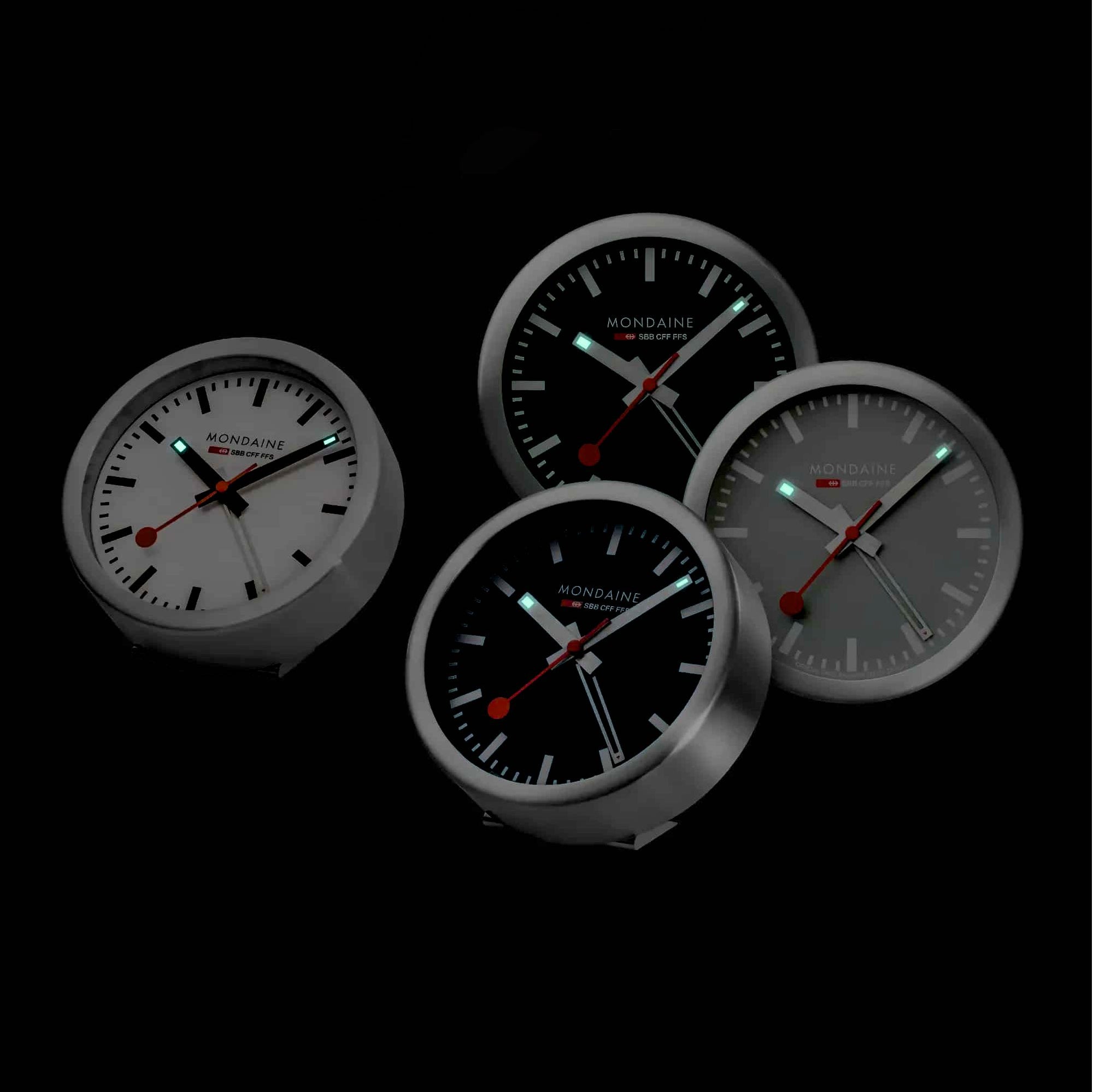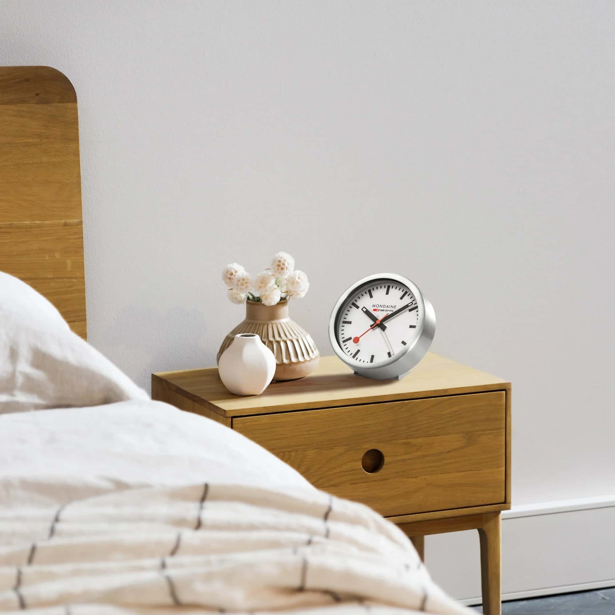A statement on your desk. The classic design from the Mondaine Swiss Railways Clock is available for your office desk too. This Mondaine Clock impresses with its puristic and minimalistic design of the dial with the prominent red second hand. With its 125mm diameter and the aluminium casing, it blends beautifully in every room and can actually be set up on a table or on the wall. Thanks to the built-in alarm feature, you’ll never miss a meeting again.