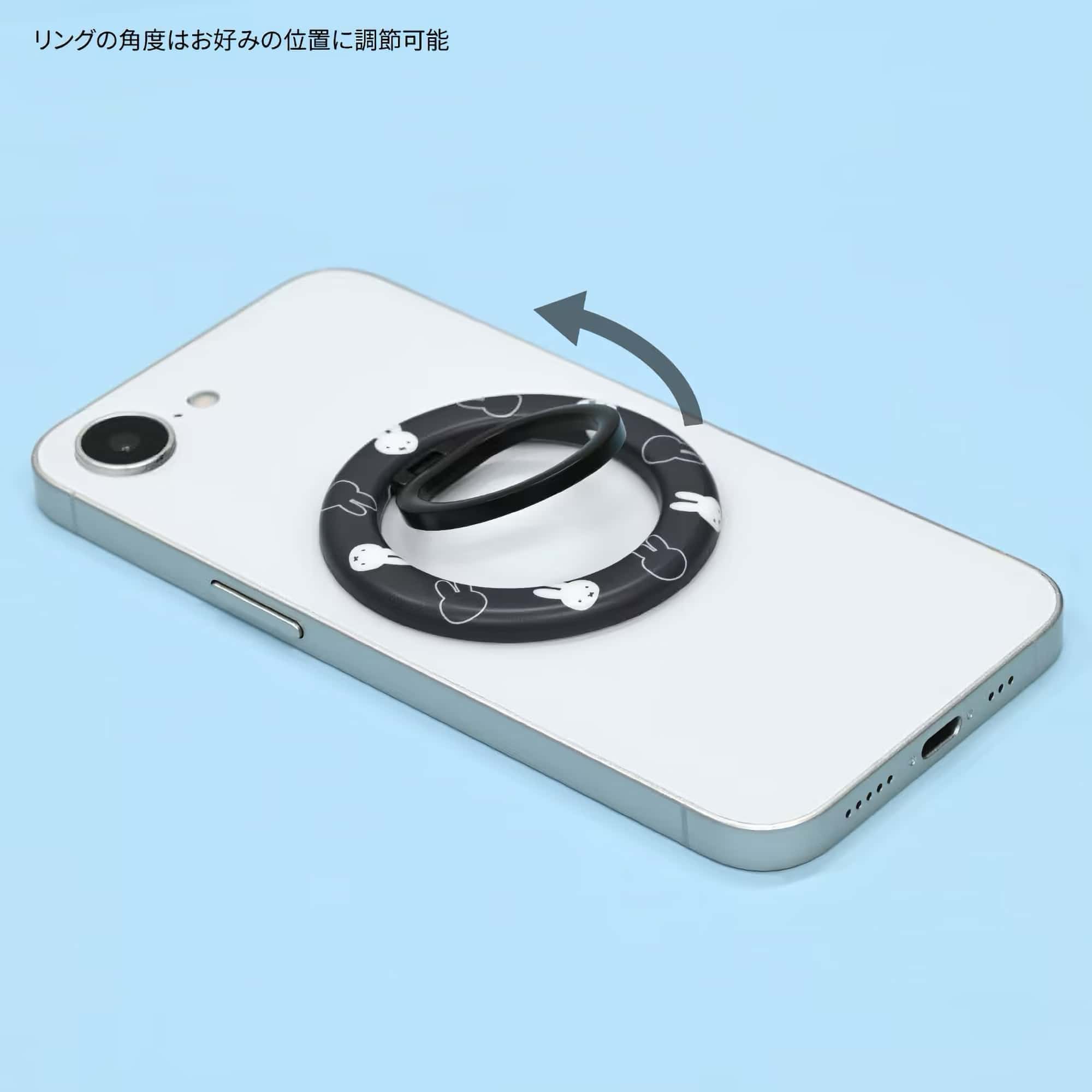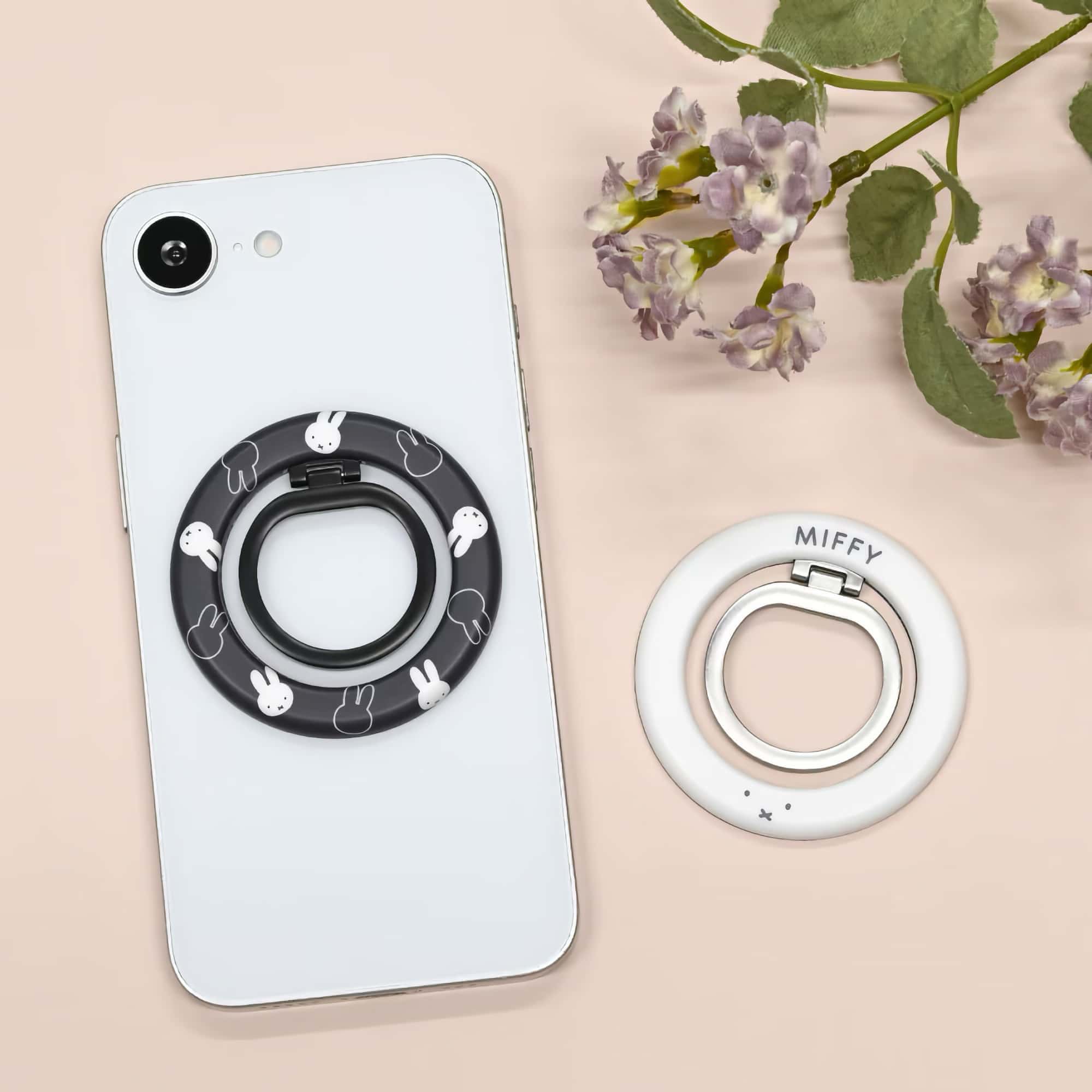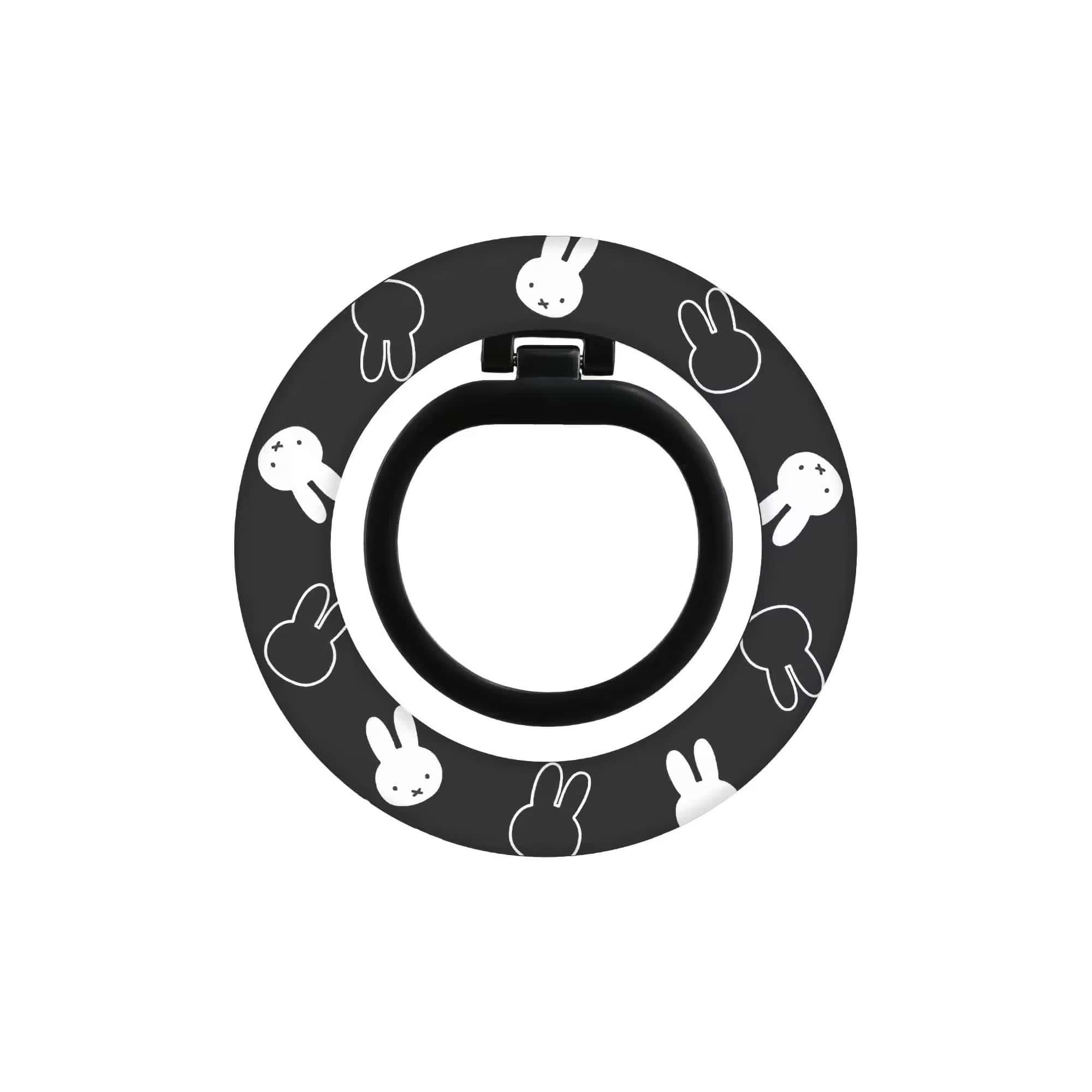 Miffy MagSafe multi-ring in sleek black — a premium smartphone accessory designed for MagSafe-compatible iPhones and cases. The ergonomic ring fits comfortably around your finger, enhancing grip and reducing the risk of accidental drops. Adjust the ring's angle to transform it into a convenient stand for hands-free viewing. Magnetic attachment ensures effortless installation and removal without adhesive residue.