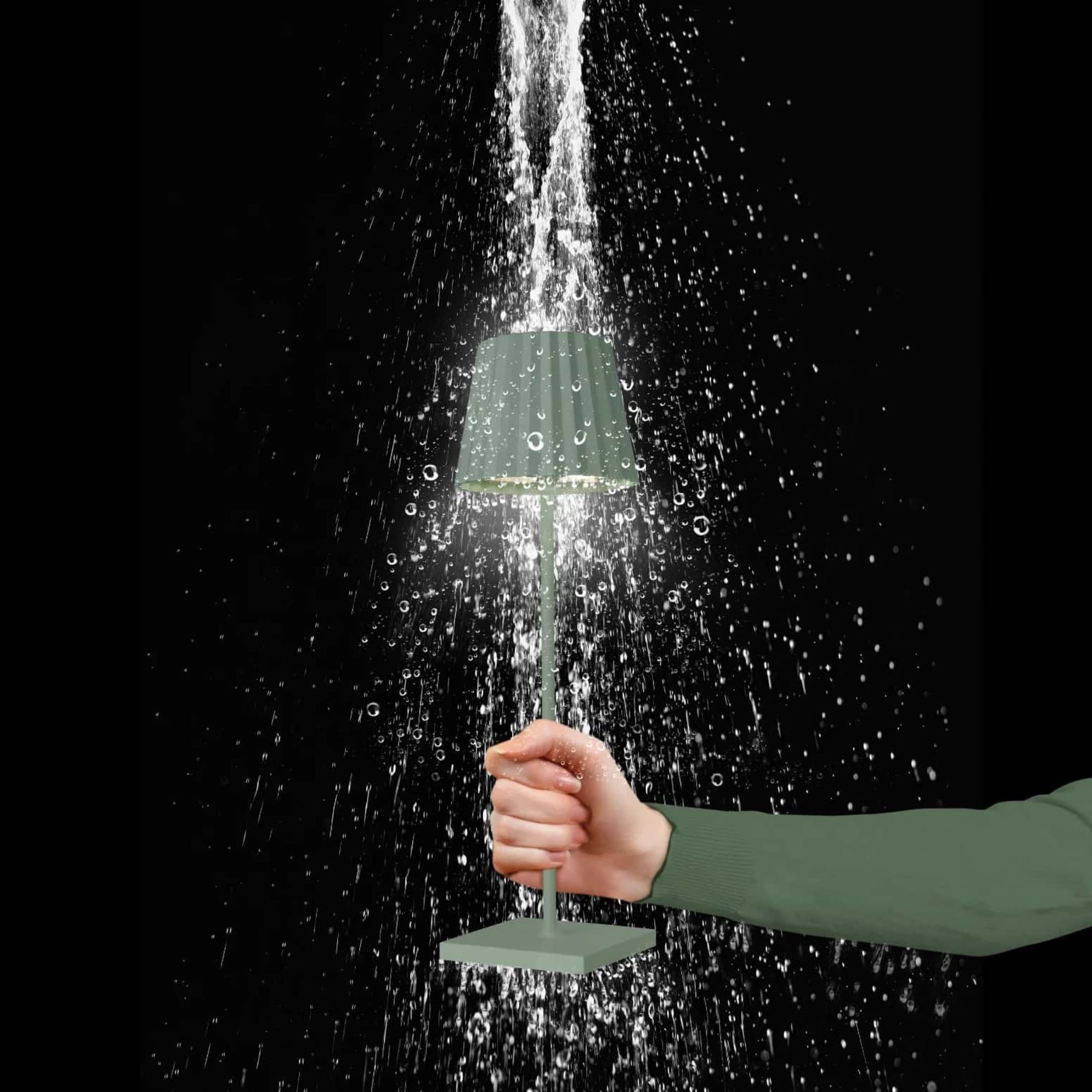 TROLL 2.0 - the outdoor table lamp with the unmistakable pleated shade. Made of aluminium and coated in various colours and patterns, the TROLL 2.0 can be used indoors and outdoors thanks to its IP54 classification. The powerful rechargeable batteries provide up to 24 hours of wireless light. Via the touch sensor on the top of the luminaire, the luminaire can be dimmed continuously and selected between two warm white light colours. The TROLL 2.0 can be recharged in the blink of an eye via the supplied charging station.