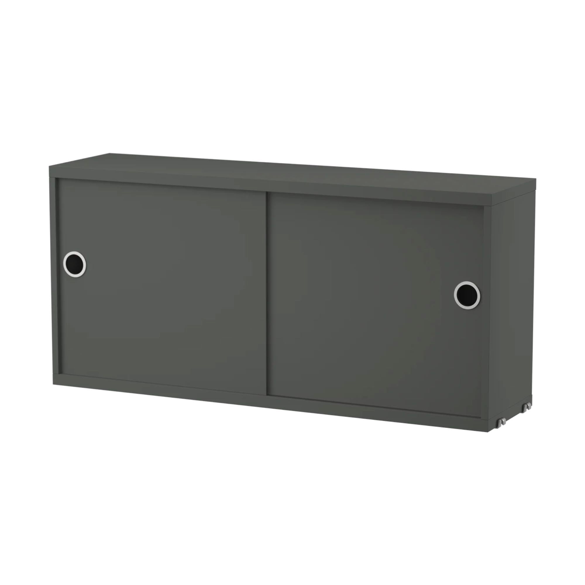 The String cabinet features two sliding doors, and it is suitable for the String System floor and wall panels with a depth of 20 cm.