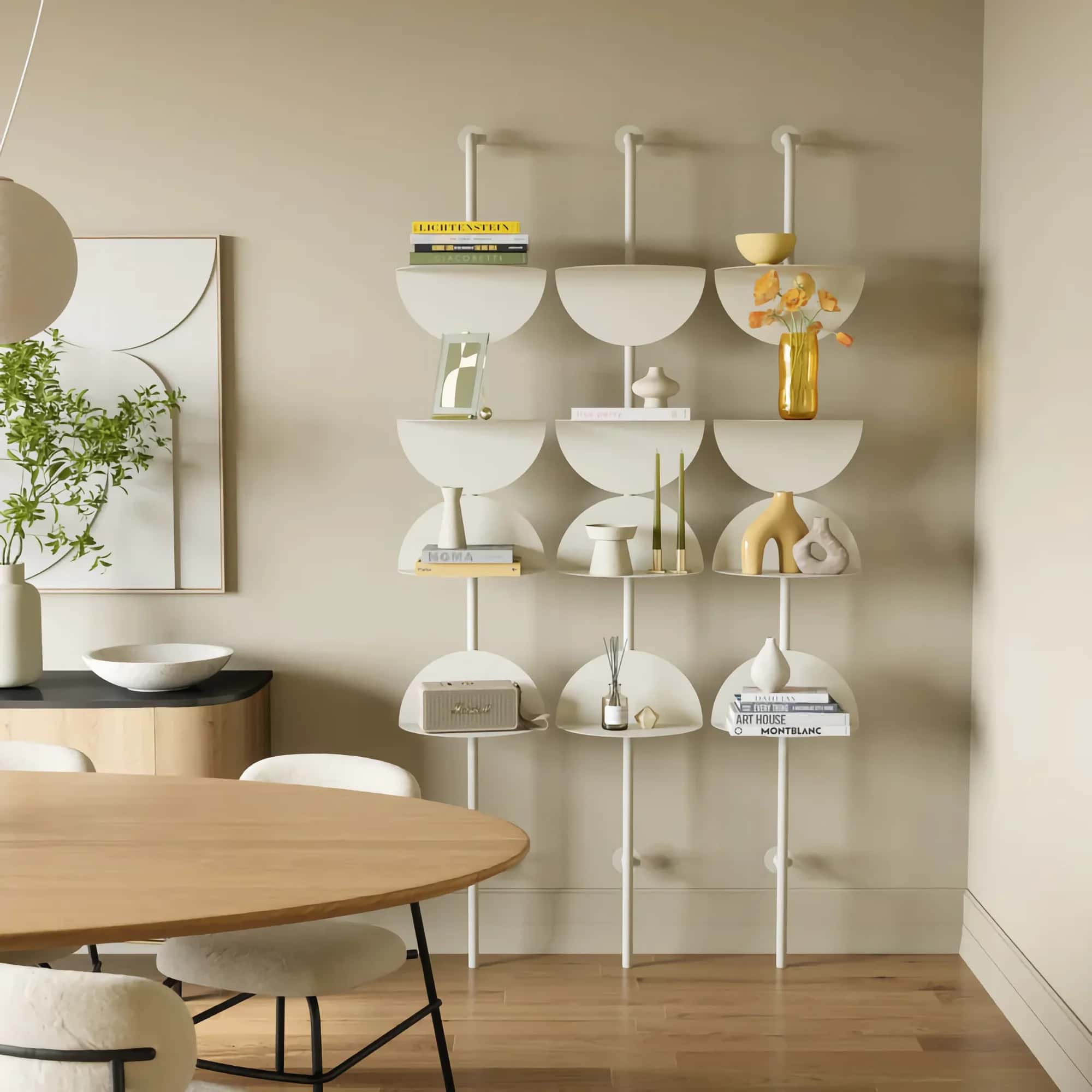 Introducing the Solis Shelf: an eye-catching and versatile solution to elevate your display game. Crafted with precision, this set features four half-circle steel shelves elegantly mounted on a pole that effortlessly integrates with your space. The innovative design offers flexibility, allowing you to choose between two mounting options for each shelf: half-moon facing up or down. Plus, customize the spacing between shelves to perfectly showcase your favorite items, whether at home, in retail displays, or at trade shows. Constructed from durable bent steel, each shelf supports up to 15lbs. (6.8kg) of your prized possessions. Use multiple shelves to create your own customized eye-catching statement. Measures 13.88 x 10.5 x 80.13" (35 x 27 x 204 cm).