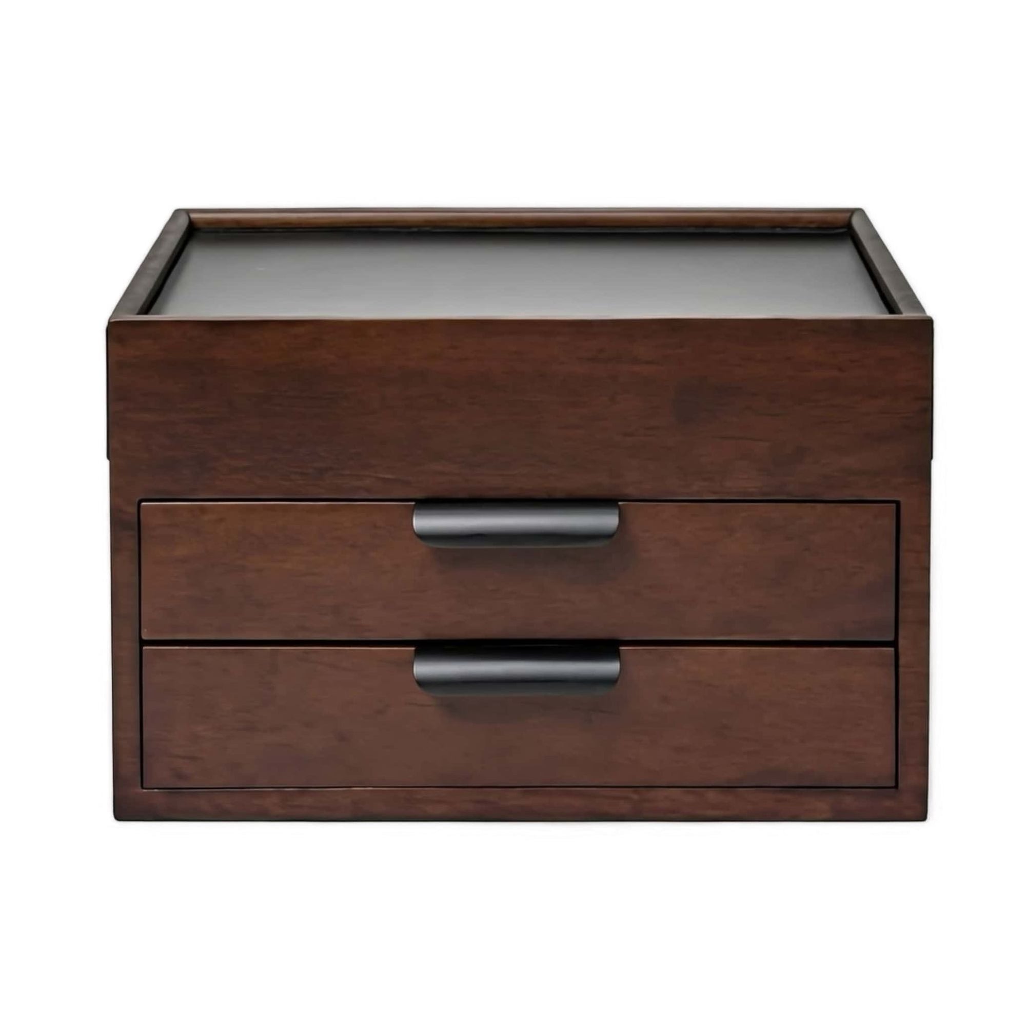 Elegant wood and metal jewelry box with three velvet-lined drawers and a sliding metal lid that doubles as a display surface. Features a dedicated ring pillow accommodating up to 24 rings, hoops, and studs, plus a hidden compartment for securing valuables. Compact dimensions (31.8 × 22.9 × 19.1 cm) make it ideal for bedside tables or dressers. Combines minimalist design with practical storage for everyday jewelry and keepsakes.