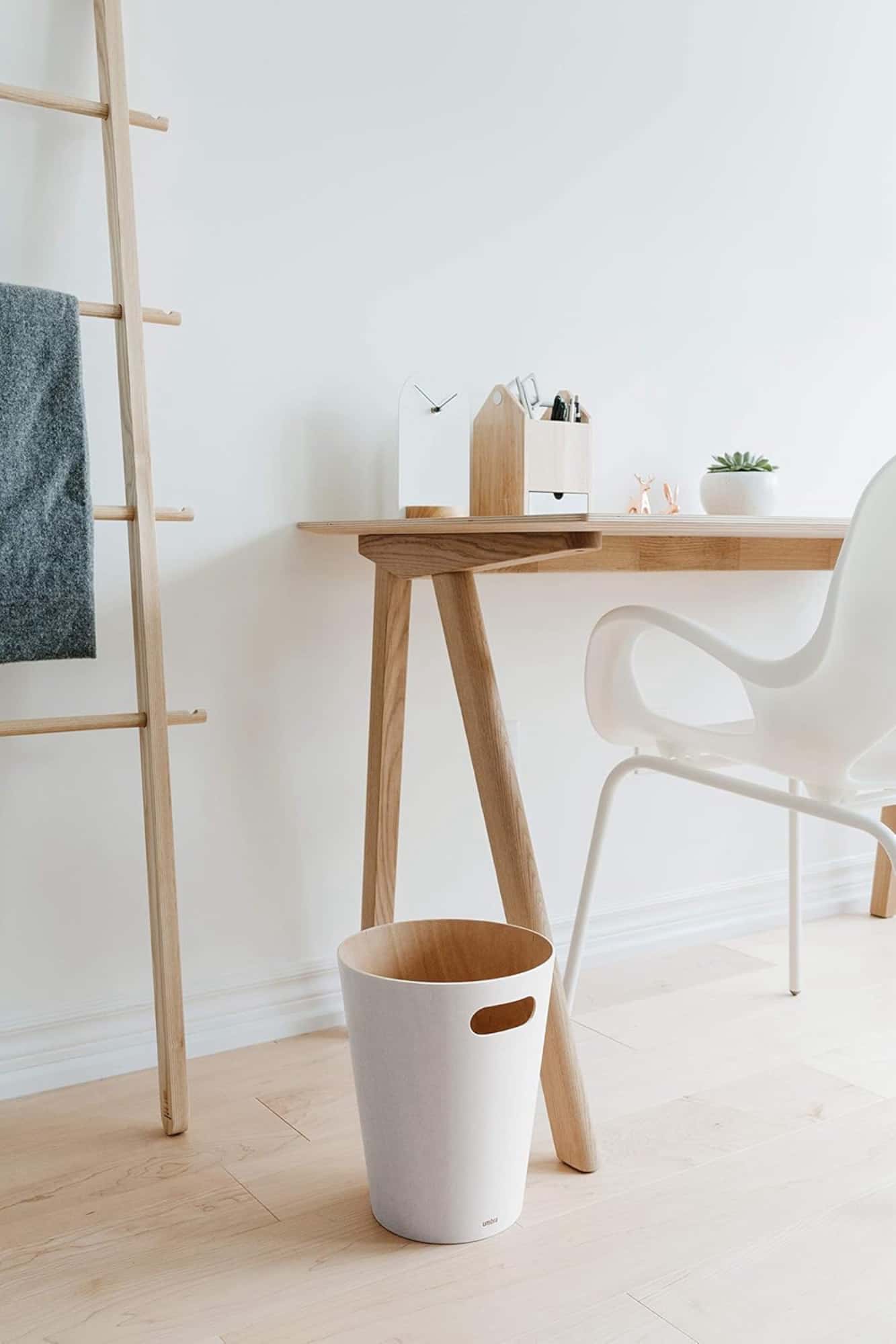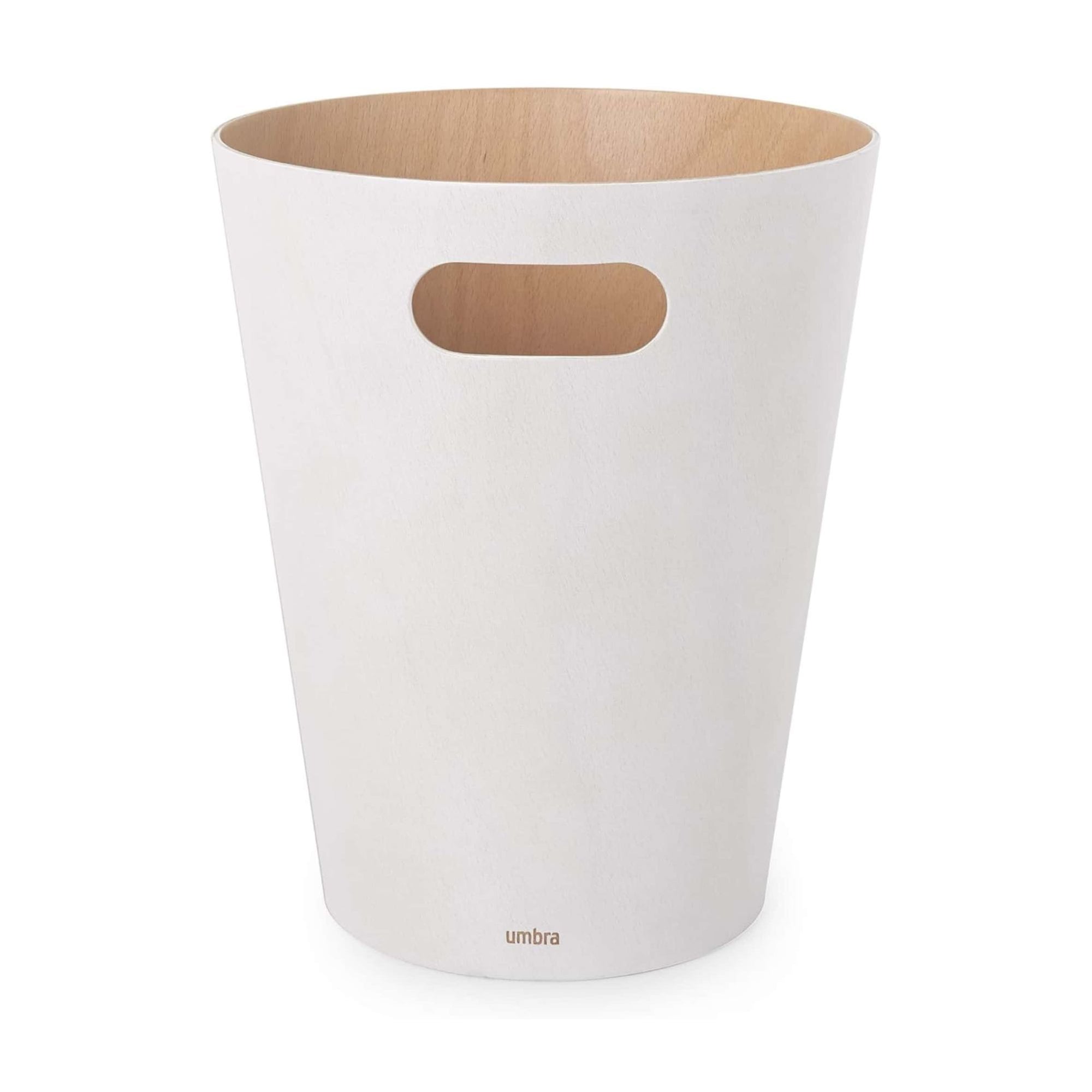 Upgrade your space with Woodrow, a modern waste can that adds both style and function to any room. Its sleek two-tone design, featuring a natural wood interior and a stained exterior, creates a warm and inviting atmosphere. With its integrated handles, Woodrow is easy to move, making disposal quick and effortless. The unique curved shape turns this everyday essential into a decor piece that stands out. Perfect for compact spaces like powder rooms, offices, or studies, Woodrow offers a 2-gallon (7.5L) capacity in a compact design. For best care, use a bag liner or avoid putting wet items directly against the wood surface.
