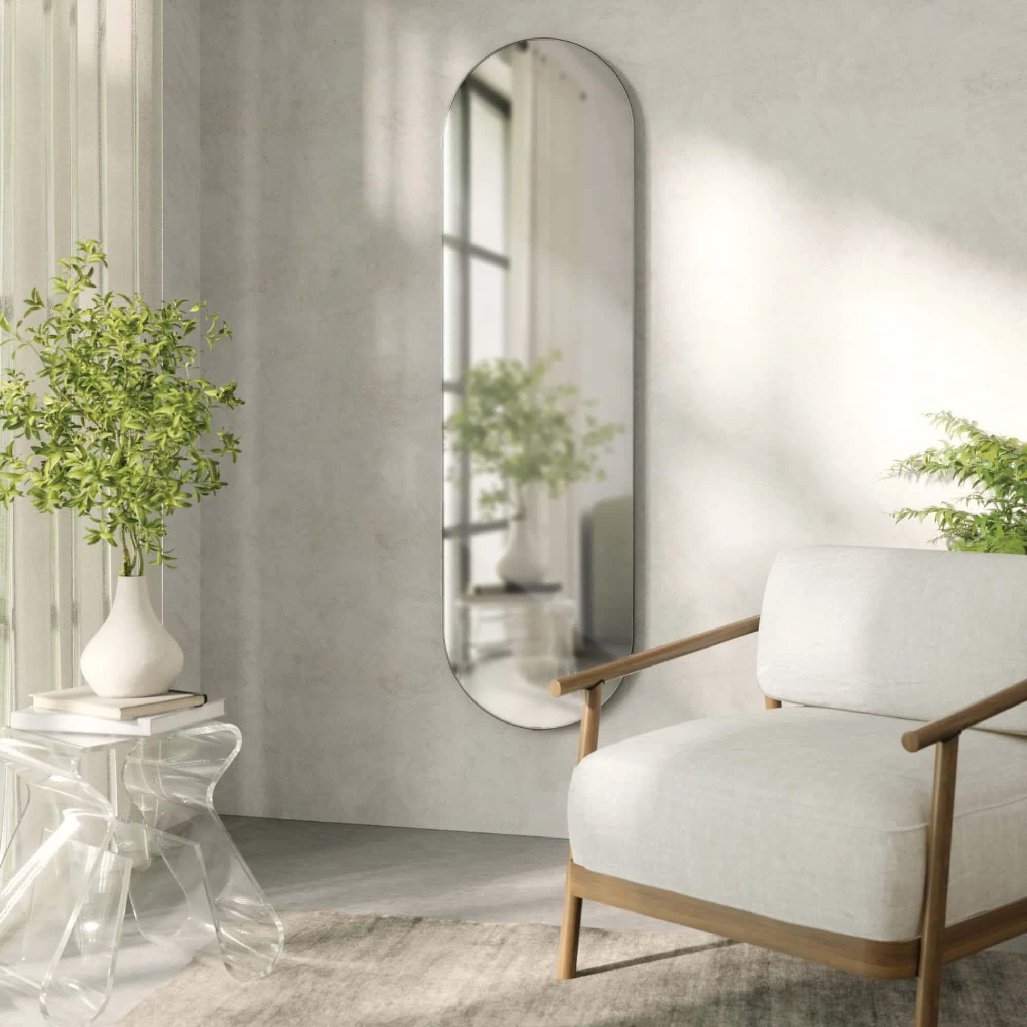The Hubba Pill Mirror adds height and brightness to your space with its distinctive elongated design. At 62 inches tall, it’s perfect for checking your outfit head-to-toe while also serving as a striking wall feature. Its slim metallic frame offers a hint of shine without overpowering your decor, making it an easy fit for bedrooms, entryways, or living areas. The reflective surface naturally opens up smaller rooms and enhances natural light for a fresh, inviting feel. Measures 18 x 62 x 2" (45 x 157 x 5 cm). Easy to install and comes with all necessary mounting hardware.