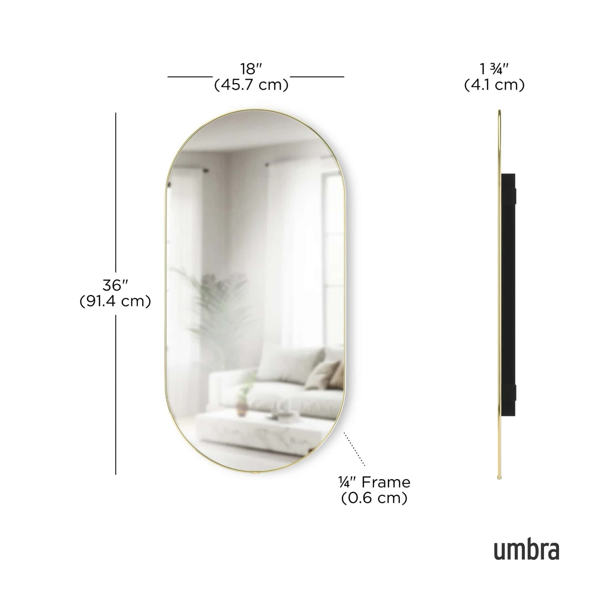 The Hubba Pill Mirror brings a warm, modern touch to your walls while instantly opening up your space. Its elongated pill shape draws the eye and reflects light beautifully, making rooms feel brighter and more spacious. With a thin metallic frame that adds just the right amount of shine, Hubba works perfectly above a console, in a hallway, or as a statement piece in your bedroom. Measures 18 x 36 x 1.6" (45 x 91 x 4 cm). Easy to install and comes with all necessary mounting hardware.